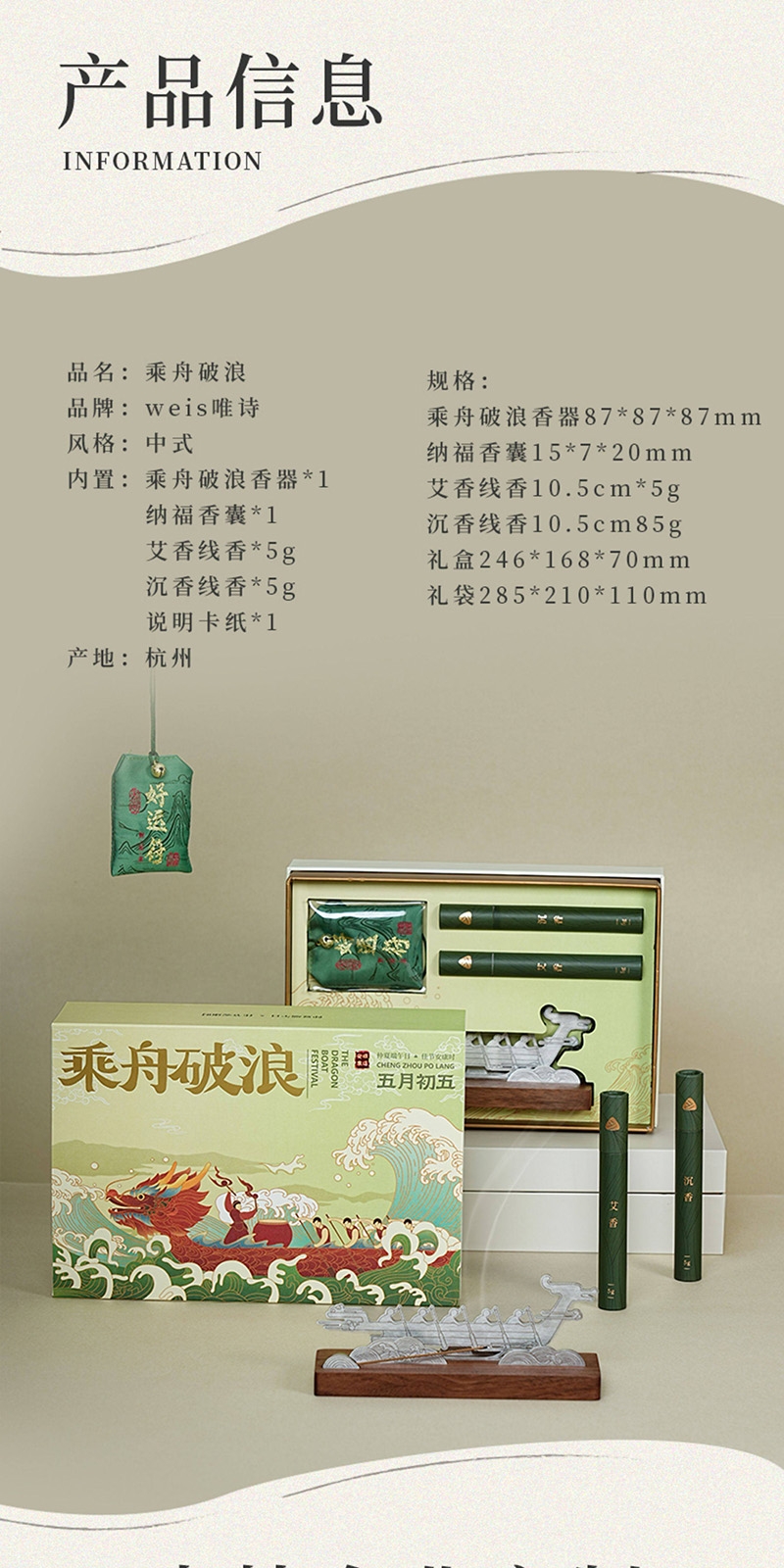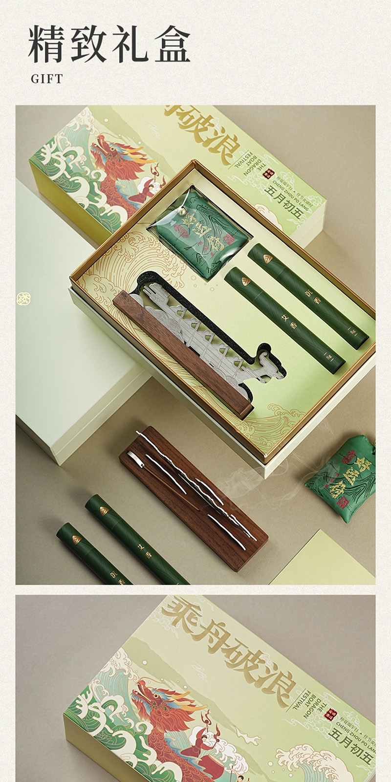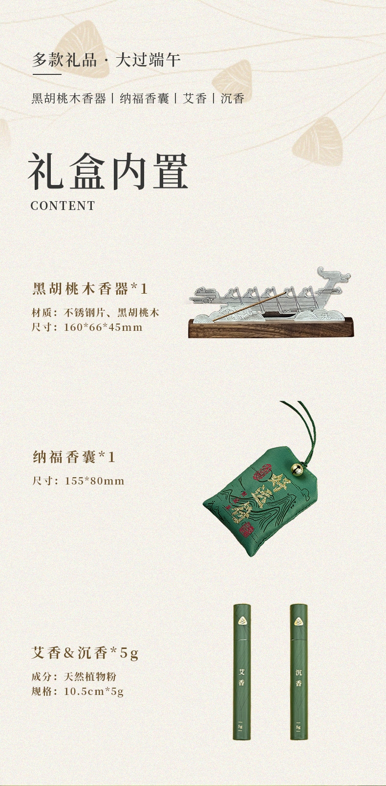 配置:龙舟香器*1 5g装·艾草短线香*1 5g装·沉香短线香*1 好运香包*1 说明卡纸*1