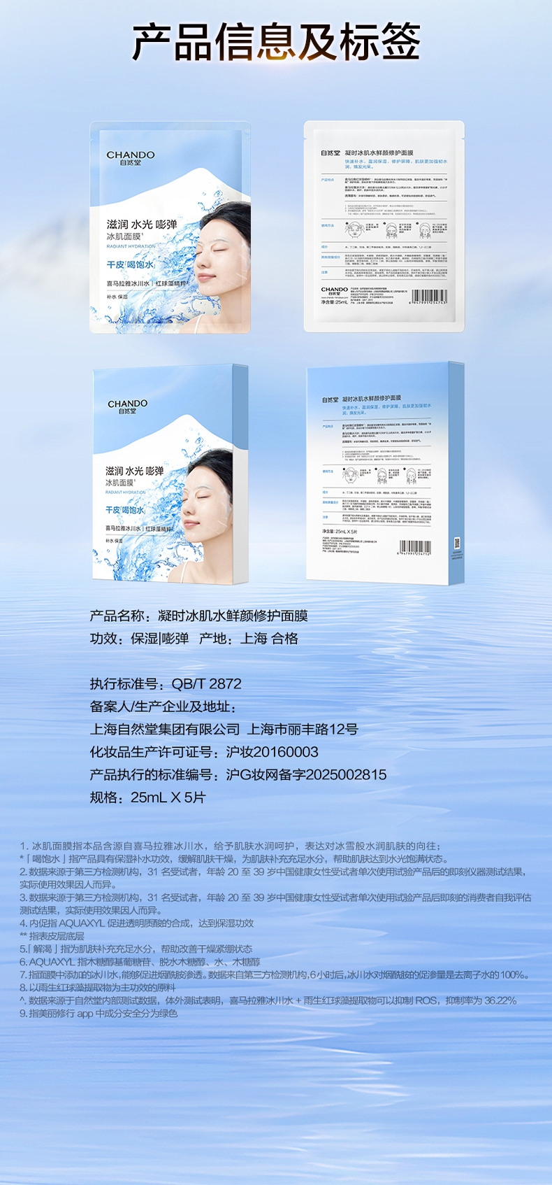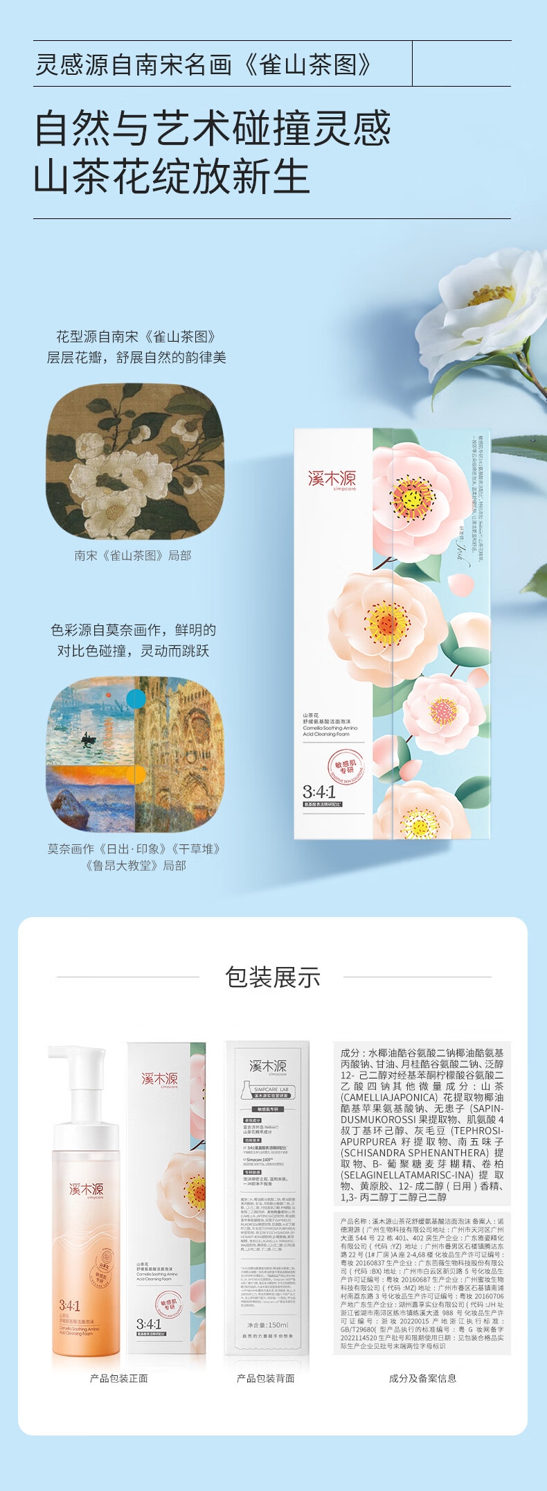 配置清单:溪木源山茶花舒缓氨基酸洁面泡沫150ml 自然堂凝时冰肌水鲜颜修护面膜25ml*20片