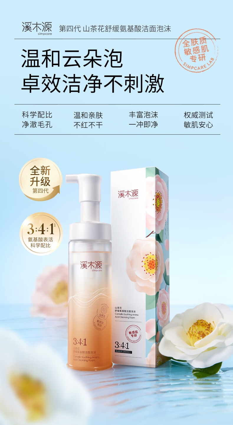 山茶花氨基酸洁面泡沫,温和洁净,舒缓维稳;凝时修护面膜密集补水,焕亮嫩肤,强韧肌底;清洁 + 面膜修护黄金搭配,舒缓换季燥热肌