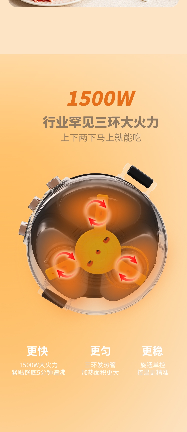 1.三宫格内胆多功能电火锅,干净卫生,一锅多用。;2.单独功率650W,合计功率1950W。;3.可视玻璃盖,清晰看见锅内食物情况,清洗方便。