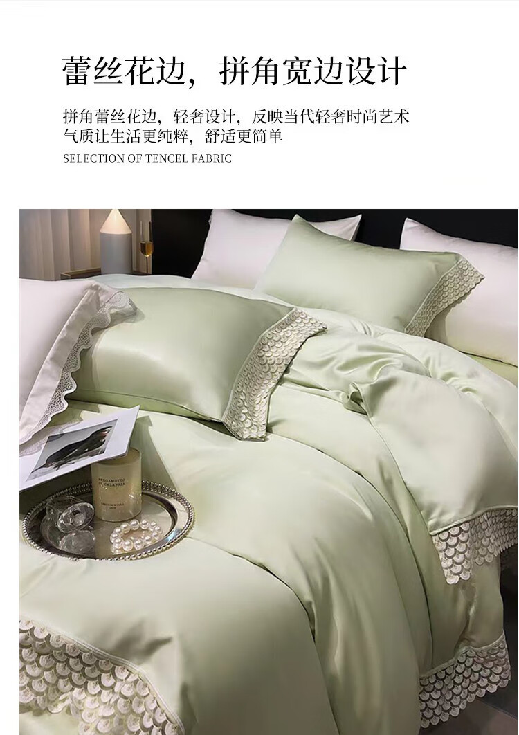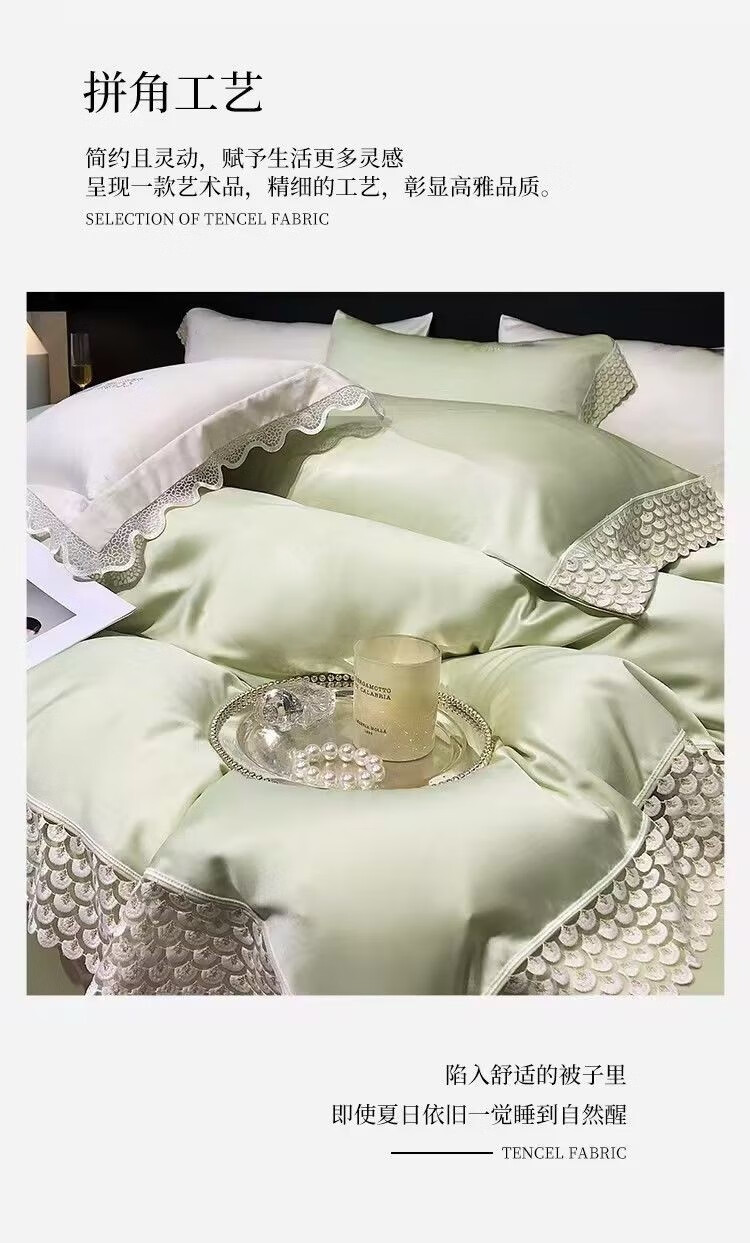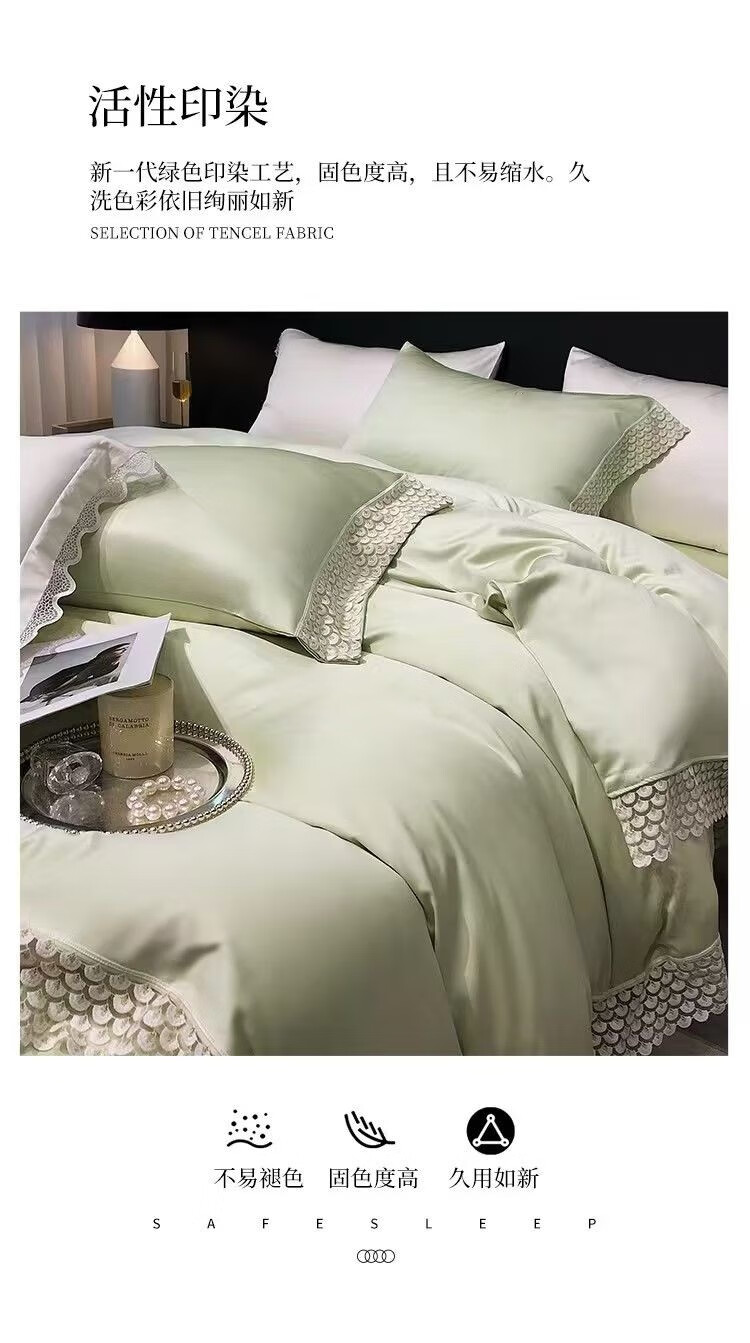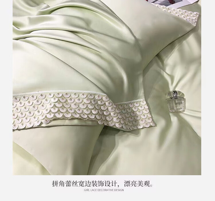 甄选雪莲天丝面料,凉爽透气,亲肤舒适;拼角蕾丝宽边装饰设计,漂亮美观,赋予生活更多美感;新一代活性印染工艺,颜色靓丽,不易起球,不易褪色