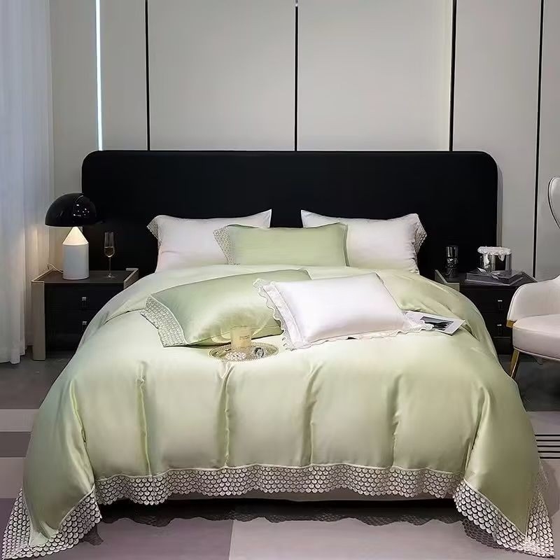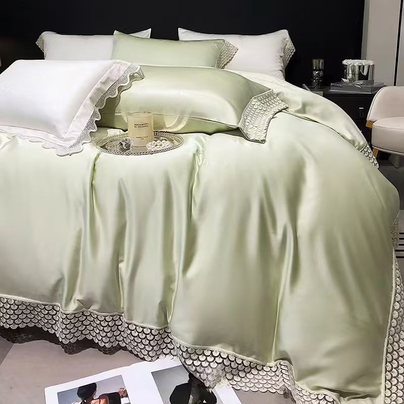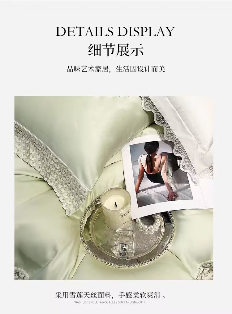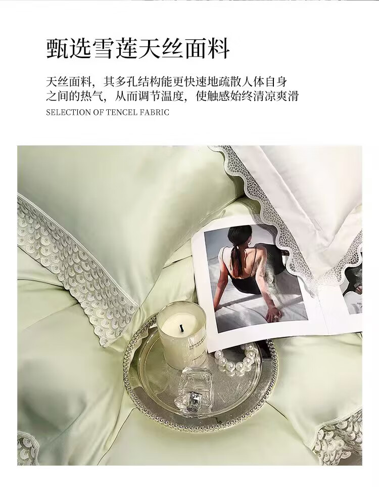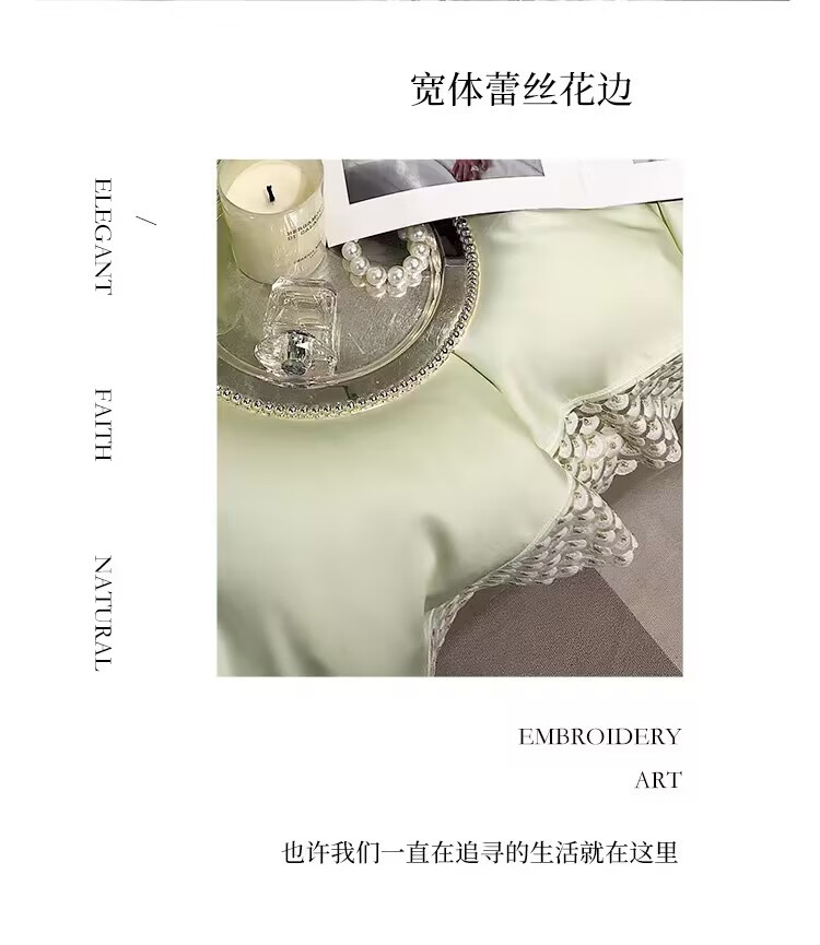 甄选雪莲天丝面料,凉爽透气,亲肤舒适;拼角蕾丝宽边装饰设计,漂亮美观,赋予生活更多美感;新一代活性印染工艺,颜色靓丽,不易起球,不易褪色