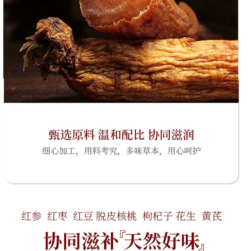 参味回甘 味道鲜美;参味十足 软糯甘甜;现代工艺 自然锁鲜