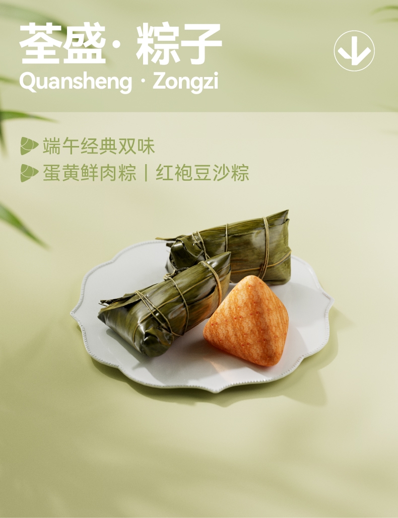荃盛· 粽子:口味:蛋黄鲜肉粽x1、红袍豆沙粽x1 规格:100g/个