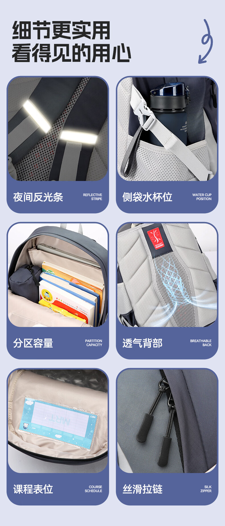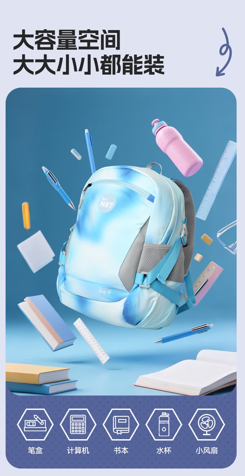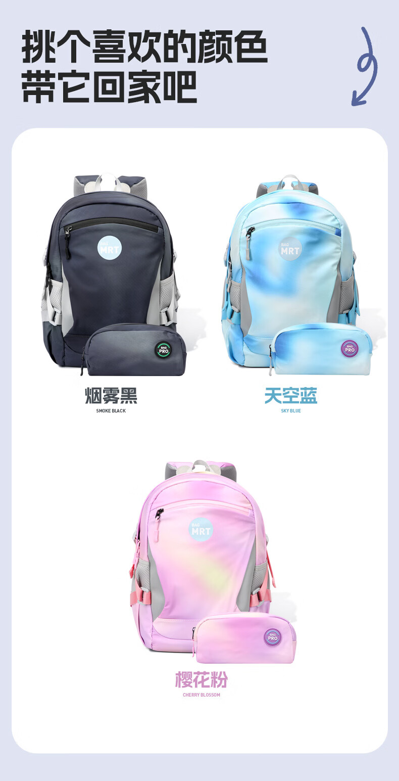 材质耐磨防泼水,撞色设计;背部减负减震器,防滑胸扣;独立侧袋水杯位,多层收纳口袋,夜间反光条
