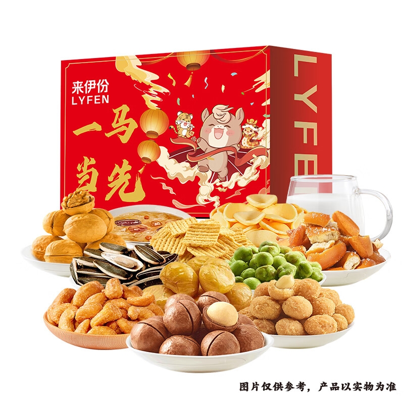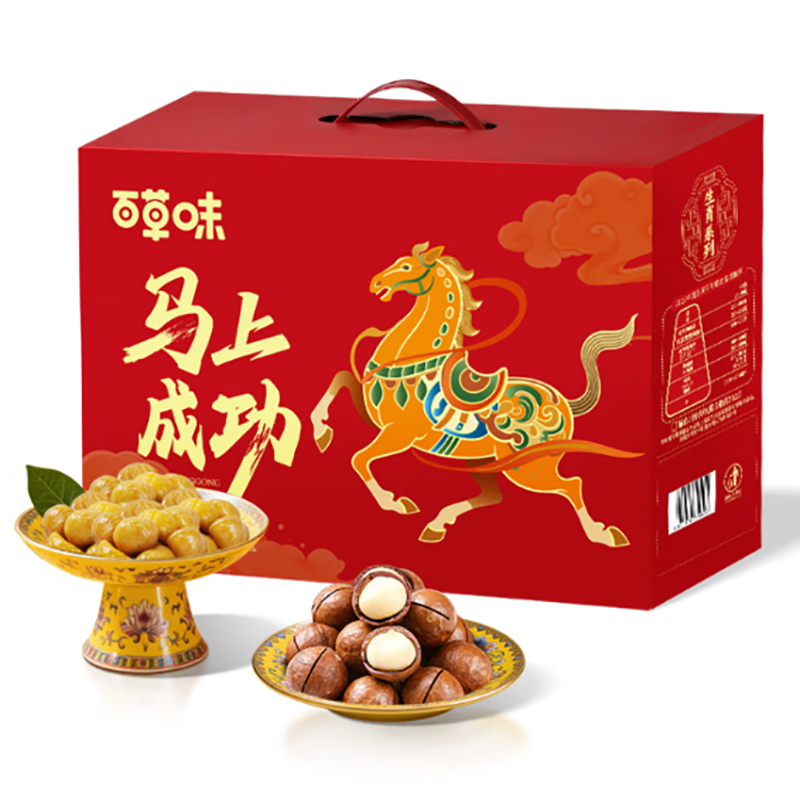 以银卡材质打造,光泽流动如镭射彩虹;融合金马颂福、吉祥如意传统寓意;内配5坚果+3果干