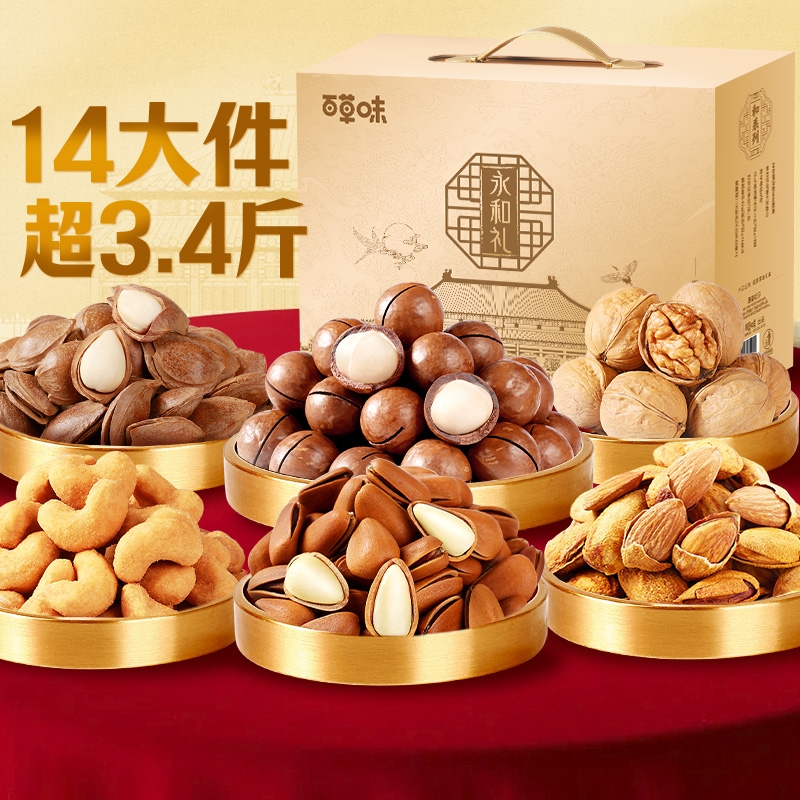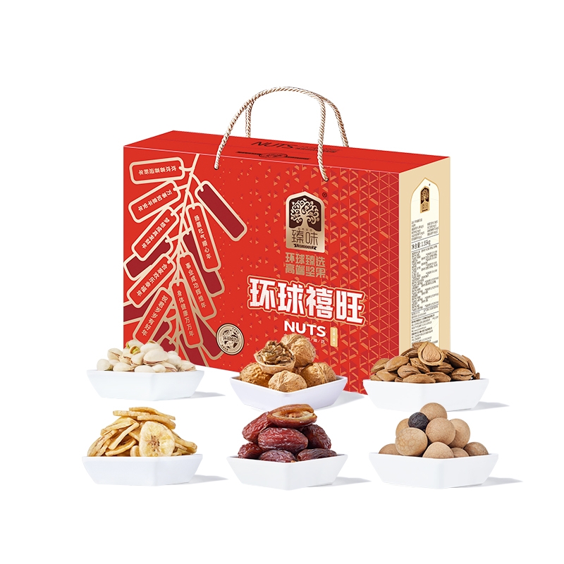 如水坚果全球原产地直采,只挑选高等级高品质原材料.;5种坚果炒货+2种蜜饯 果干+1种坚果酥糖;“海棠花”+“如意”形 开窗设计,融入东方传统采用