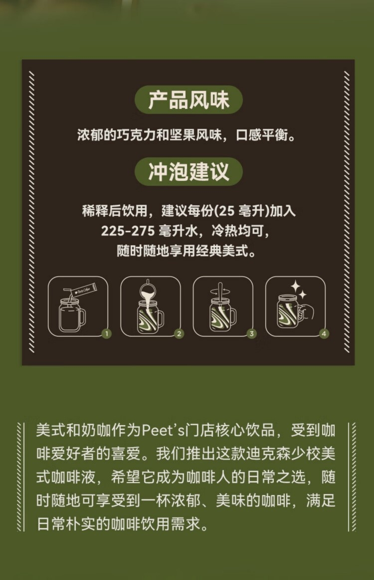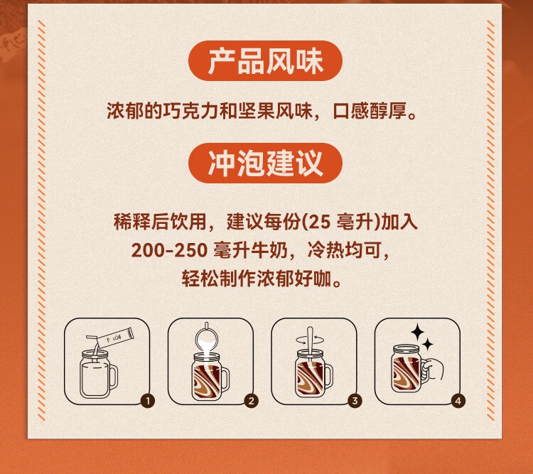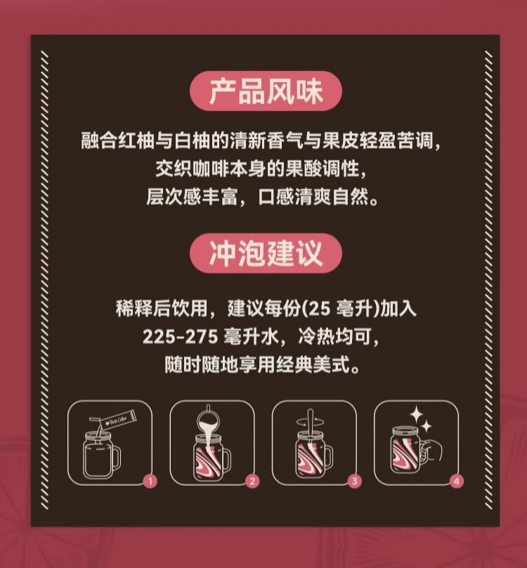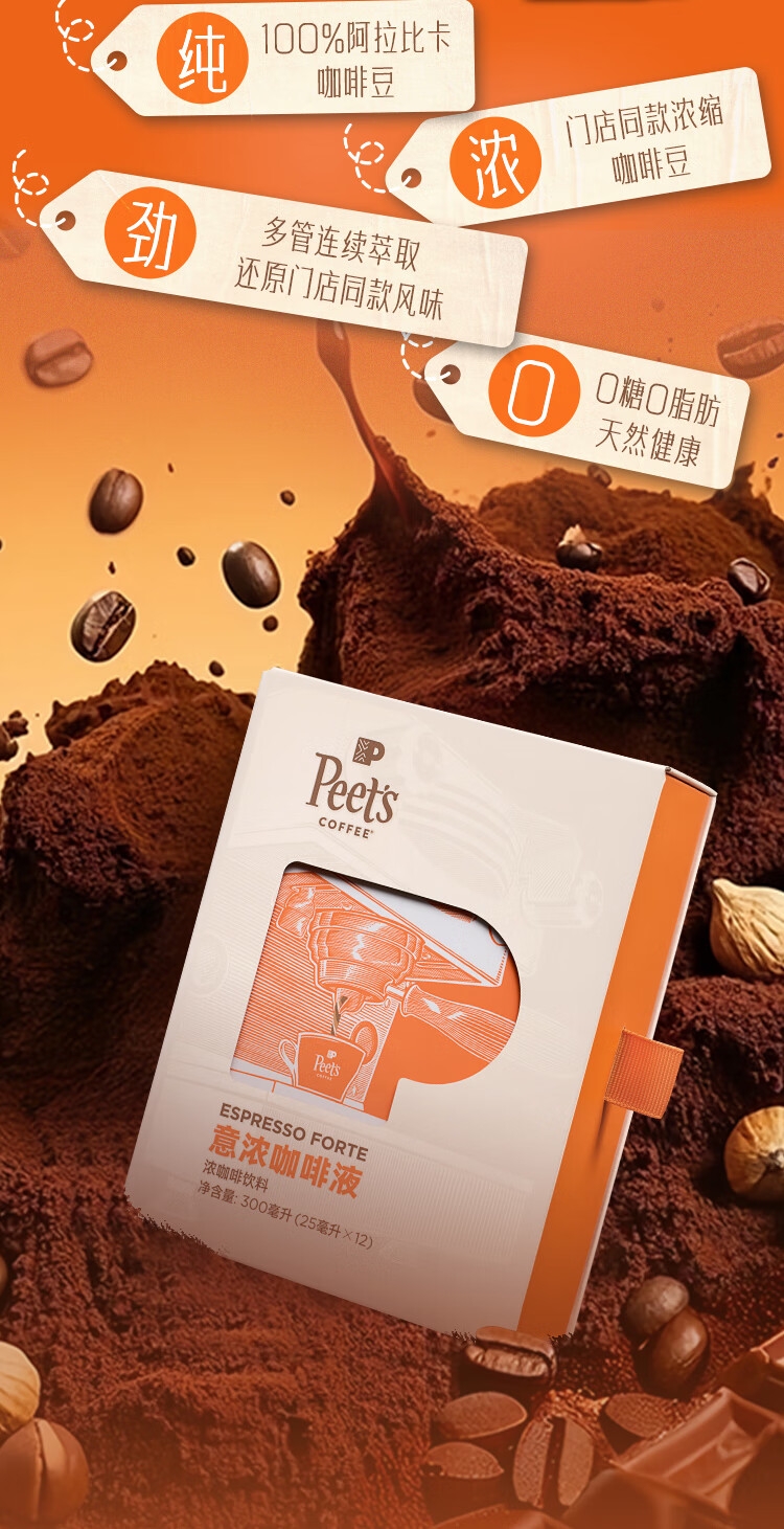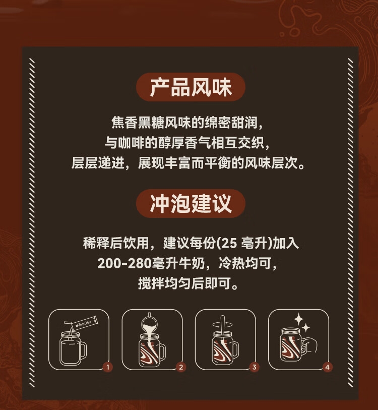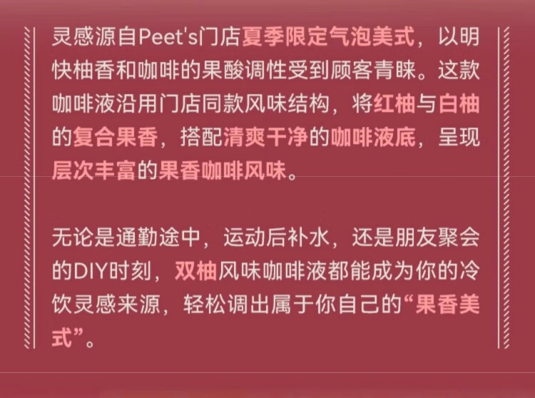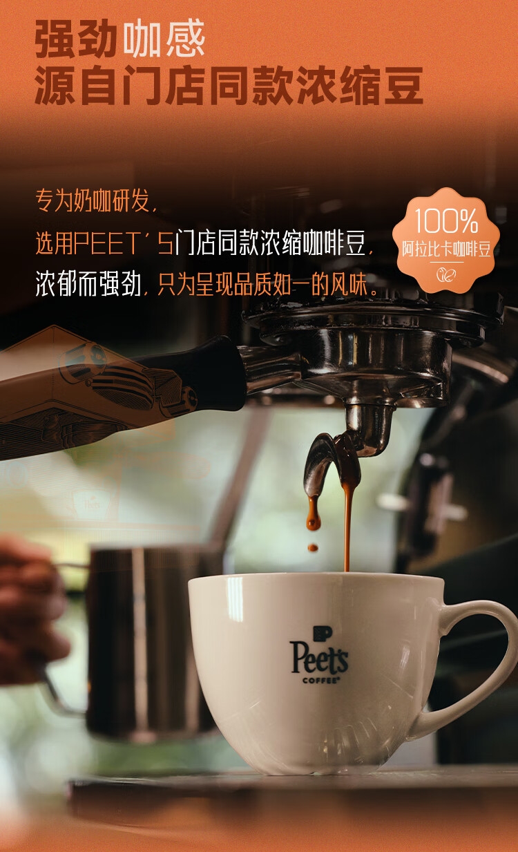店用同款浓缩咖啡豆 ,甄选高品质阿拉比卡豆;手工深烘焙技术, 展现醇厚, 平衡咖啡风味;多管连续萃取工艺 ,精准把控萃取温度与时间;先进高温杀菌和无菌罐装工艺,常温保鲜长达12个月
