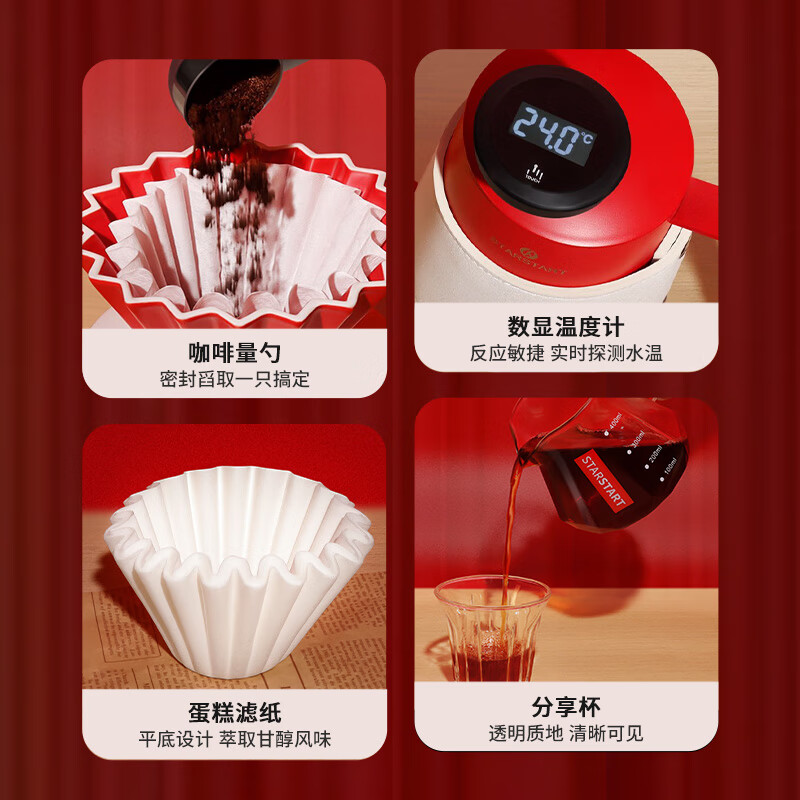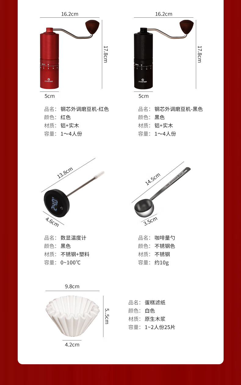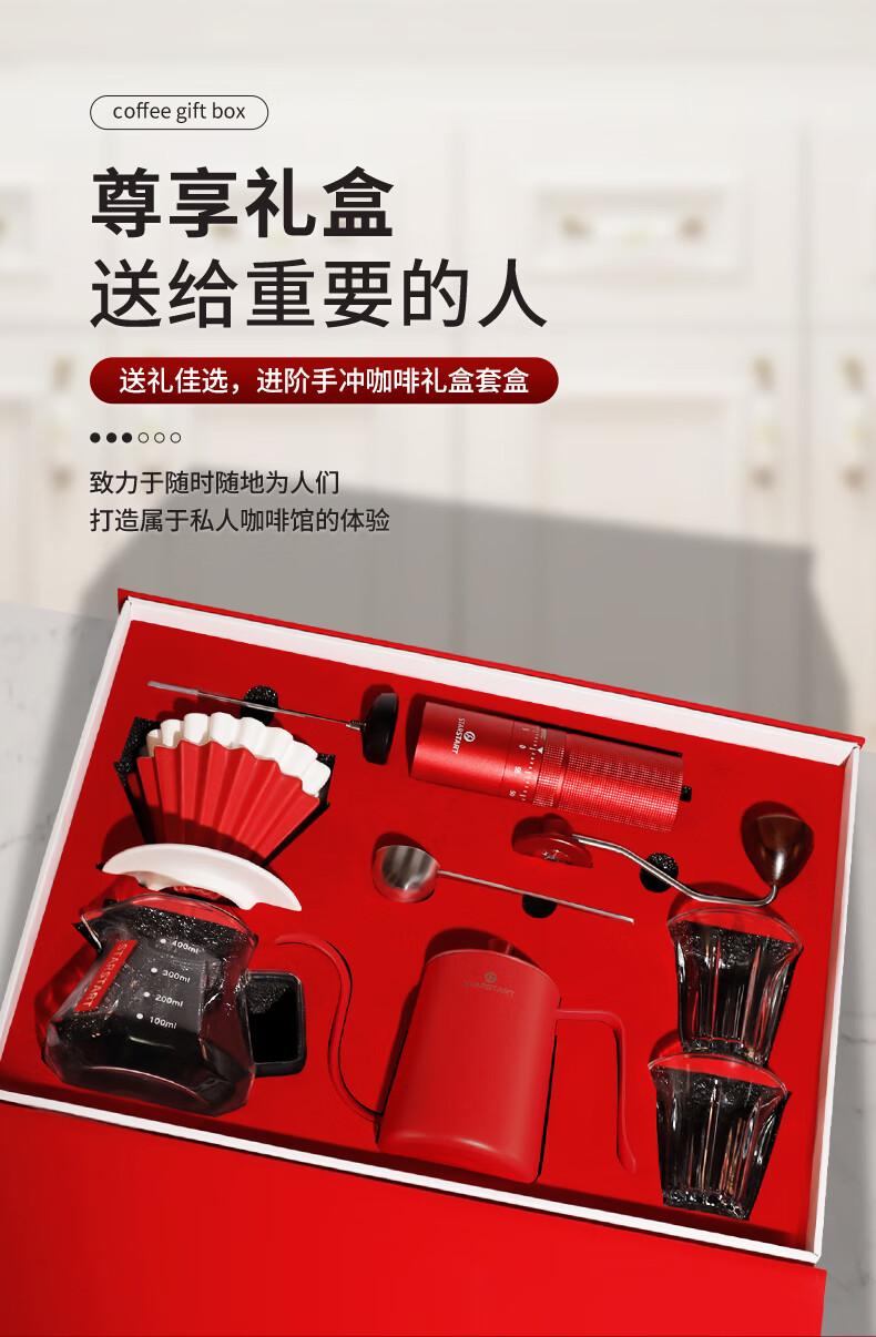 配置清单:滤杯*1,玻璃壶*1,手冲壶*1,磨豆机*1,温度计*1,不锈钢量勺*1,莱特杯*2