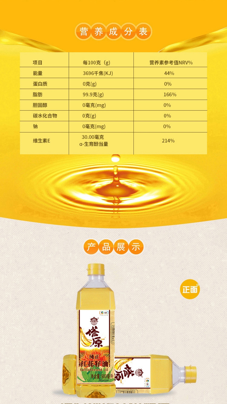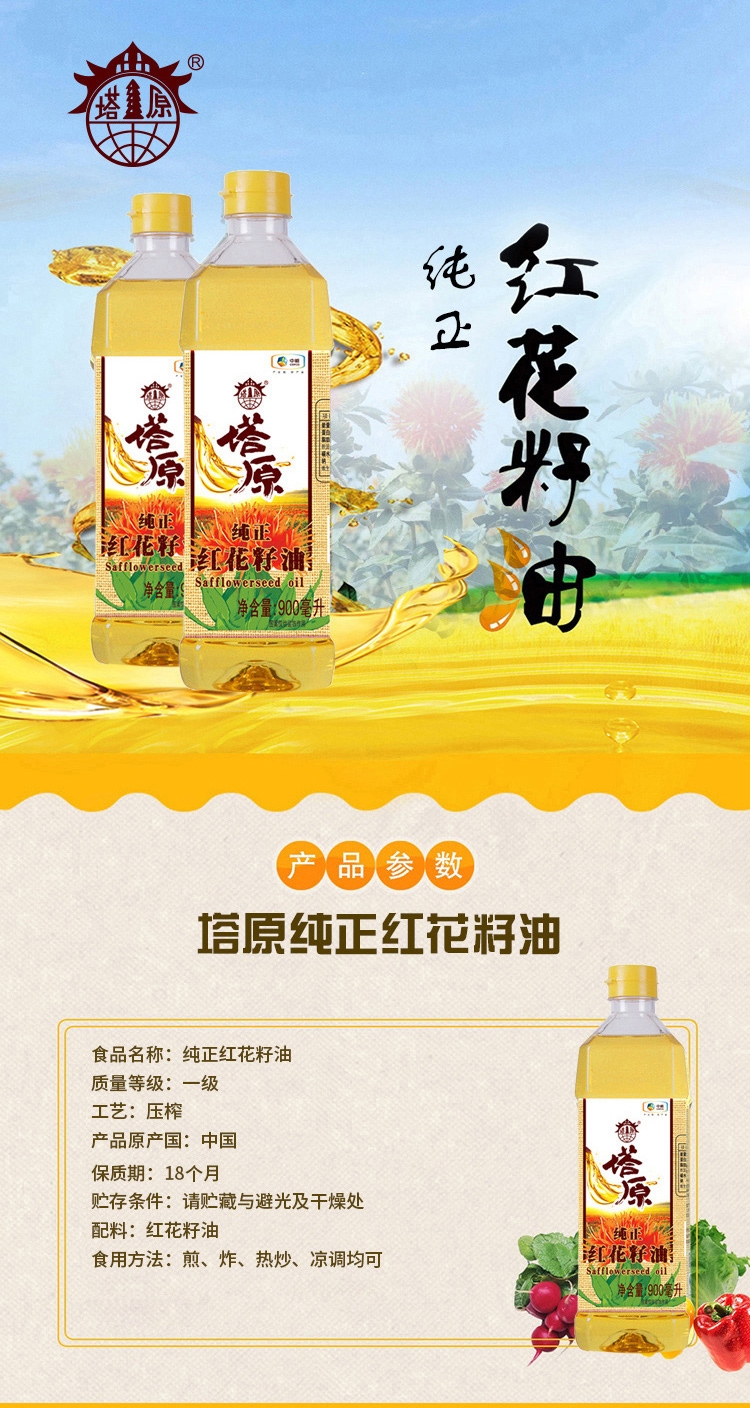 精选优质的红花籽为原料;蕴含丰富的人体必需不饱和脂肪酸;采用物理压榨工艺,高油点,少油烟
