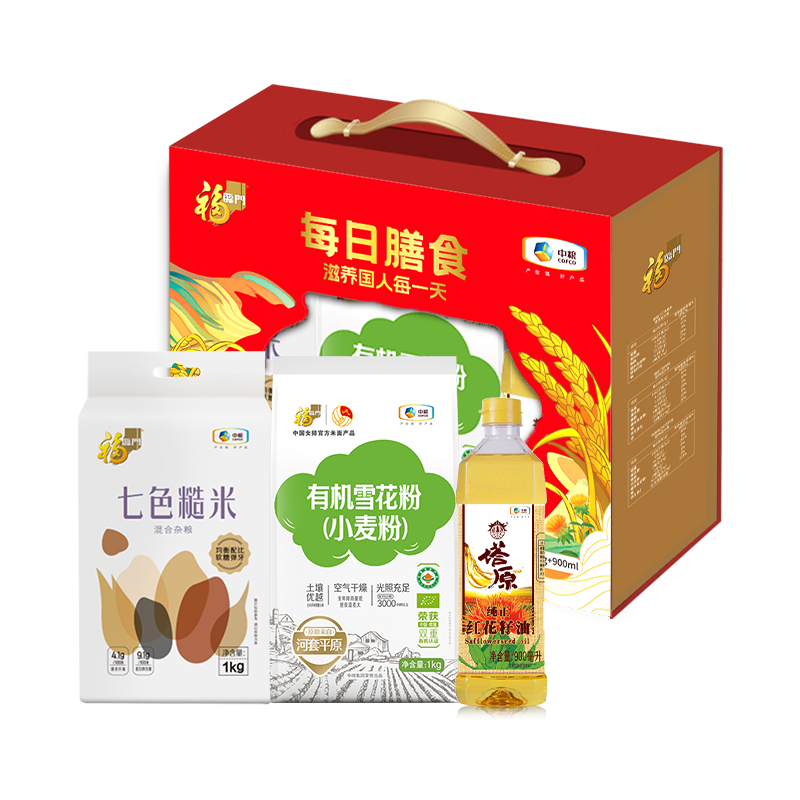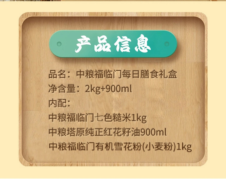 内配:净含量:2kg+900ml 内配: 中粮塔原纯红花籽油900ml 中粮福临门七色糙米1kg 中粮福临门有机雪花小麦粉1kg