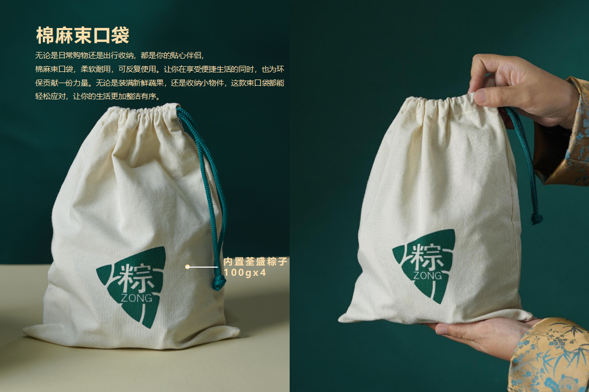 材质选择既注重实用性,又兼顾美观和文化内涵;粽叶新鲜,糯米浓香,饭粒松软,既有米香,又清爽可口;棉麻束口袋,柔软耐用,可反复使用