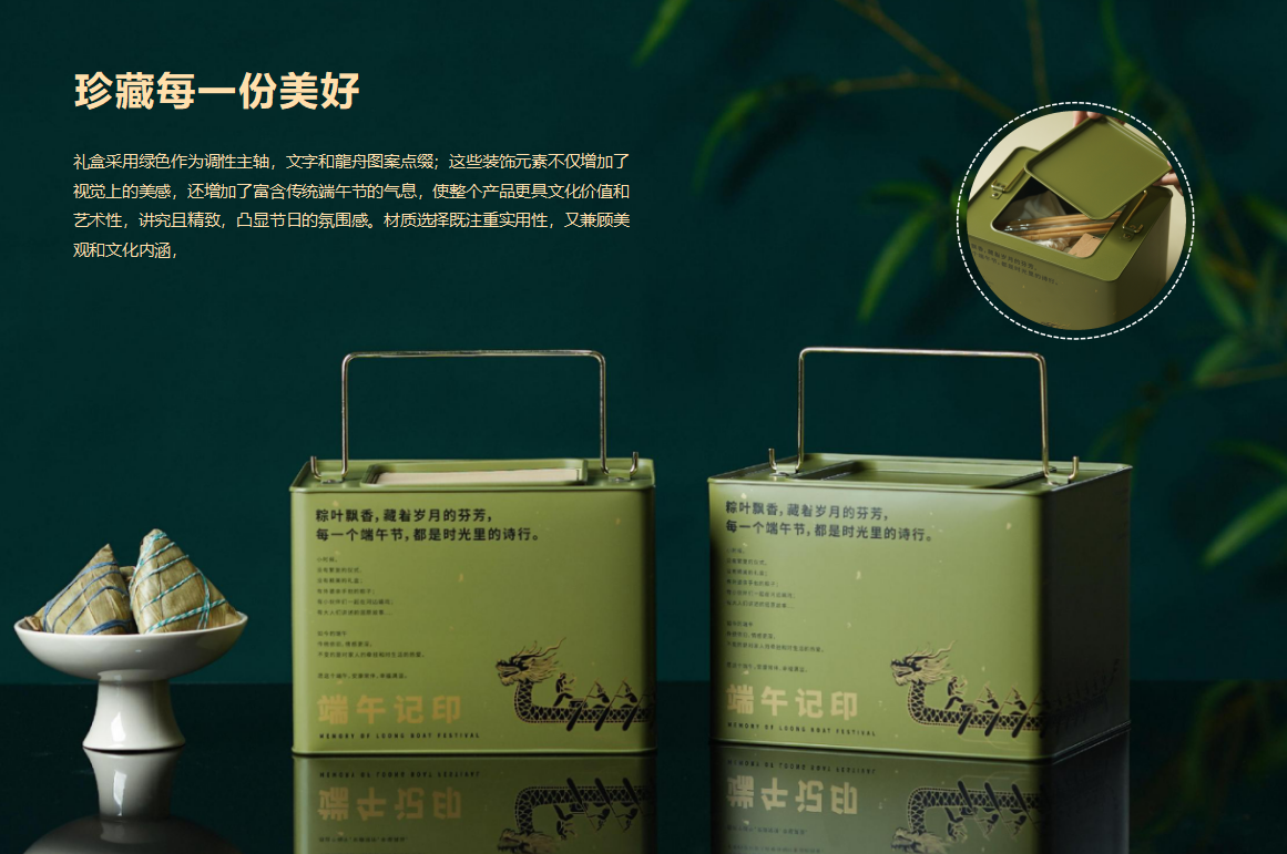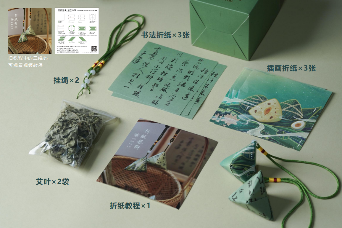 配置清单:铁盒、棉麻束口袋、筷子x2双、玻璃竹影杯x1,折纸香囊x2、 荃盛粽子100gx4(经典鲜肉粽x1,飘香桂花粽x1,低糖青稞蛋黄肉粽x1,低糖青稞豆沙粽子x1)