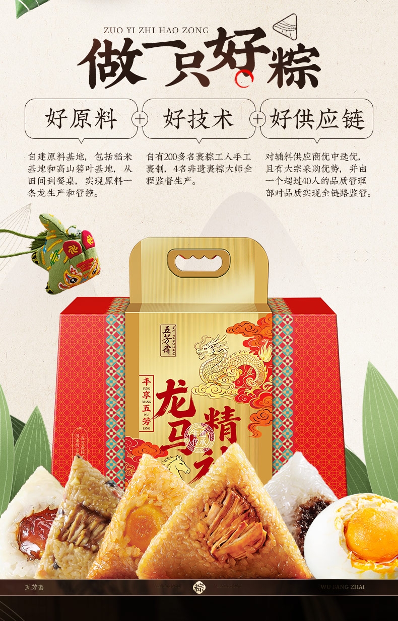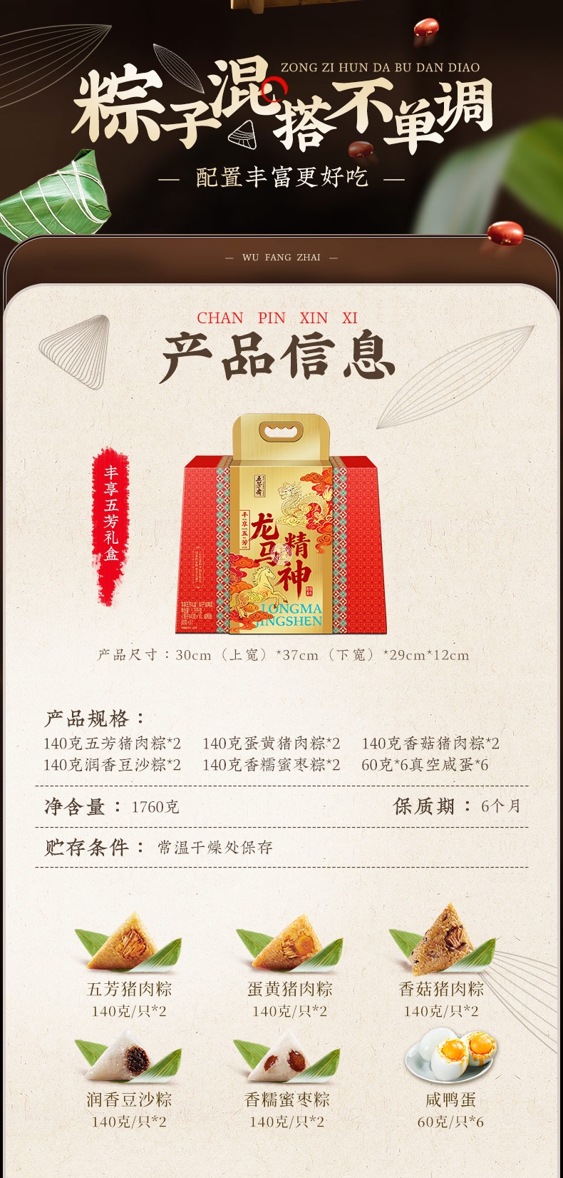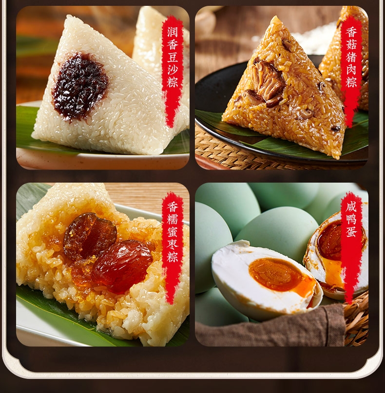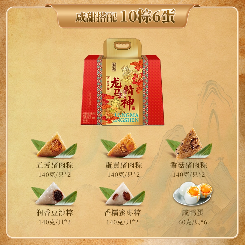 配置清单:五芳猪肉粽140g/袋*2 蛋黄猪肉粽140g/袋*2 香菇猪肉粽140g/袋*2 润香豆沙粽140g/袋*2 香糯蜜枣粽140g/袋*2 咸鸭蛋60g*6/盒*1