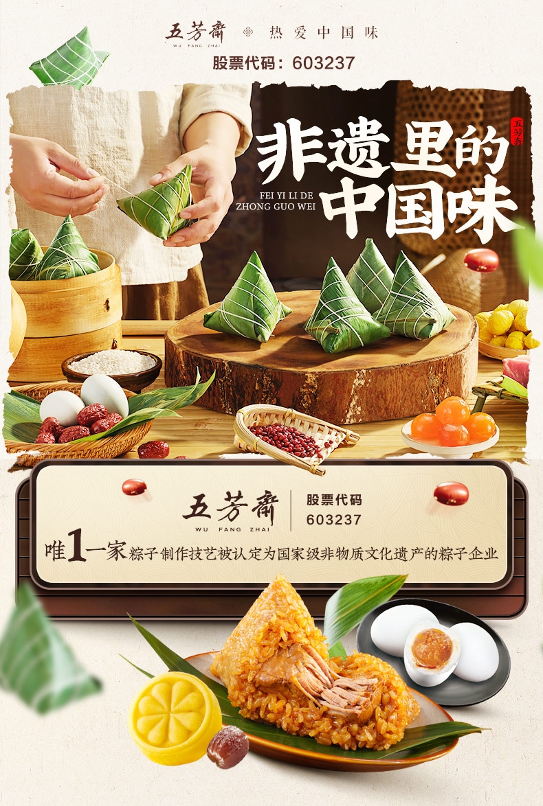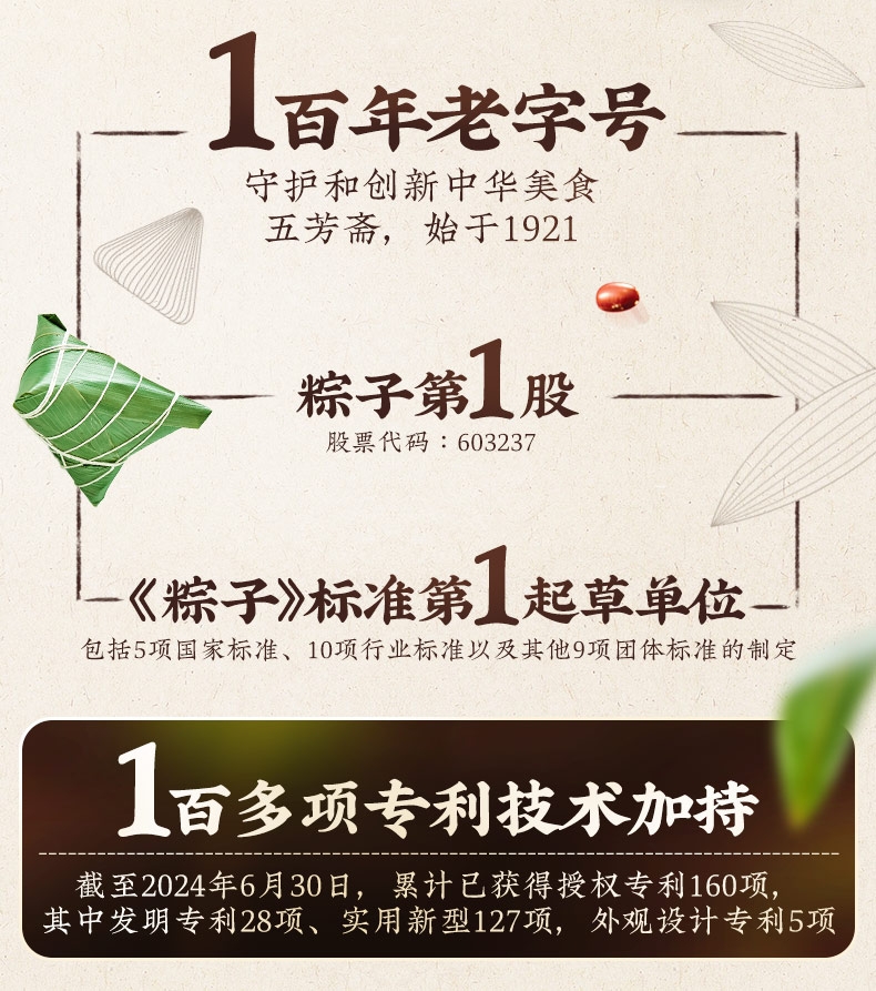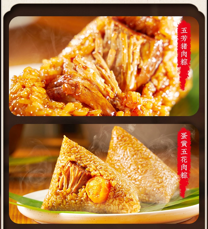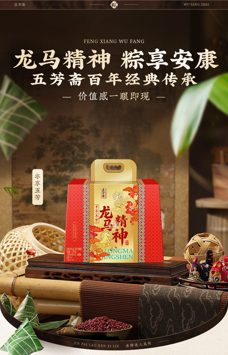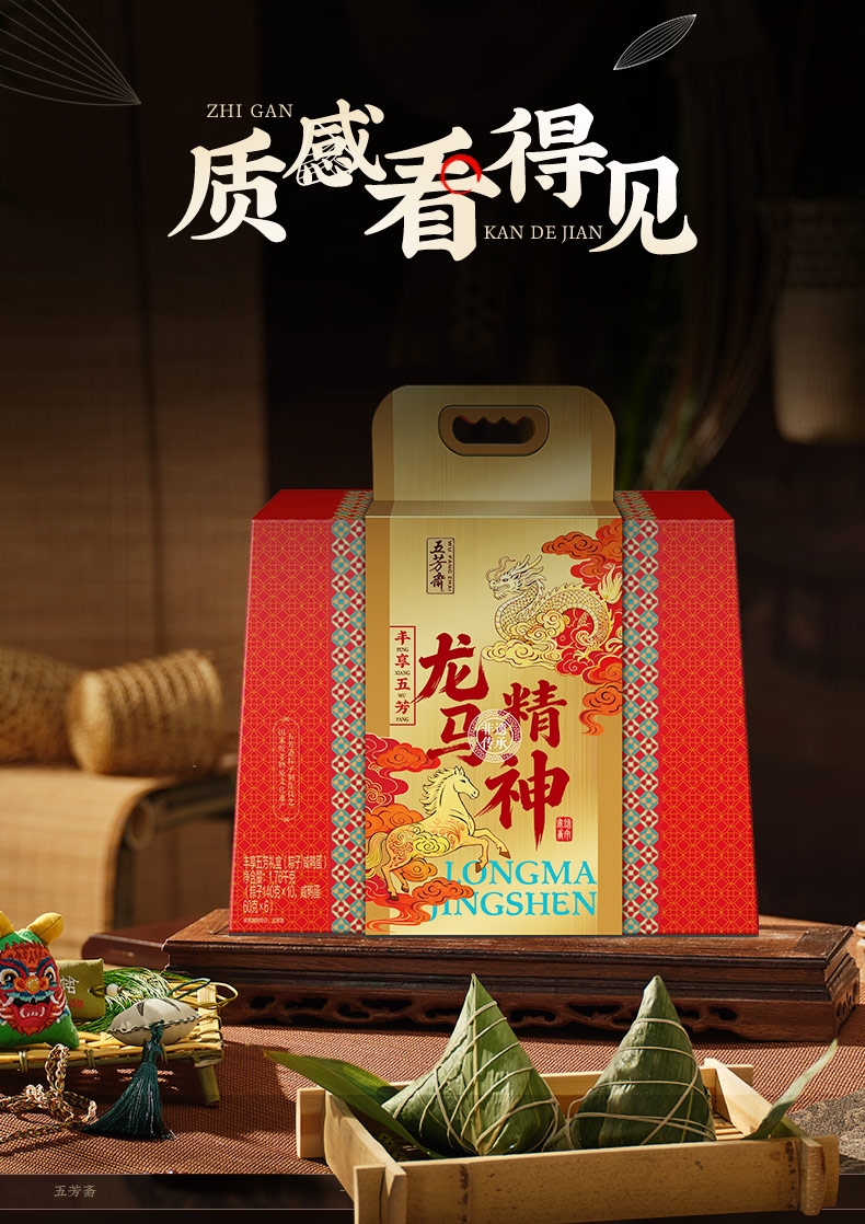 配置清单:五芳猪肉粽140g/袋*2 蛋黄猪肉粽140g/袋*2 香菇猪肉粽140g/袋*2 润香豆沙粽140g/袋*2 香糯蜜枣粽140g/袋*2 咸鸭蛋60g*6/盒*1
