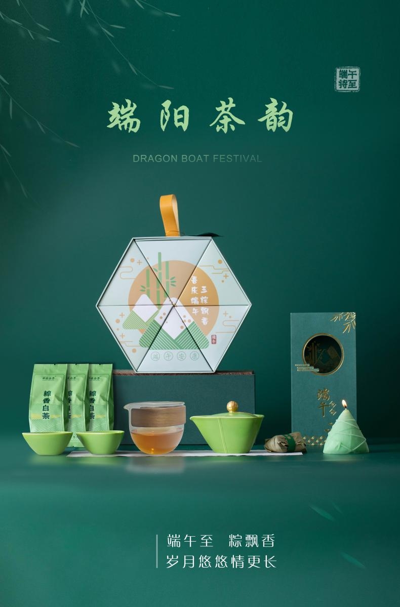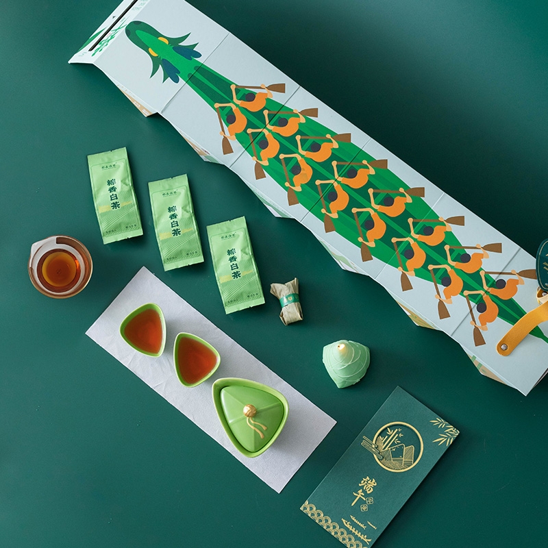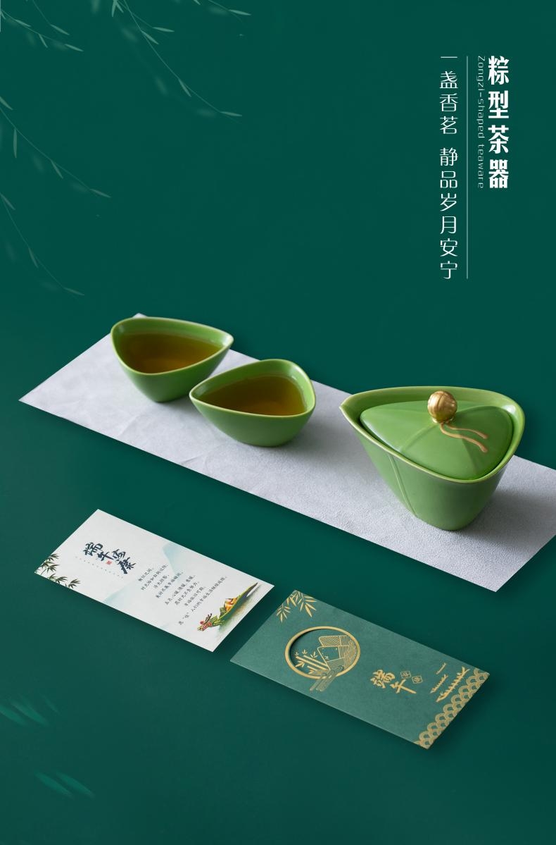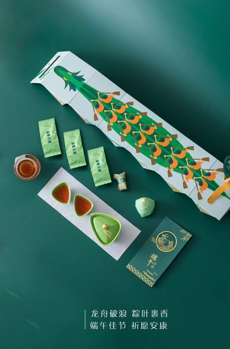 新颖别致的粽型茶壶茶杯,品茶时感受端午文化魅力;五芳斋肉粽软糯裹香,红太阳咸鸭蛋流油起沙;六边形礼盒,融合端午元素与清新配色,尽显茶礼美学