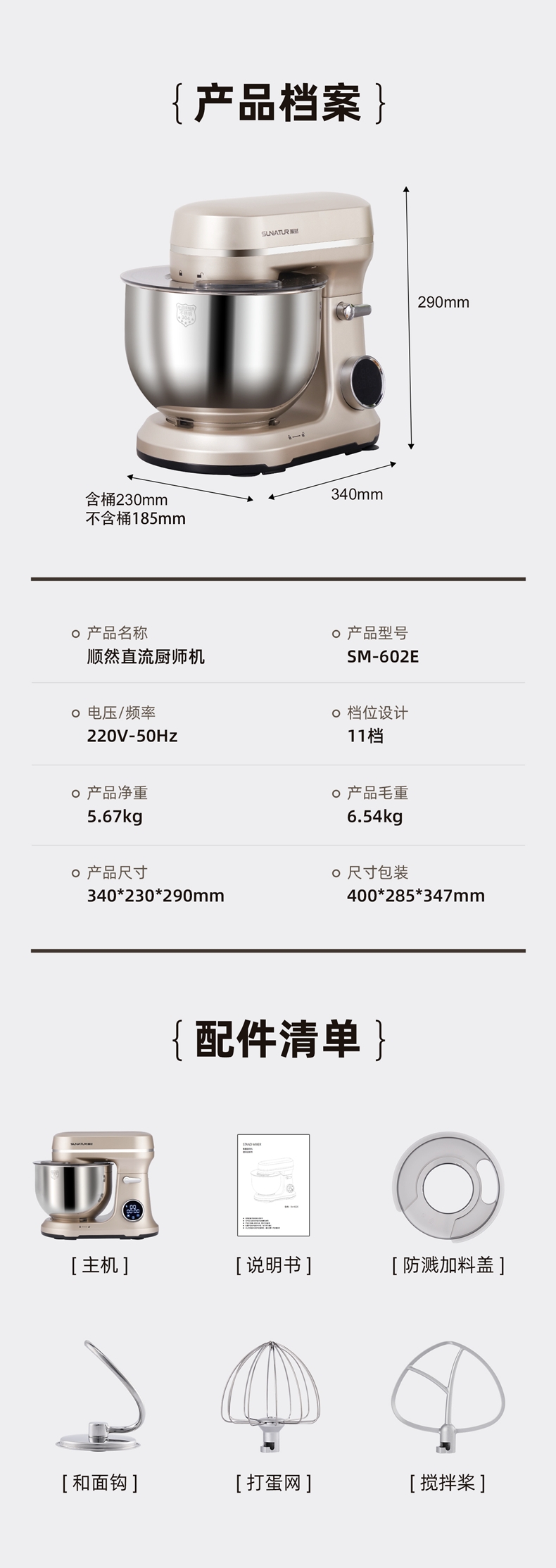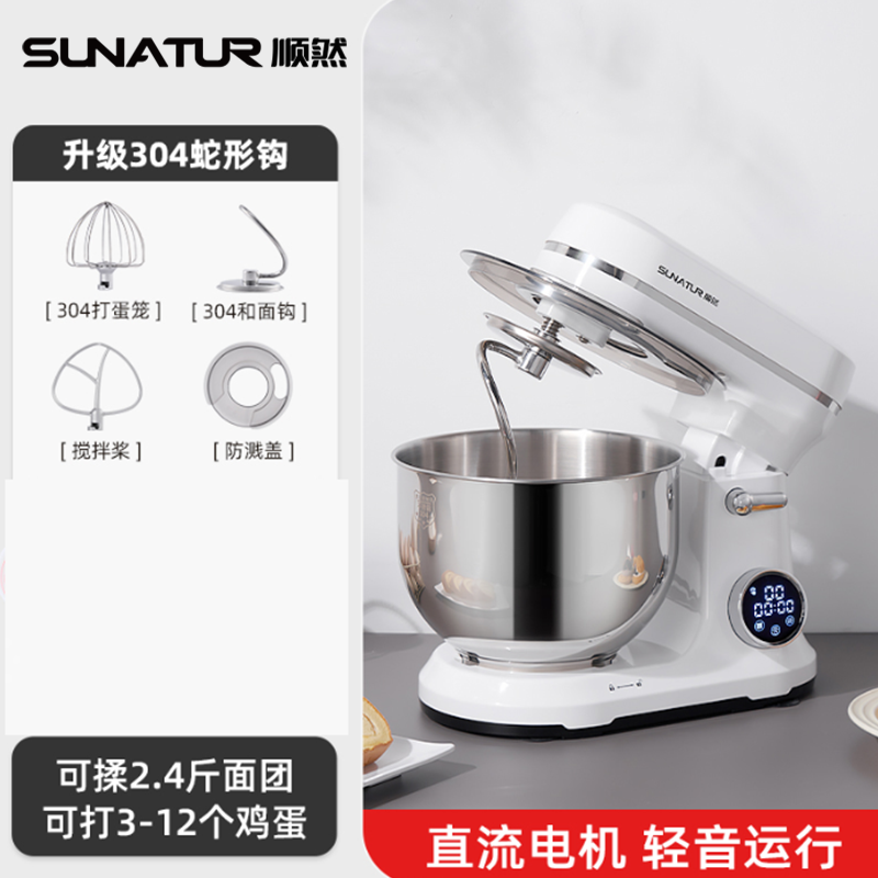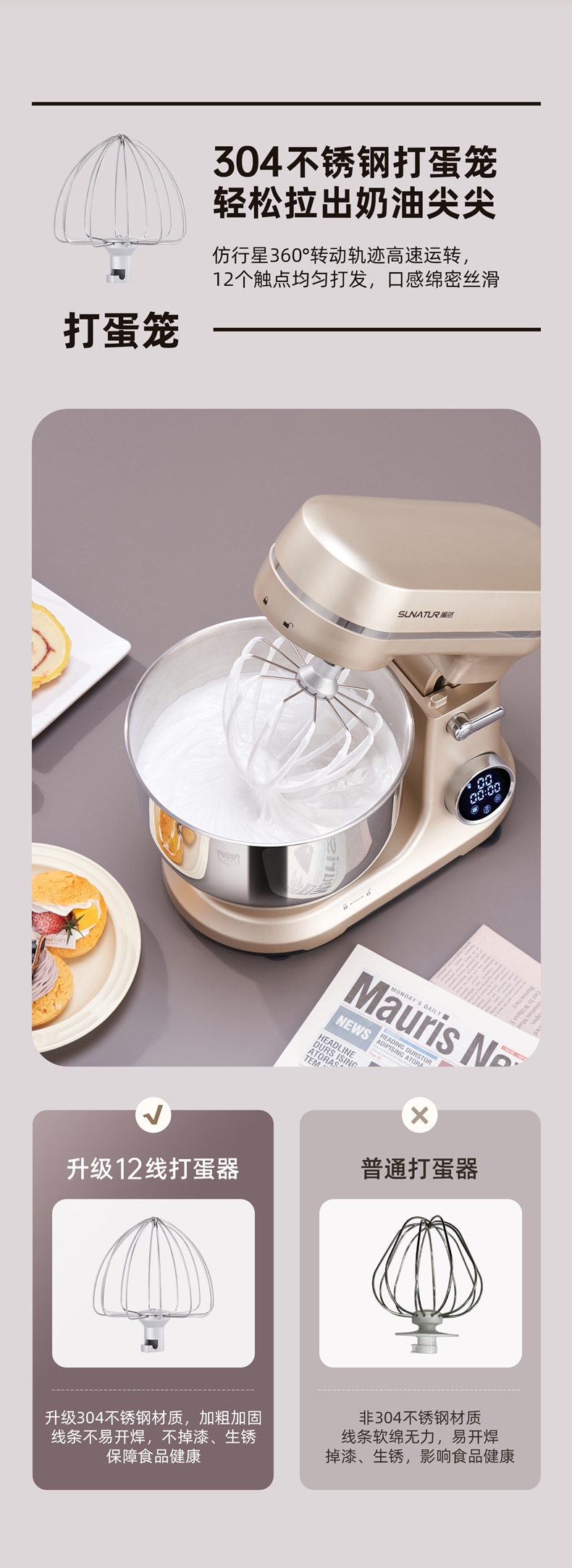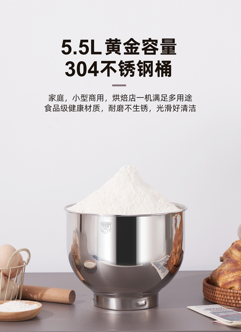 配置清单:800w直流电机高效轻音运行,成团快,轻松出手套膜 5.5升黄金家用容量,可打发3-10个鸡蛋,100-1000ml奶油,和2.4斤面团 11档精准调速,满足不同需求,30分钟定时免看管 3大预设功能,和面搅拌打发 小白也能轻松使用 金属传动齿轮,高强度高精度使用寿命长