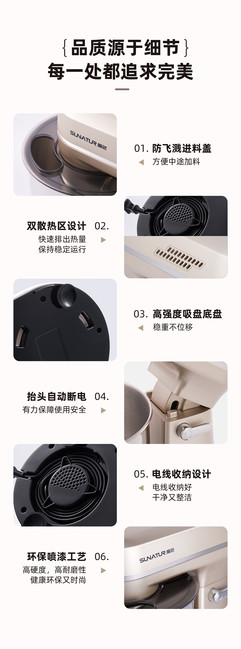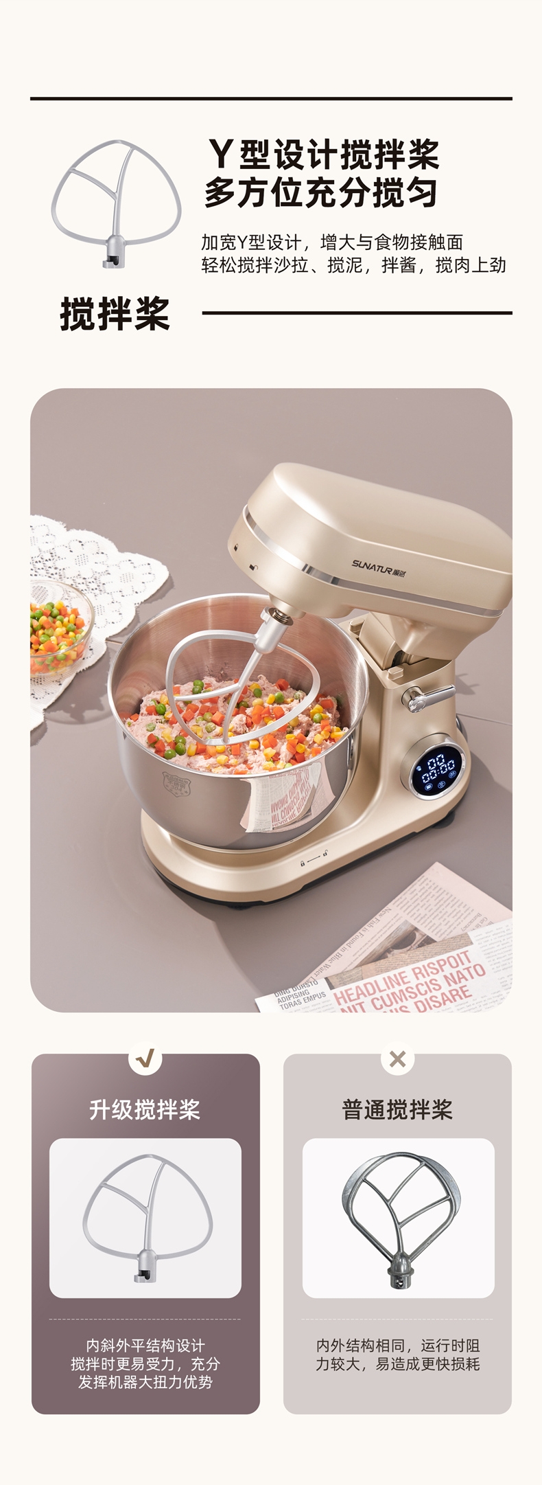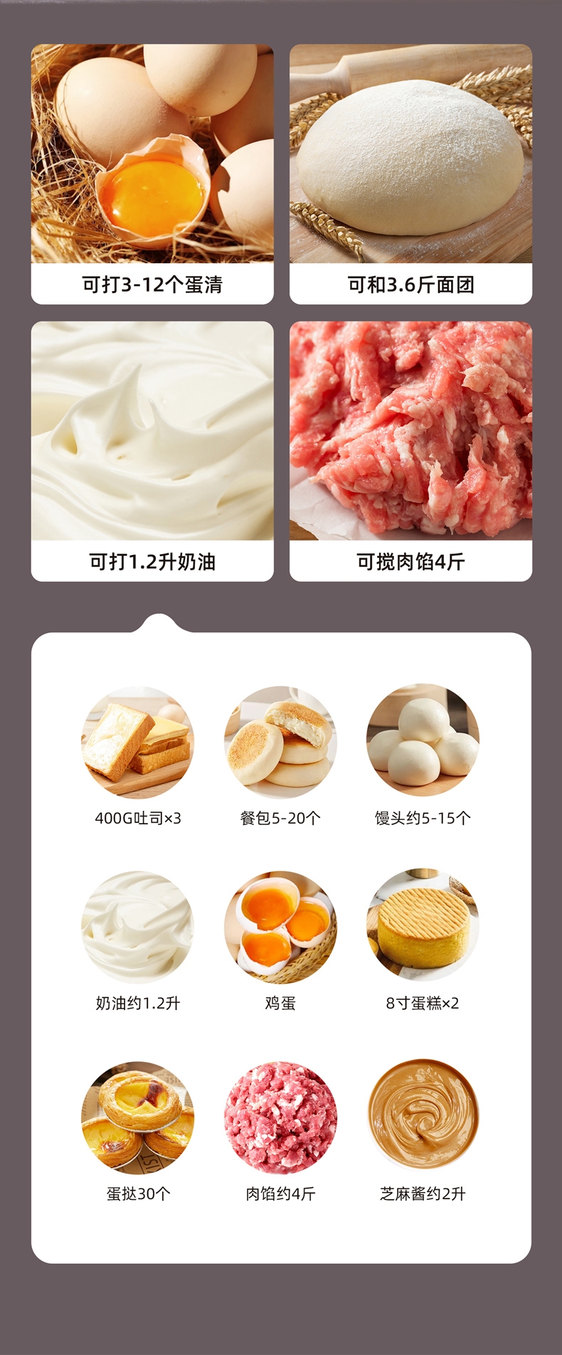 配置清单:800w直流电机高效轻音运行,成团快,轻松出手套膜 5.5升黄金家用容量,可打发3-10个鸡蛋,100-1000ml奶油,和2.4斤面团 11档精准调速,满足不同需求,30分钟定时免看管 3大预设功能,和面搅拌打发 小白也能轻松使用 金属传动齿轮,高强度高精度使用寿命长
