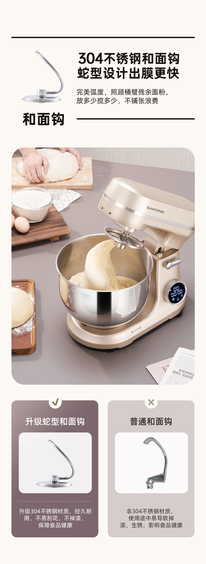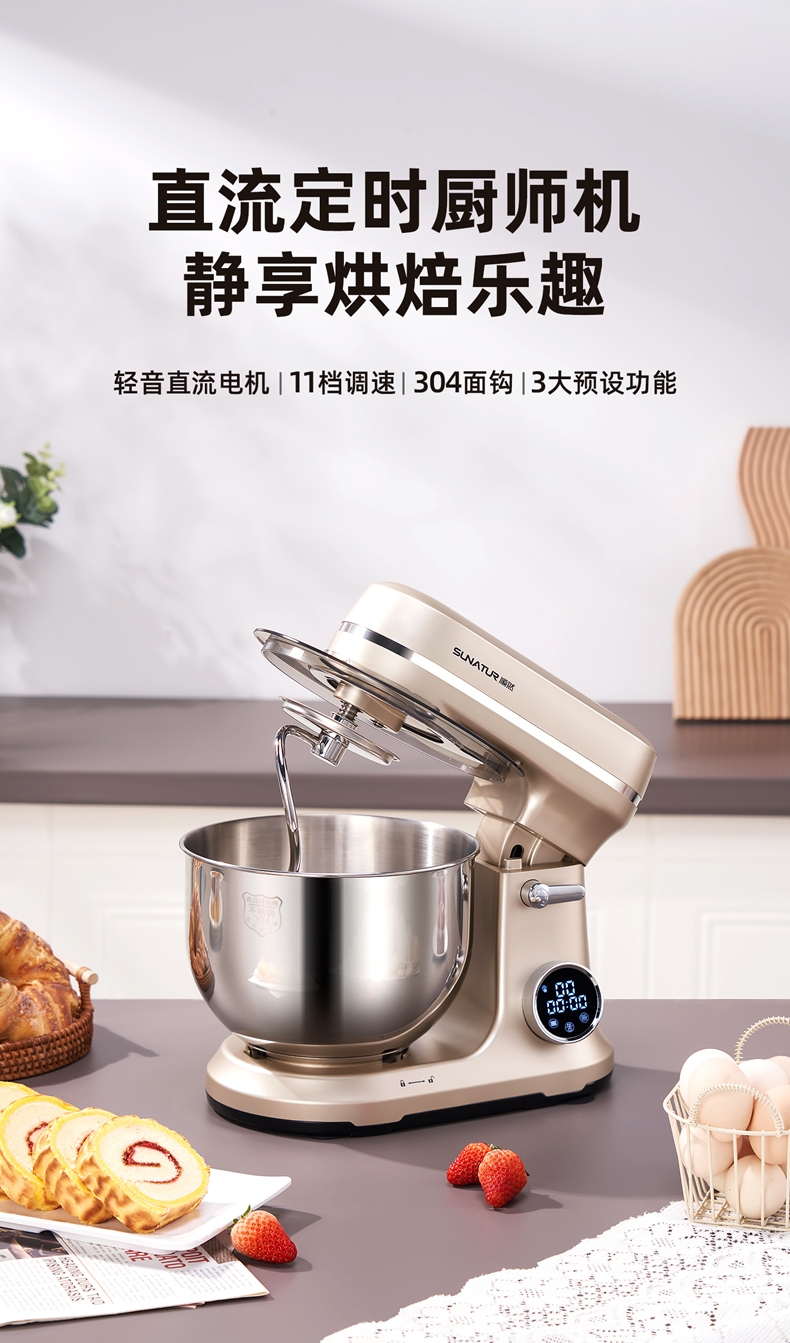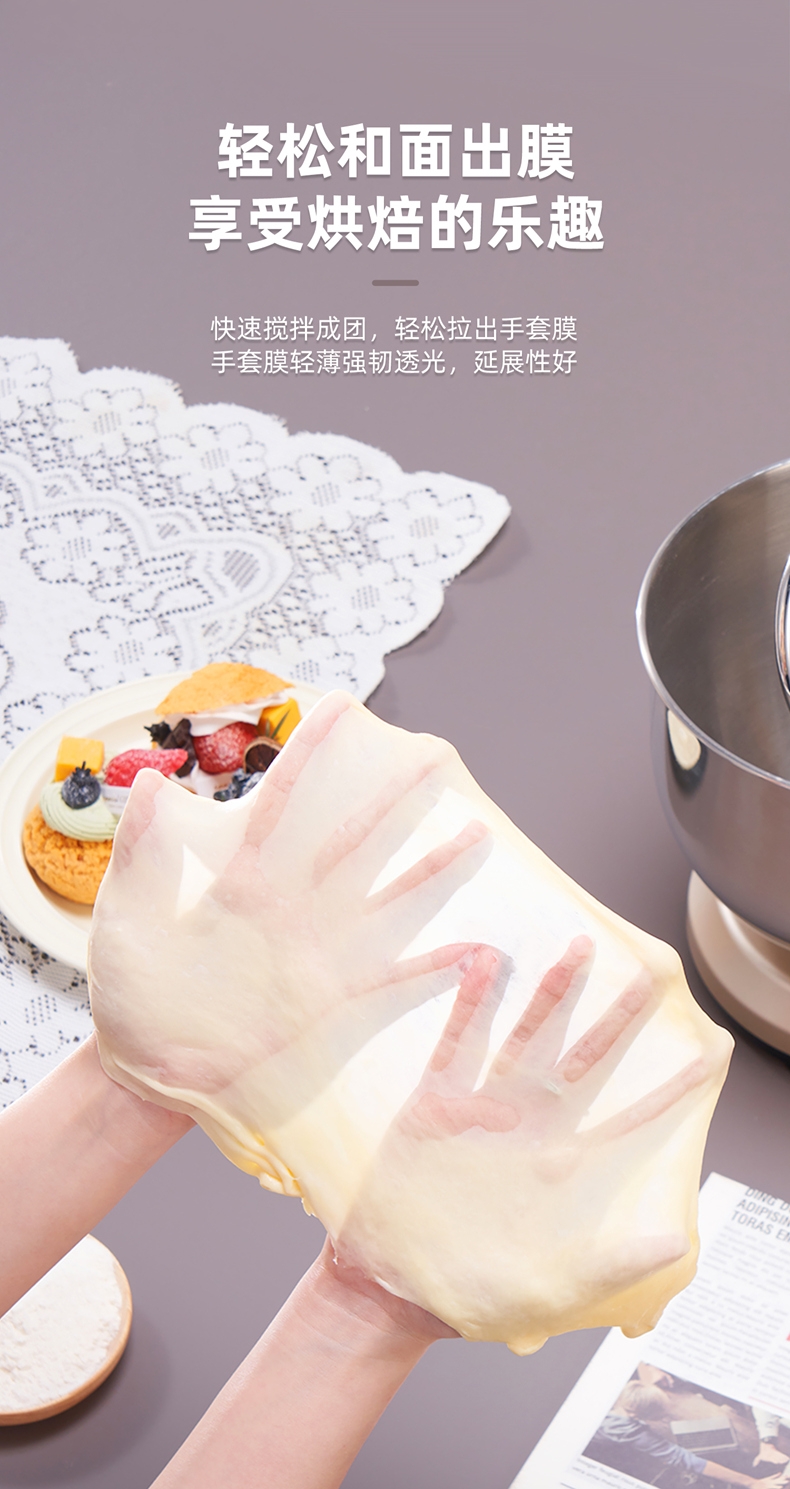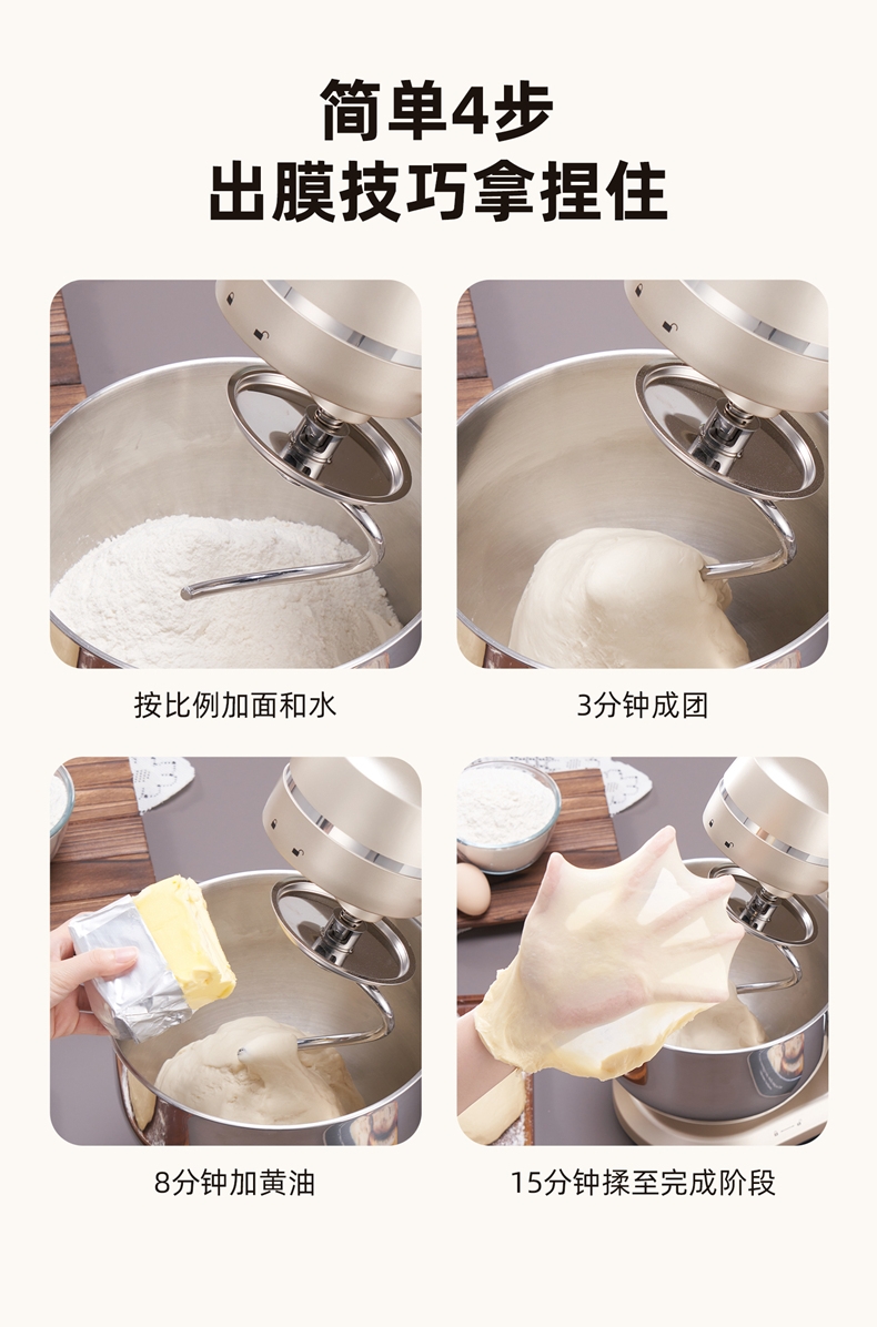 800w直流电机高效轻音运行,成团快,轻松出手套膜;11档精准调速,满足不同需求,30分钟定时免看管;3大预设功能,和面搅拌打发 金属传动齿轮高强度