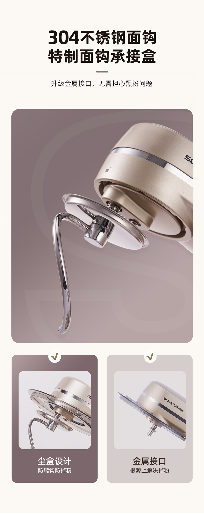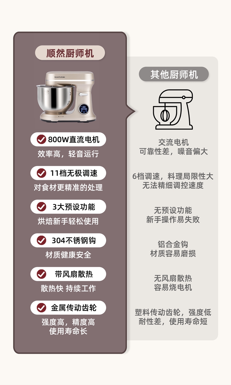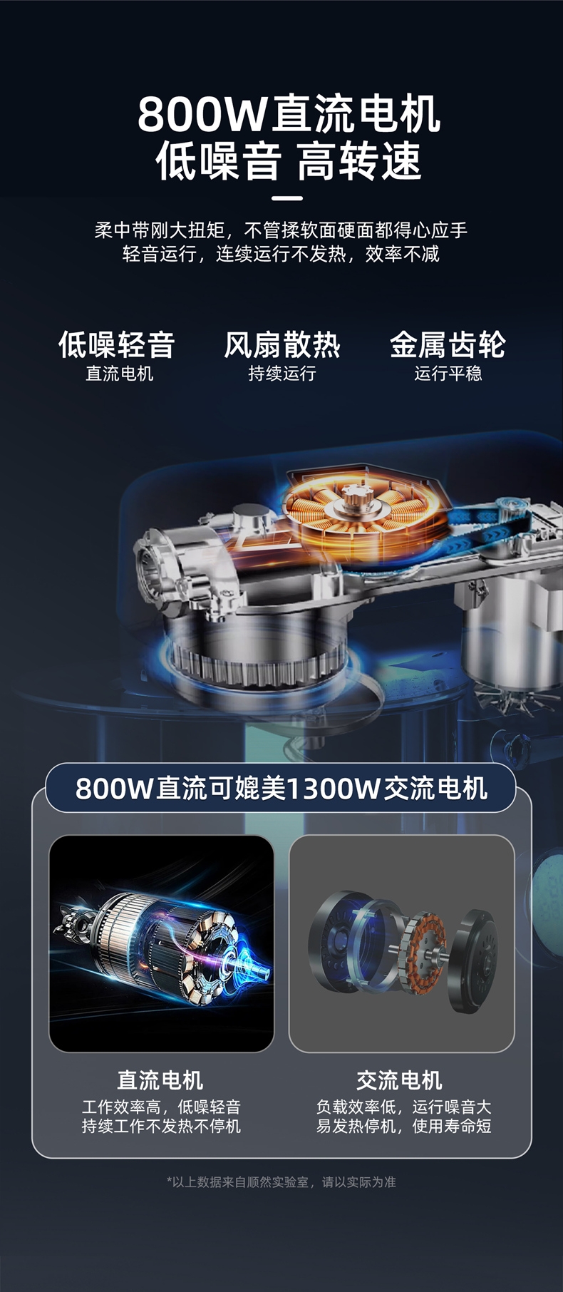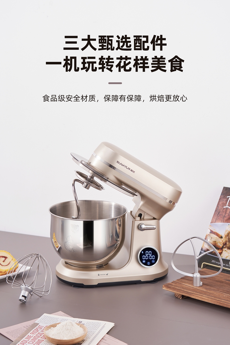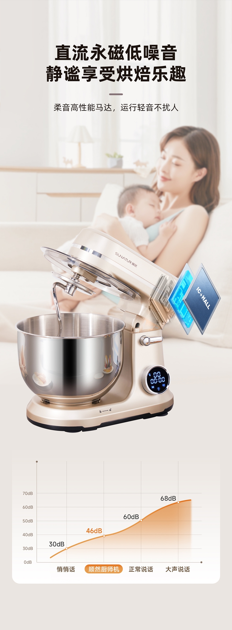 800w直流电机高效轻音运行,成团快,轻松出手套膜;11档精准调速,满足不同需求,30分钟定时免看管;3大预设功能,和面搅拌打发 金属传动齿轮高强度