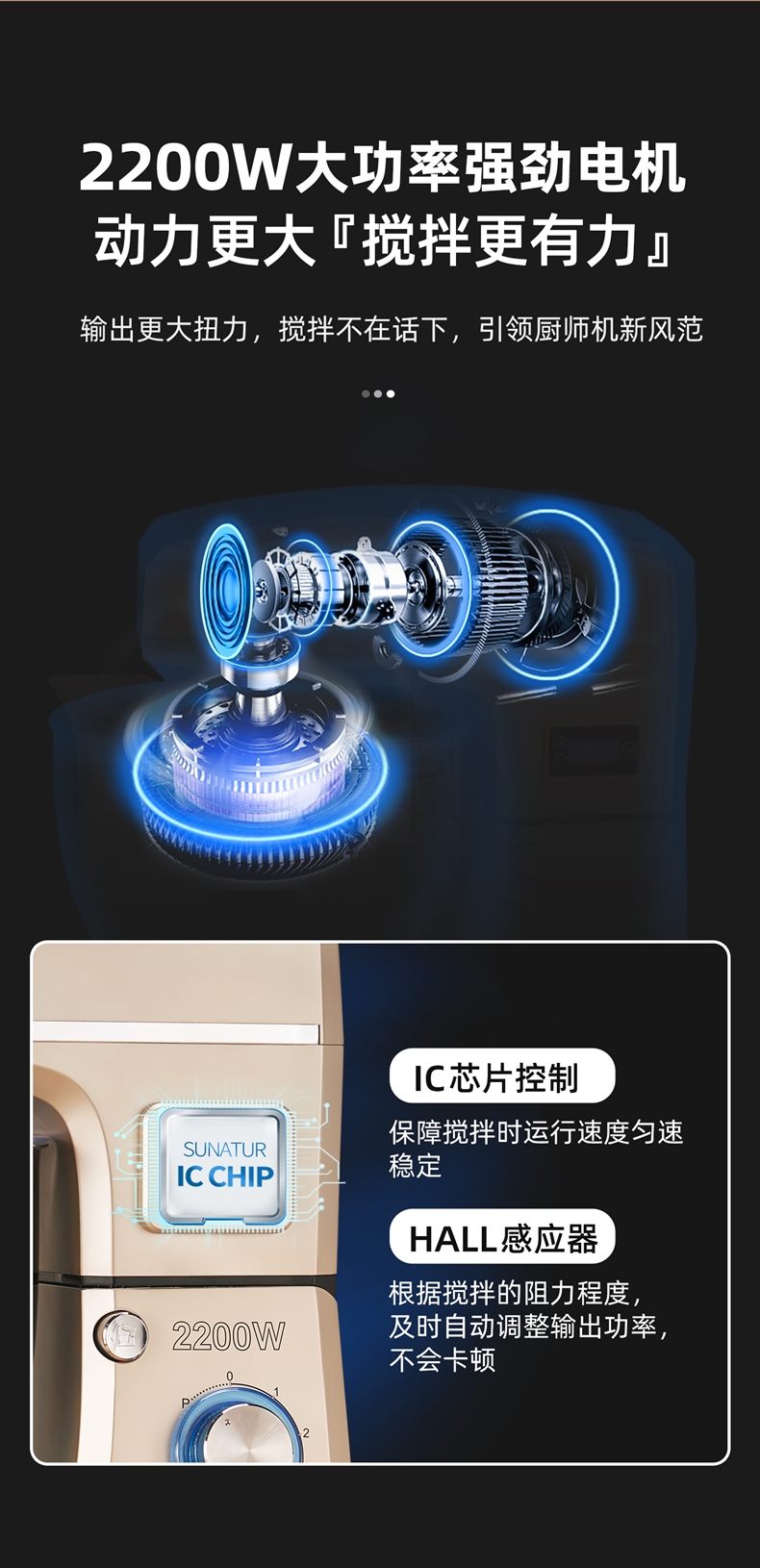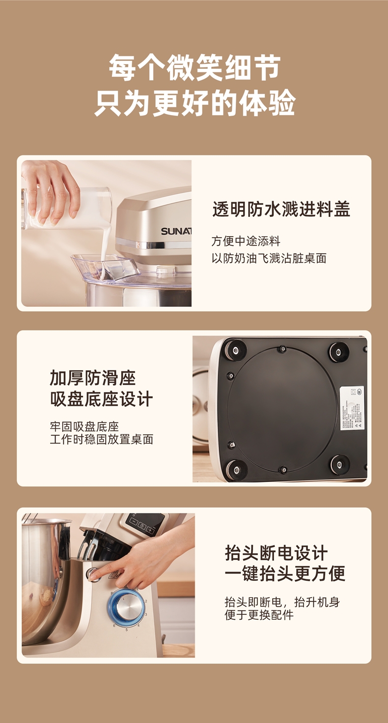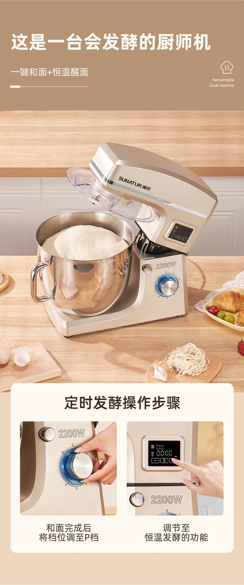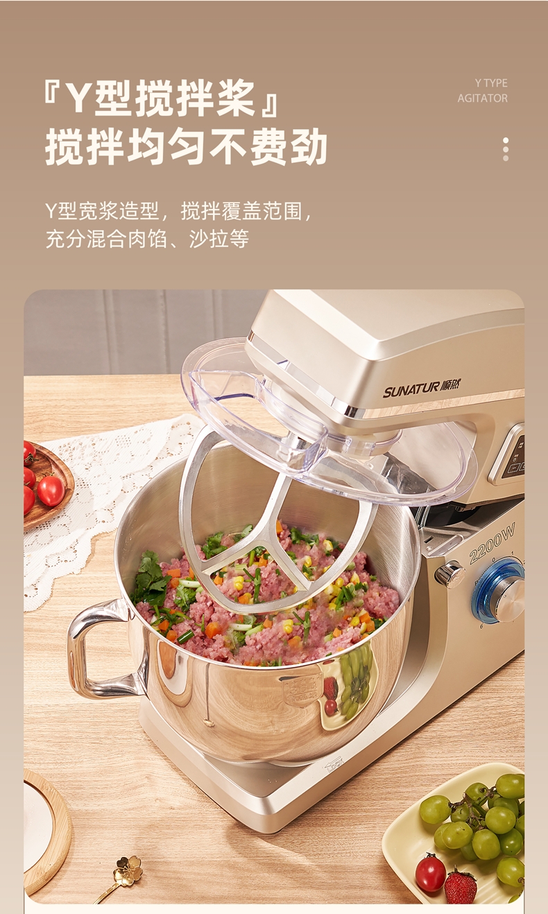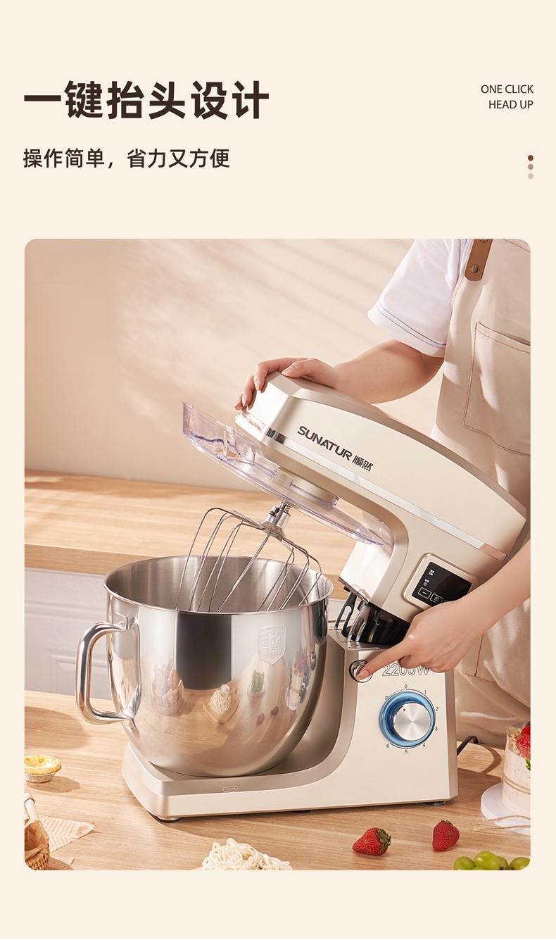 2200w大功率电机,大功率和面打发快;升级定时发酵功能 实现和面醒面一体;3大配件,6档位随心操作可视化防溅盖中途加料不费劲