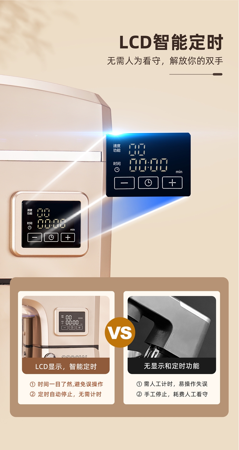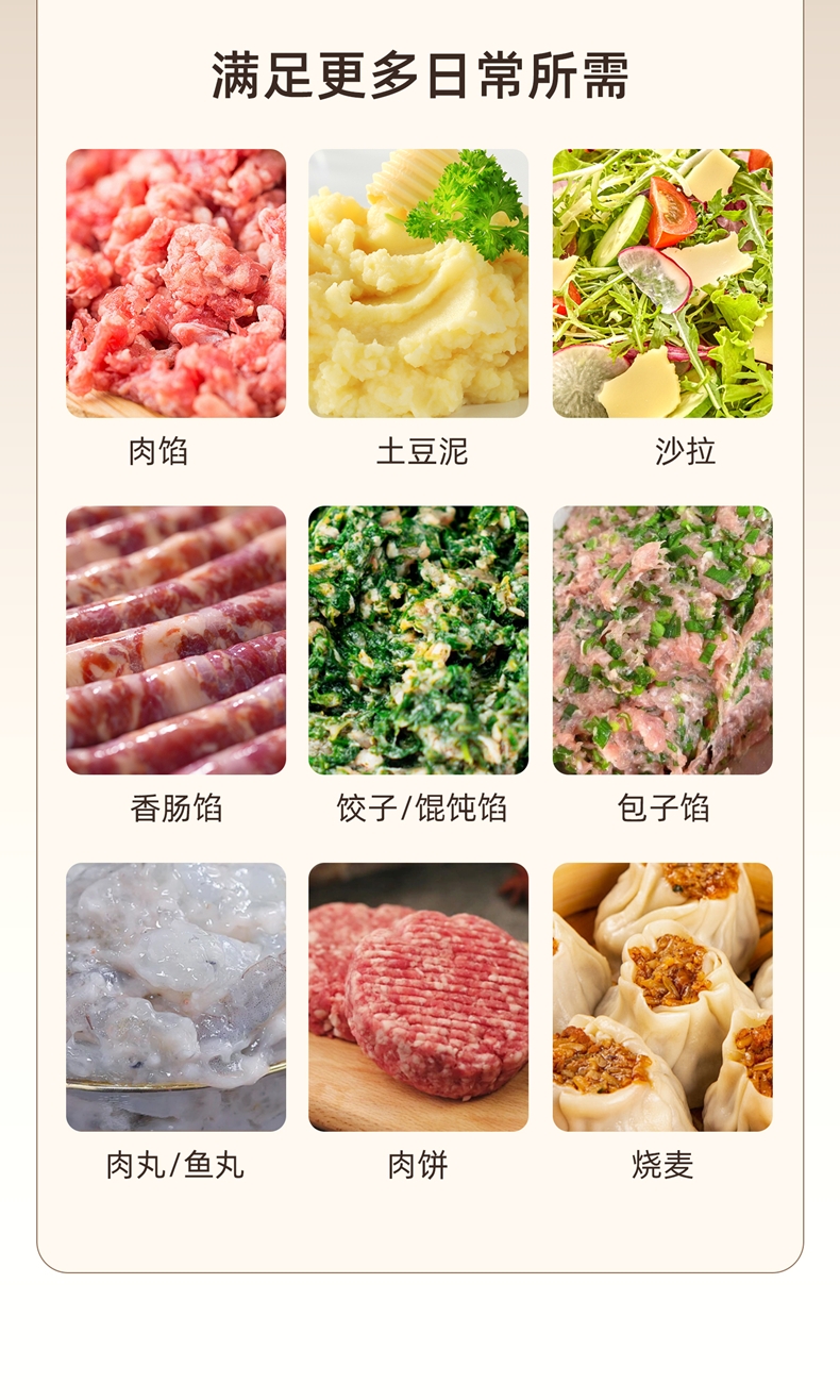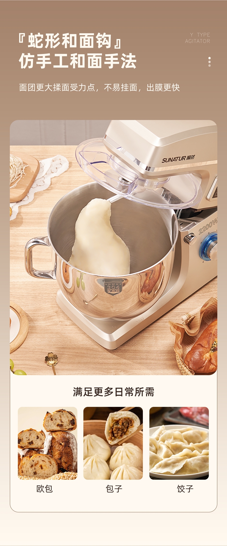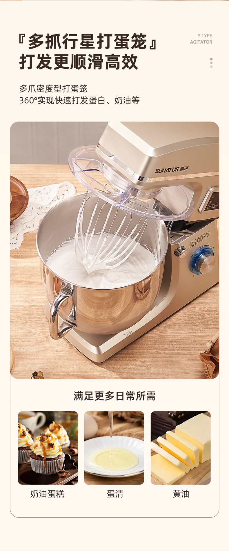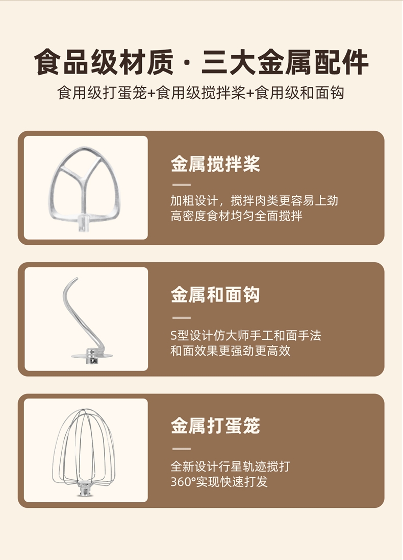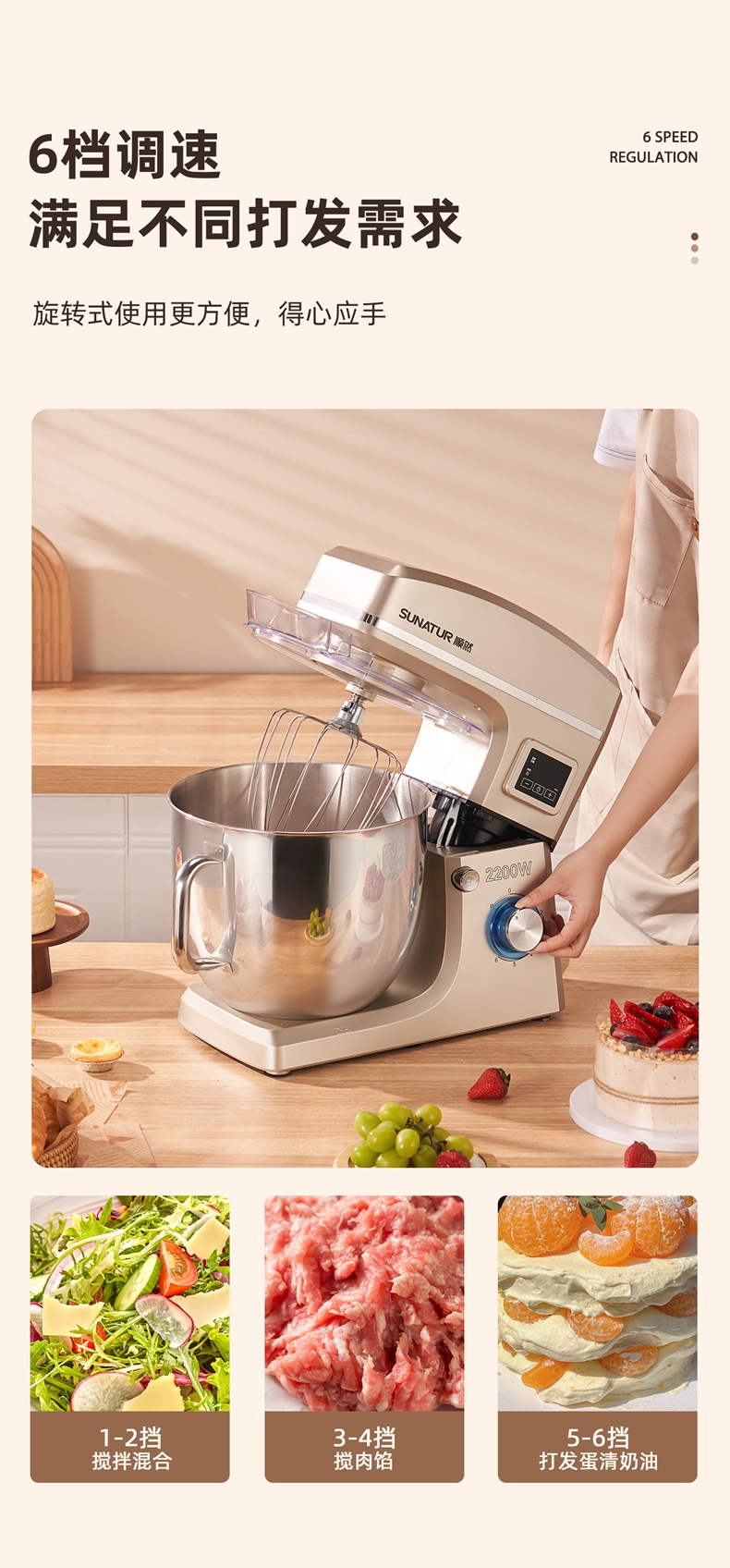 2200w大功率电机,大功率和面打发快;升级定时发酵功能 实现和面醒面一体;3大配件,6档位随心操作可视化防溅盖中途加料不费劲