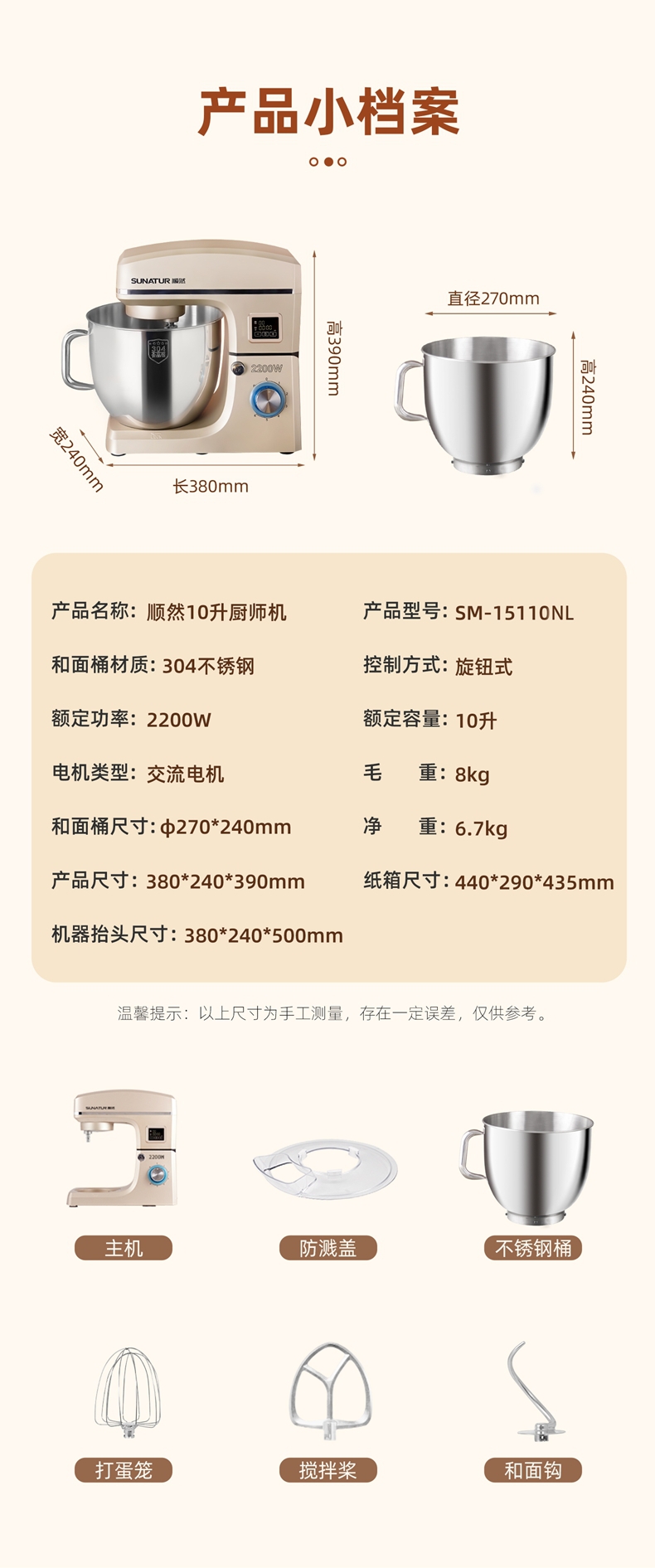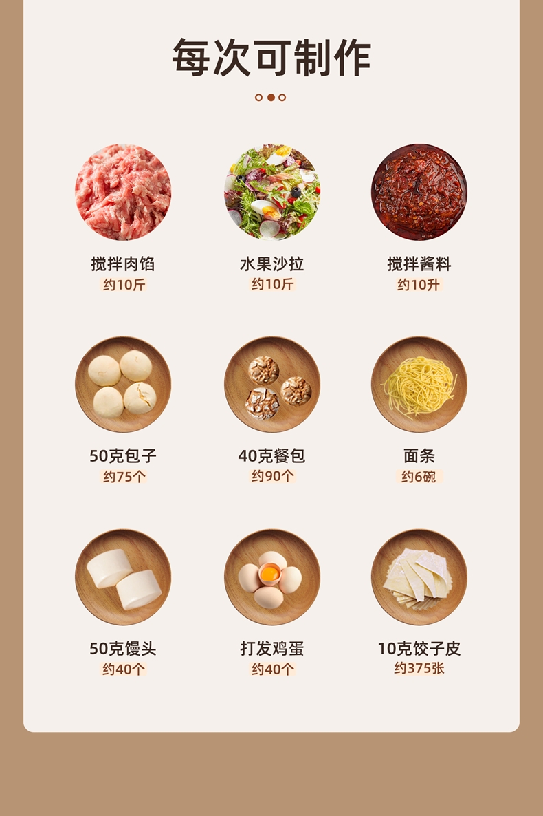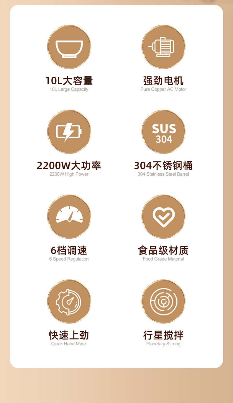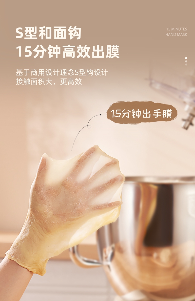 配置清单:2200w大功率电机,大功率和面打发快 304不锈钢和面桶10L,可和7.5斤面团,打发3500ml奶油,40个鸡蛋 3大配件,6档位随心操作,可视化防溅盖中途加料不费劲 一键抬头设计,抬头即断电,加固吸盘底座,防滑防晃动 定时发酵功能,面温控制25-38度发酵实现和面醒面一体