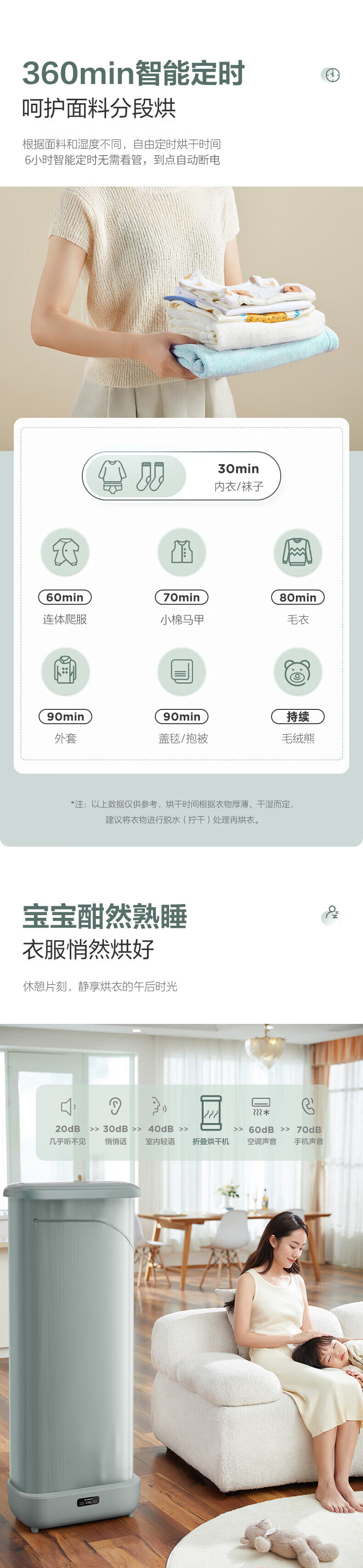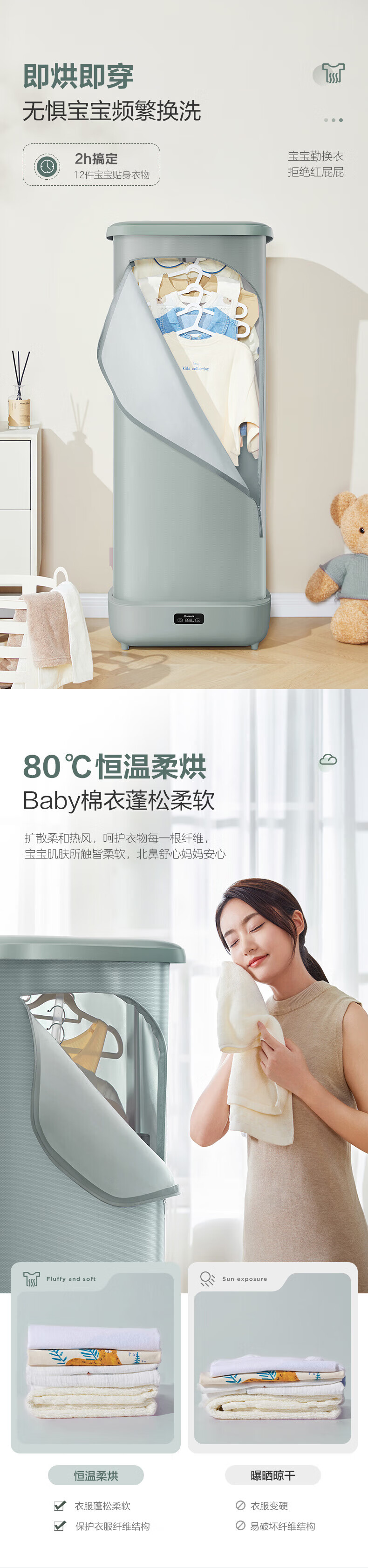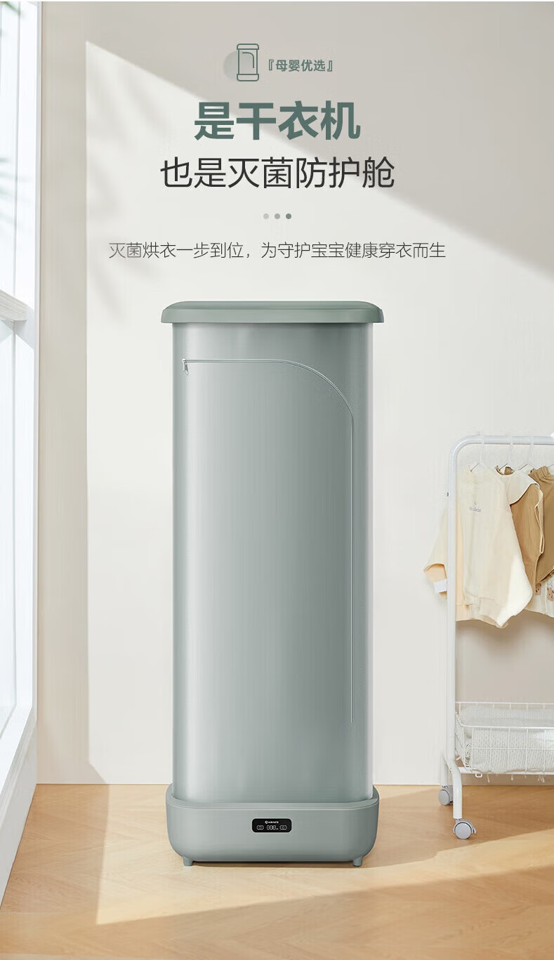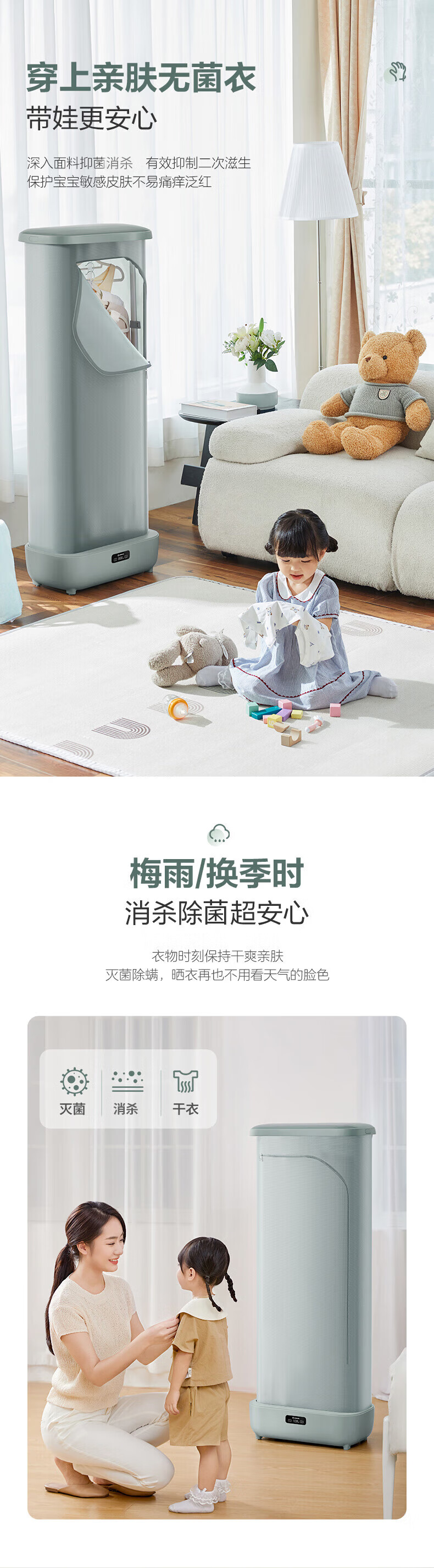 灭菌烘衣一步到位,为守护宝宝健康穿衣而生;即烘即穿无惧宝宝频繁换洗;热循环无死角360° 速干技术力MAX;创新防水风道系统 极速甩掉“水分子;360min智能定时 呵护面料分段烘