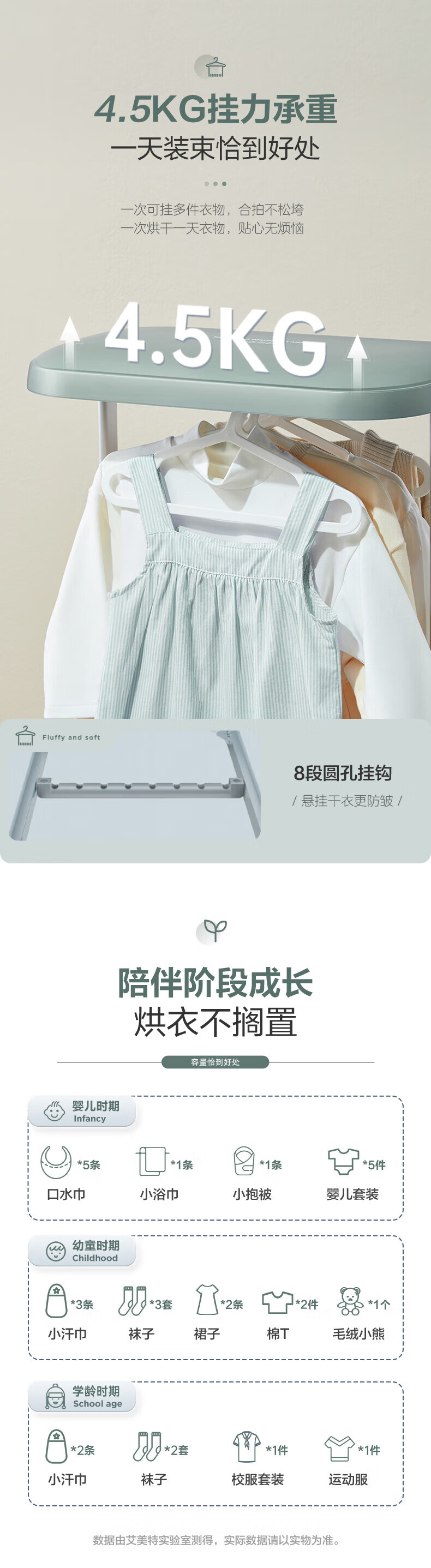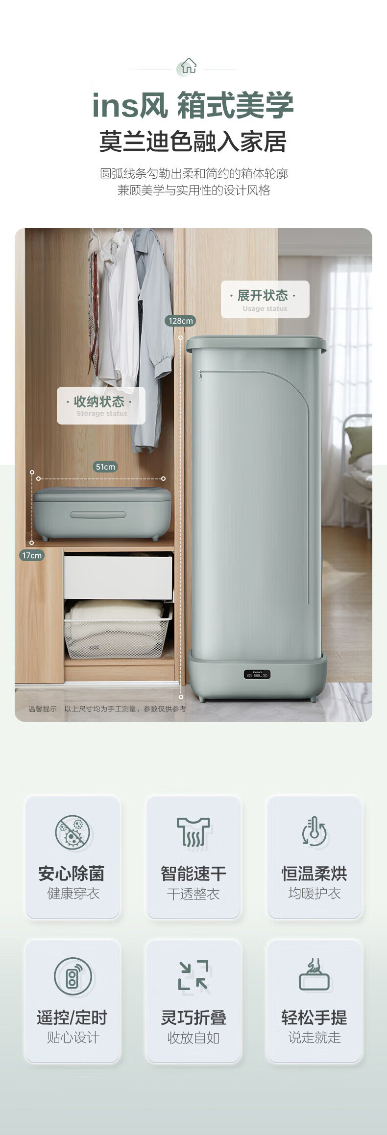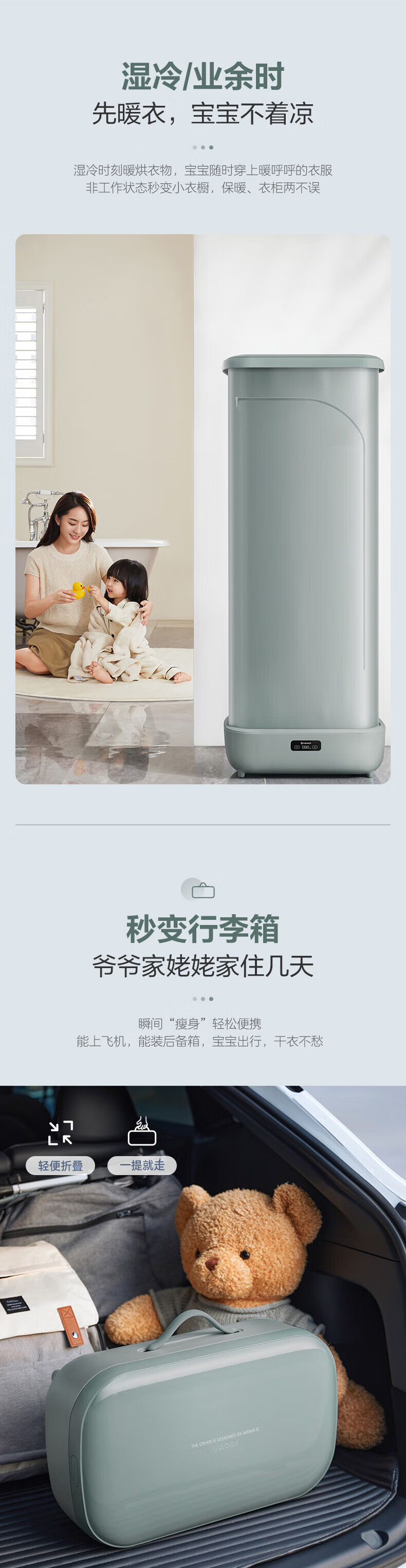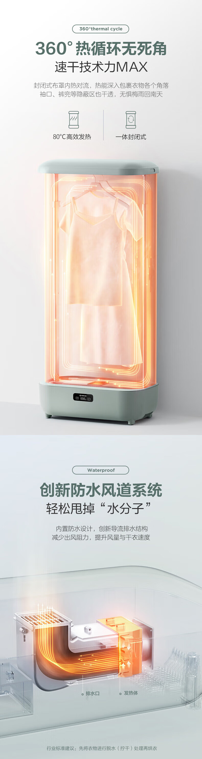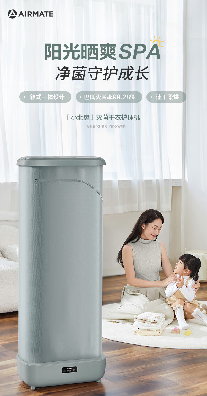 灭菌烘衣一步到位,为守护宝宝健康穿衣而生;即烘即穿无惧宝宝频繁换洗;热循环无死角360° 速干技术力MAX;创新防水风道系统 极速甩掉“水分子;360min智能定时 呵护面料分段烘
