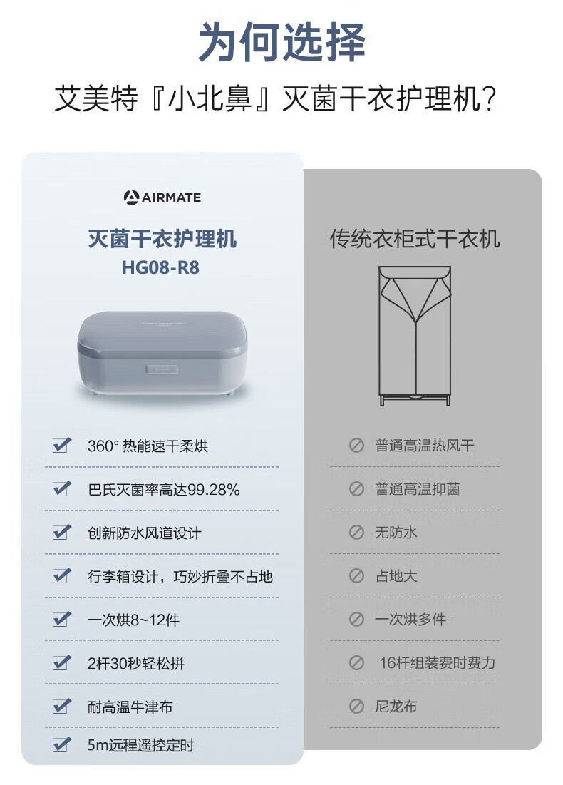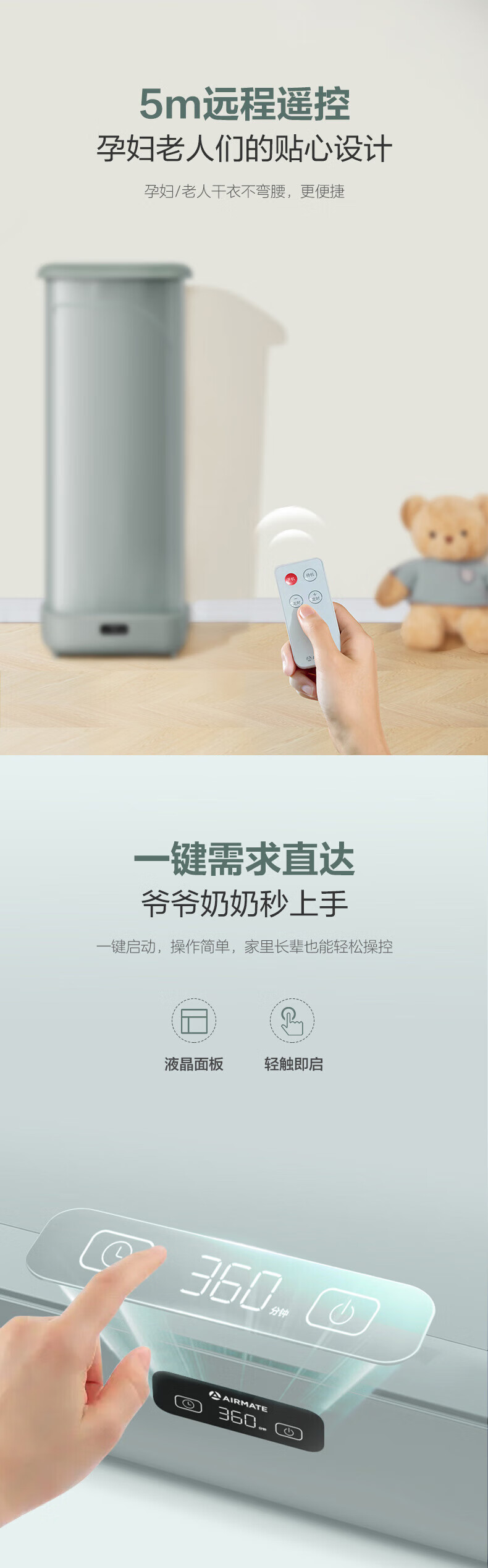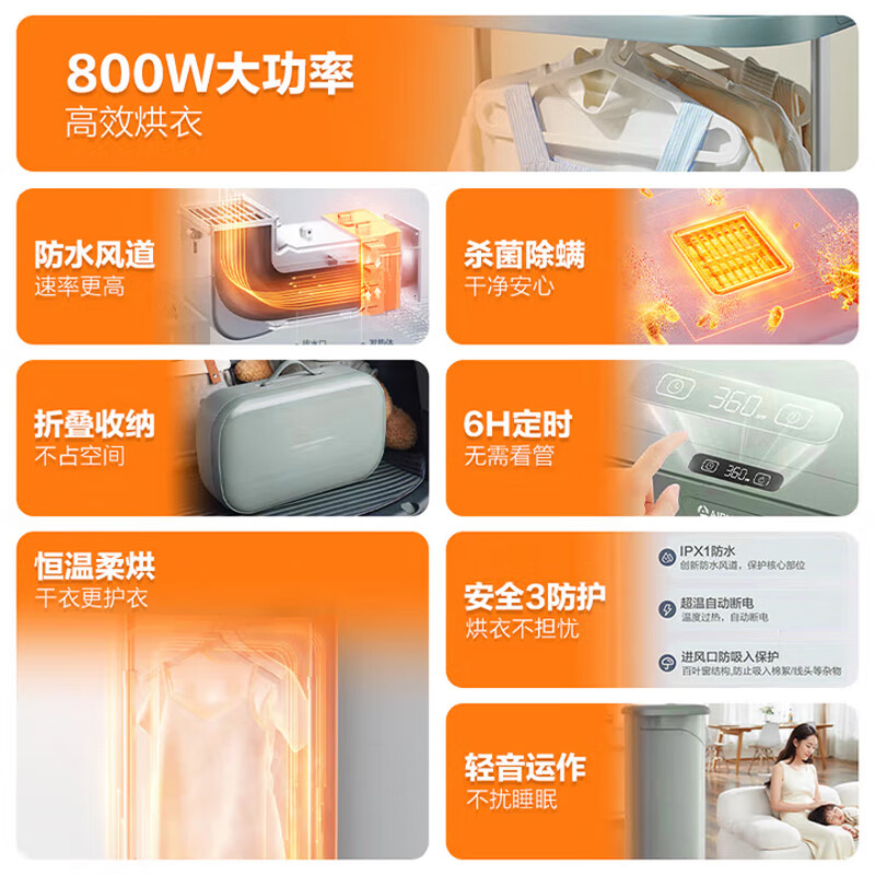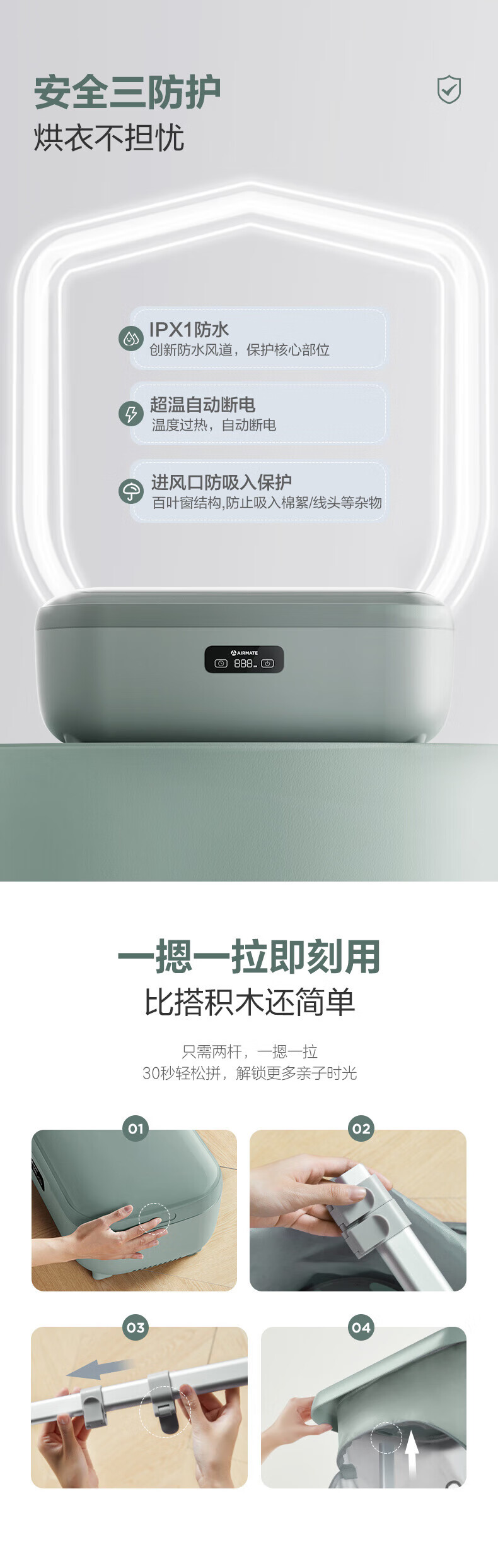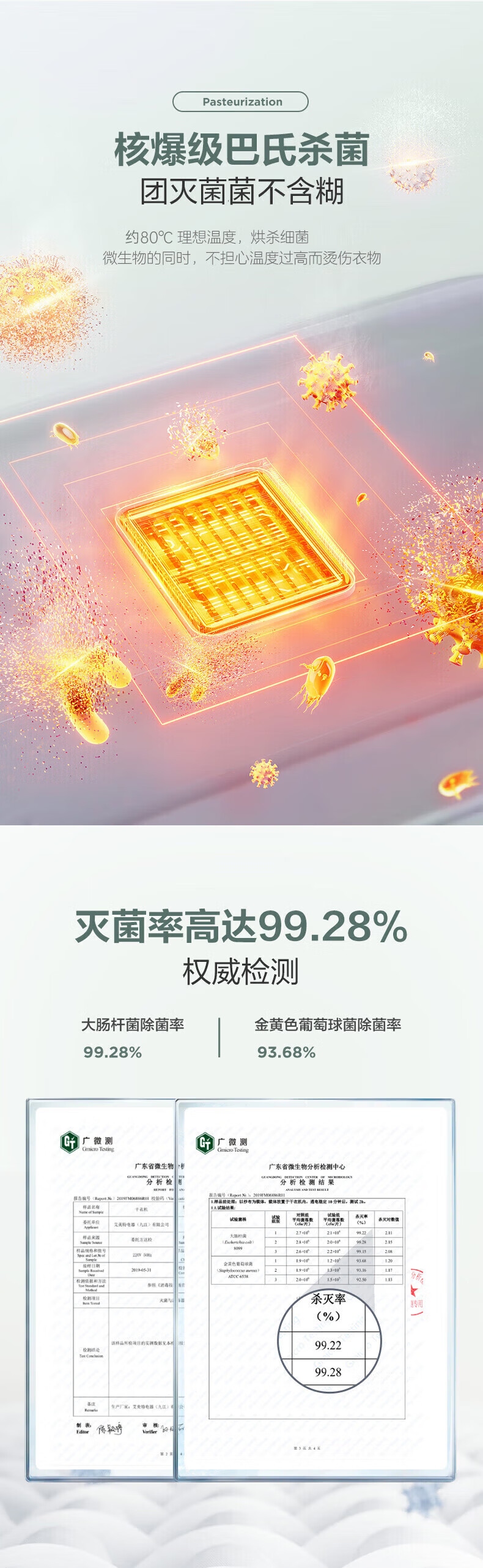 灭菌烘衣一步到位,为守护宝宝健康穿衣而生;即烘即穿无惧宝宝频繁换洗;热循环无死角360° 速干技术力MAX;创新防水风道系统 极速甩掉“水分子;360min智能定时 呵护面料分段烘