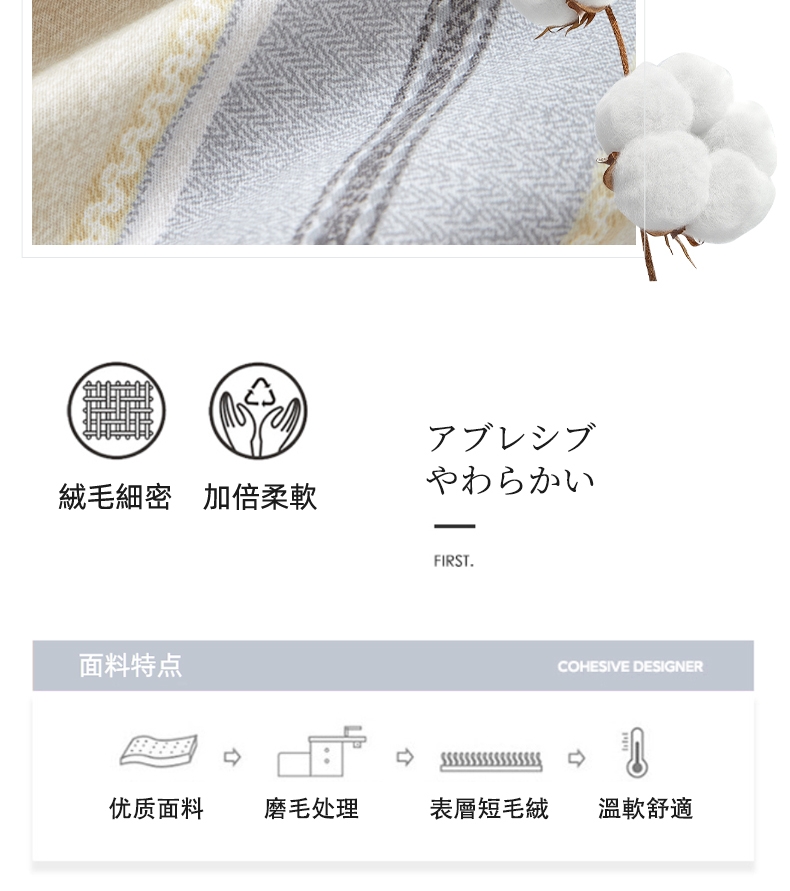 纯棉面料,加厚起绒,保暖性更好;磨毛工艺,让面料起绒,手感厚实,细腻亲肤,同时锁暖;预放规格,预留缩水空间,让使用更舒心