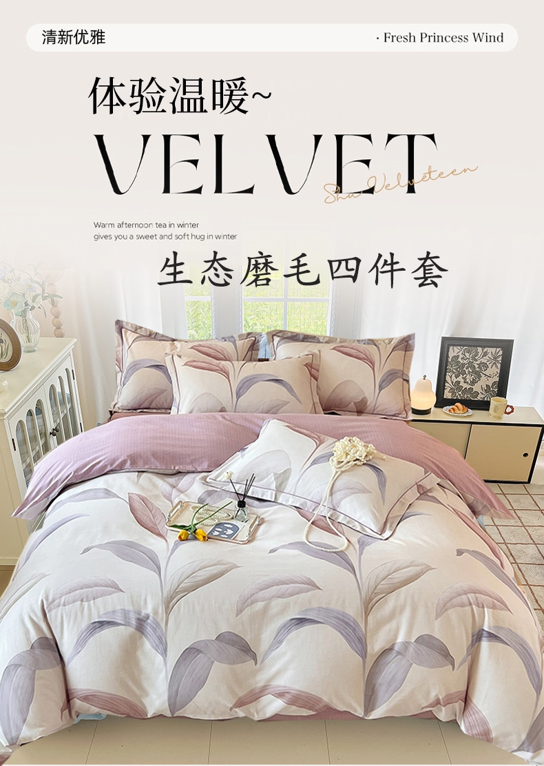 磨毛,纤维柔长,绒毛更加丰盈密集。;柔软细腻,亲肤呵护,保暖加倍。;采用活性印染工艺,色彩靓丽,耐洗不易褪色。