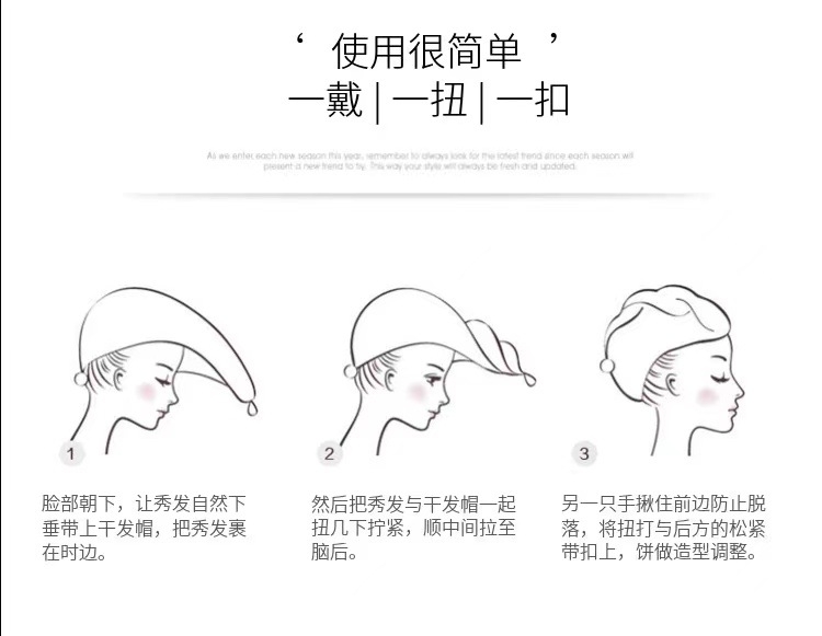 吸水力强,干发速度快;穿戴便捷,解放双手;柔软亲肤,使用感舒适