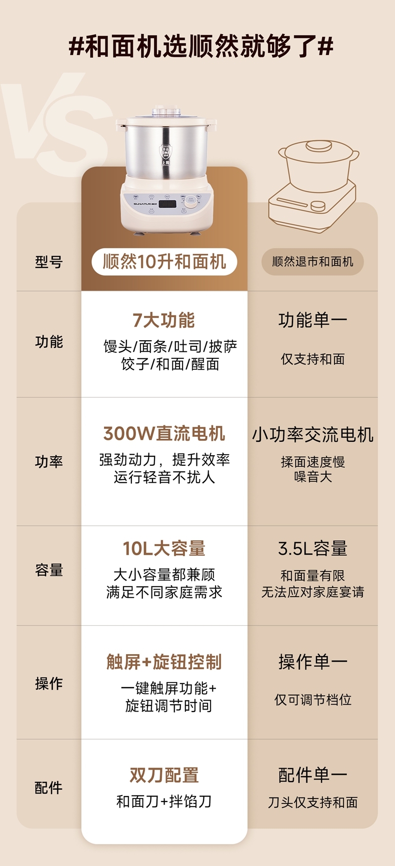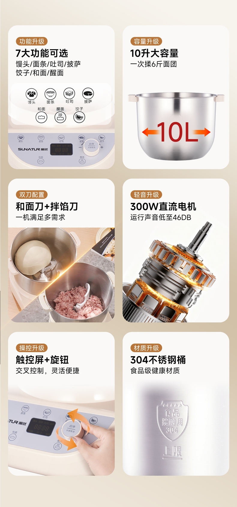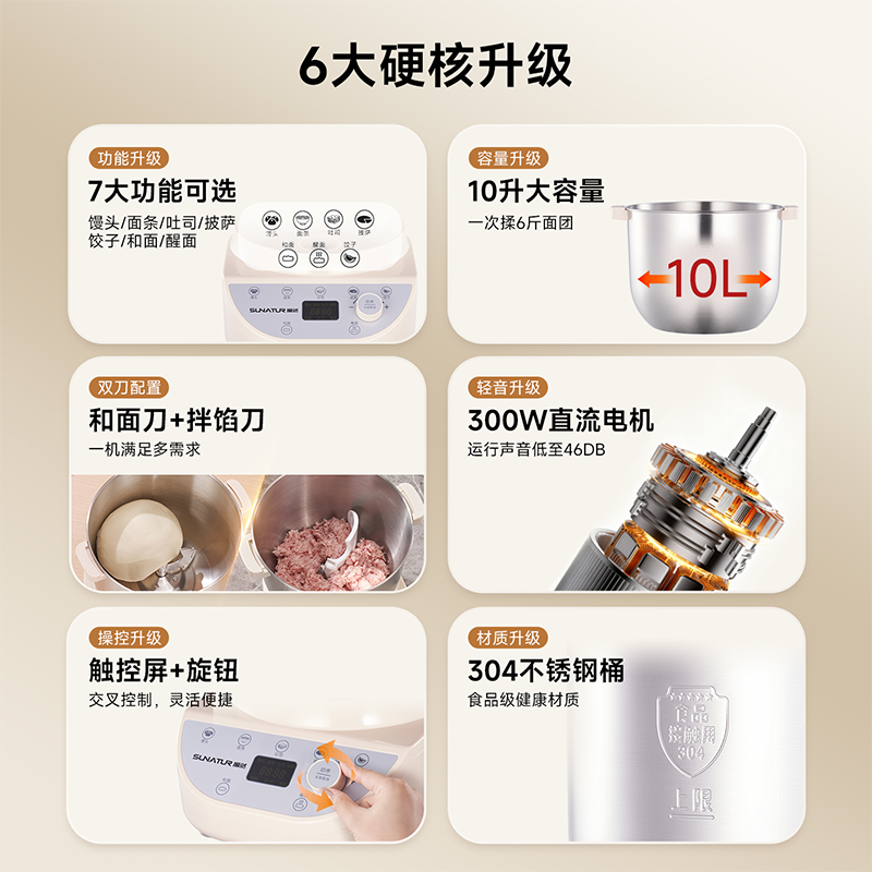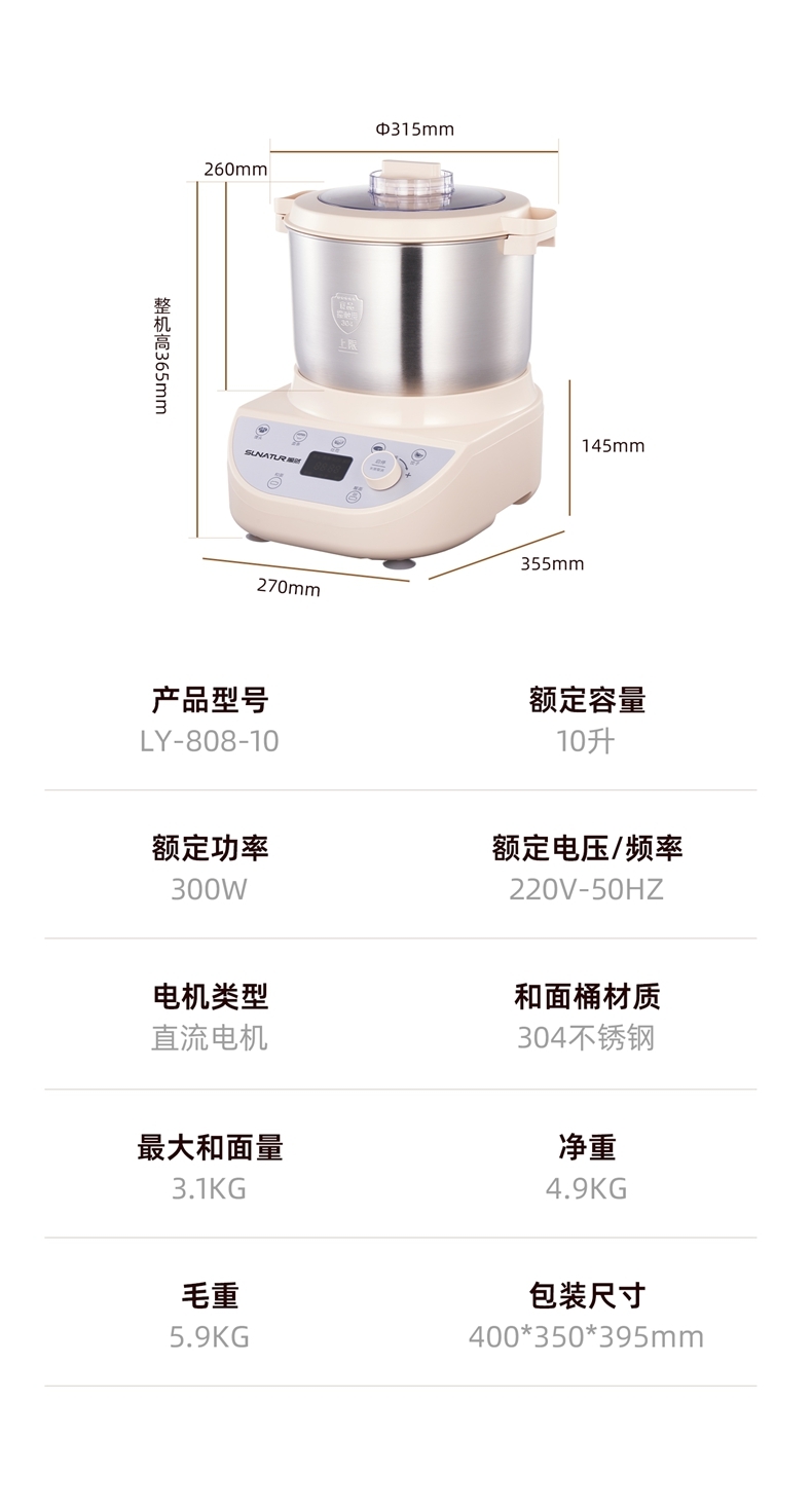 10升容量具备全自动和面、发酵、醒面功能;定时功能,智能揉面 + 恒温醒面;304 不锈钢和面桶 ,300W大动力电机