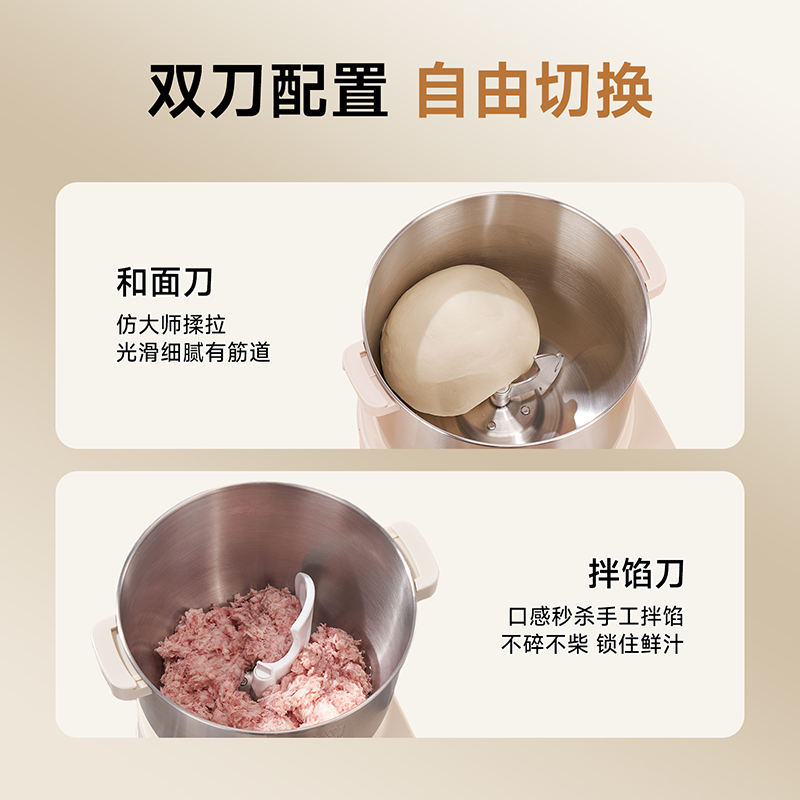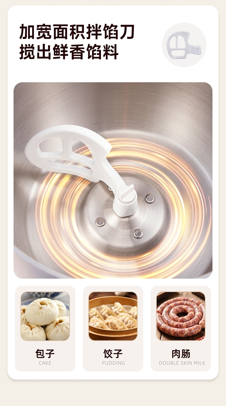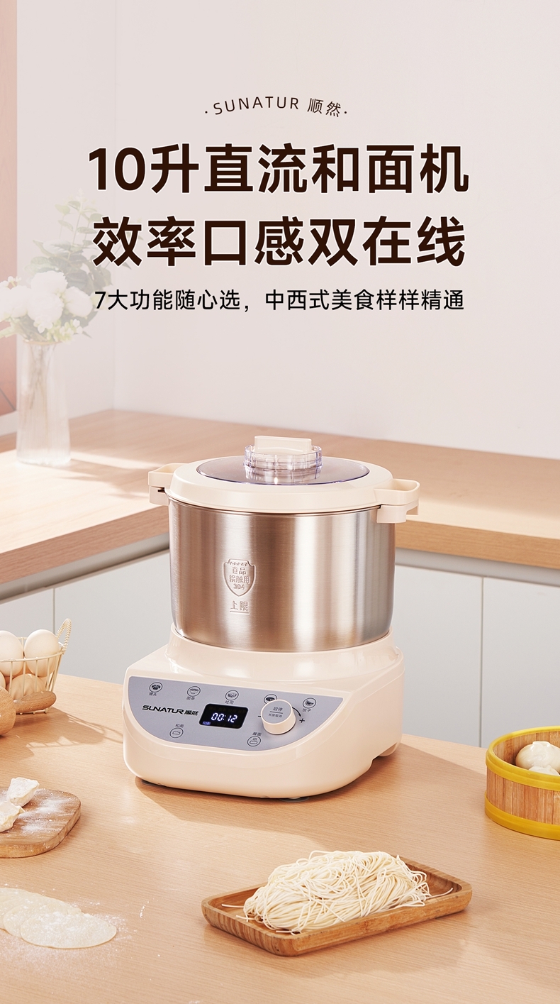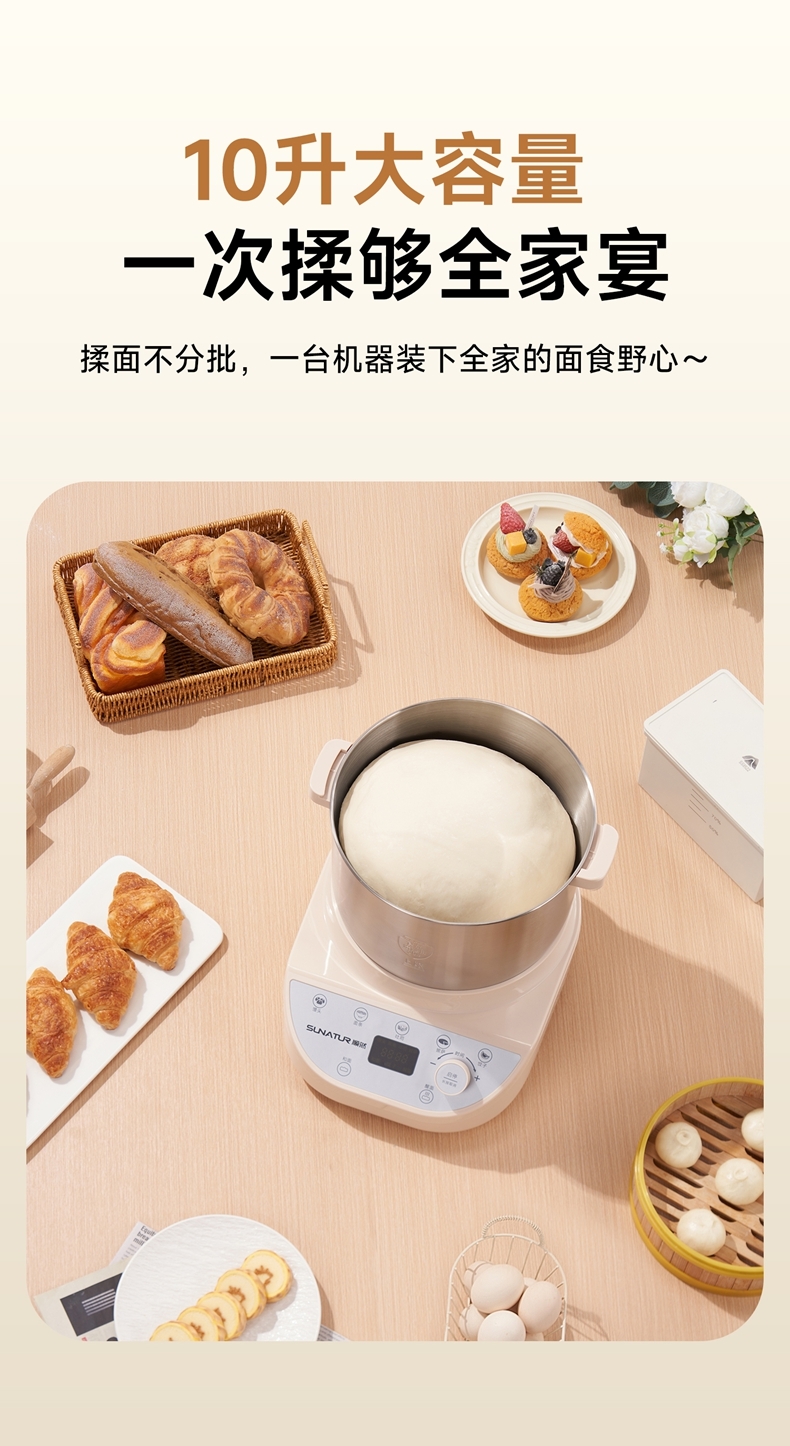 功能多样:10升容量具备全自动和面、发酵、醒面功能,还可用于蛋清奶盖打发、搅拌肉馅等,能满足中西式面点制作需求。