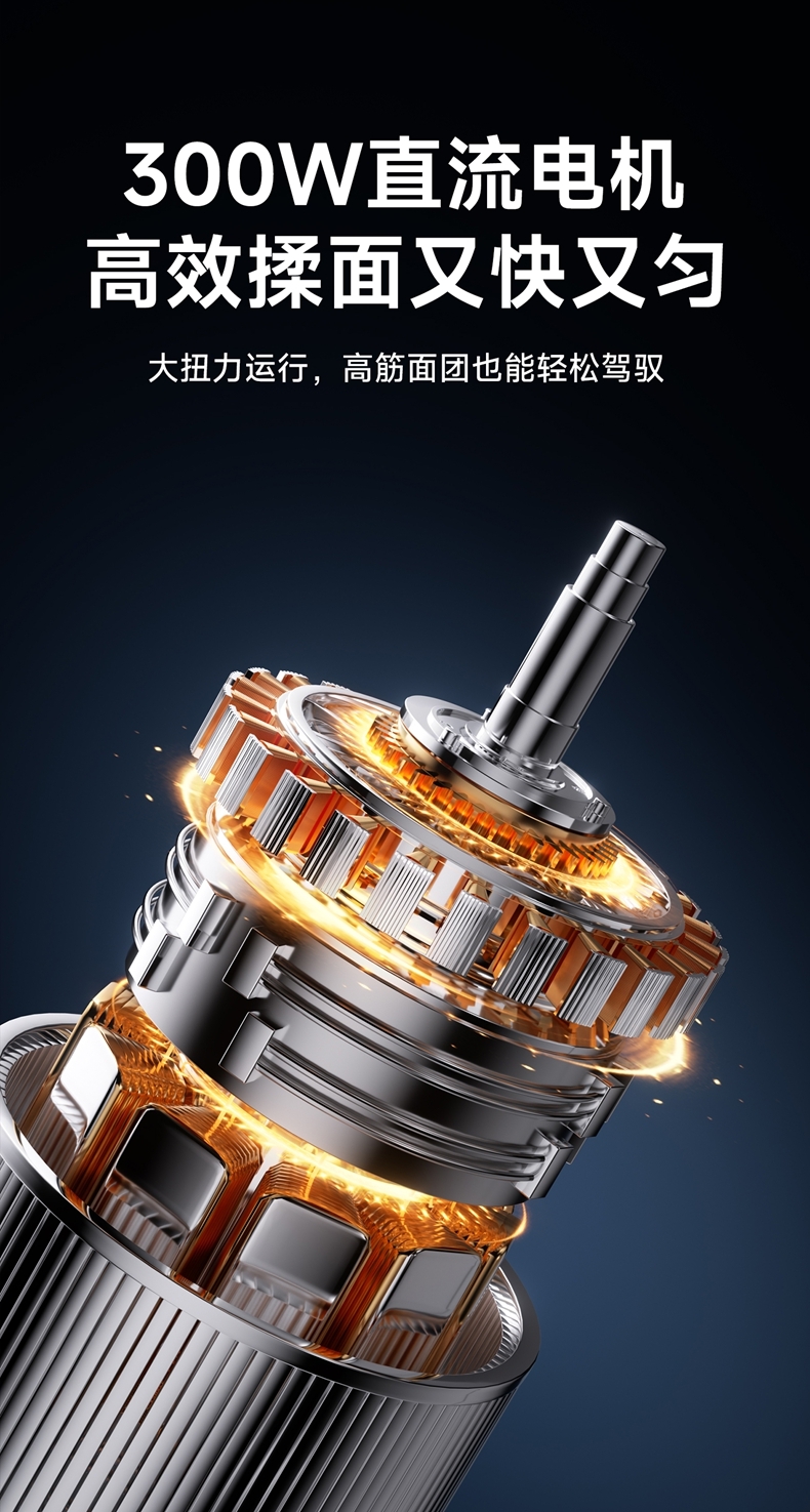 材质优良:食物接触材质为 304 不锈钢,坚固耐用且卫生健康,清洗方便;机身采用 ABS 材质,300瓦大动力电机,配合十字锥形盖,能轻松揉出 三光 面团,快速出膜。