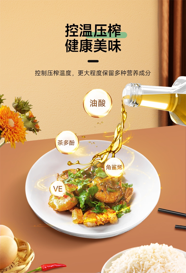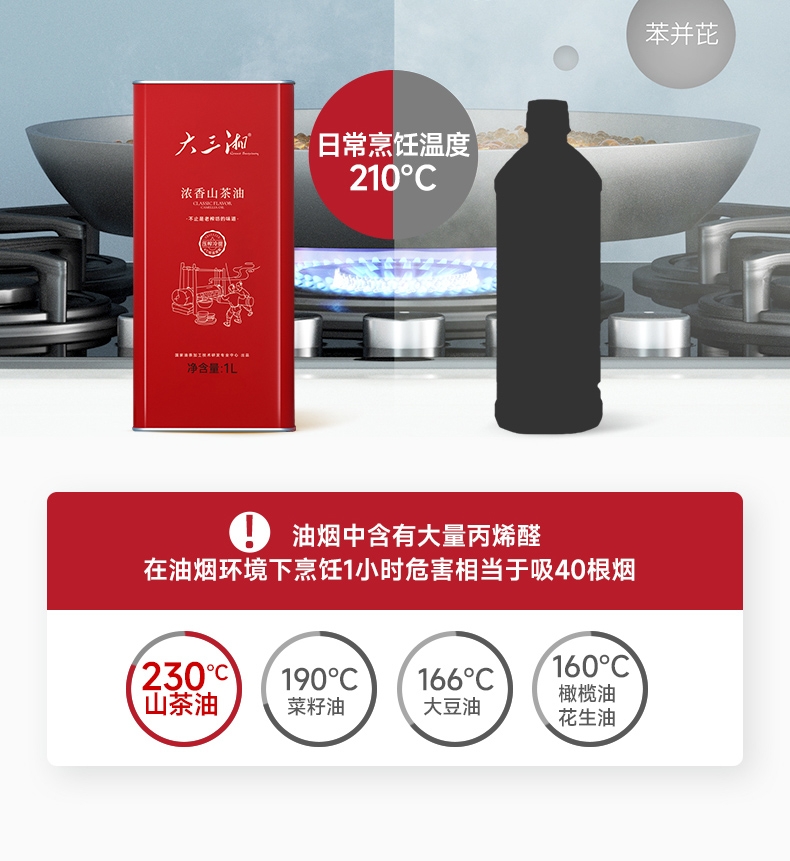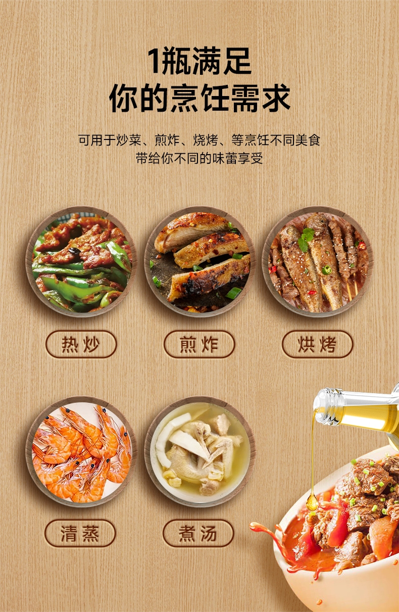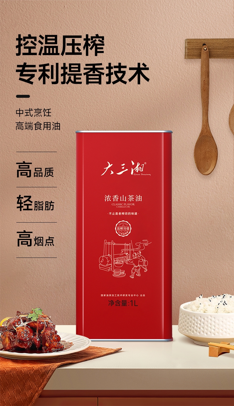 浓香纯正,风味浓郁,不止是土榨坊的味道 ;230°的高烟点,符合中国人的烹饪习惯;荤菜好搭档 入味不腻 茶油分子小,渗透力强
