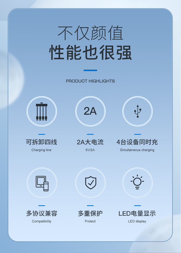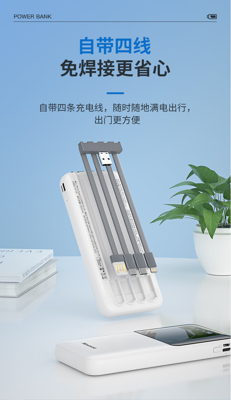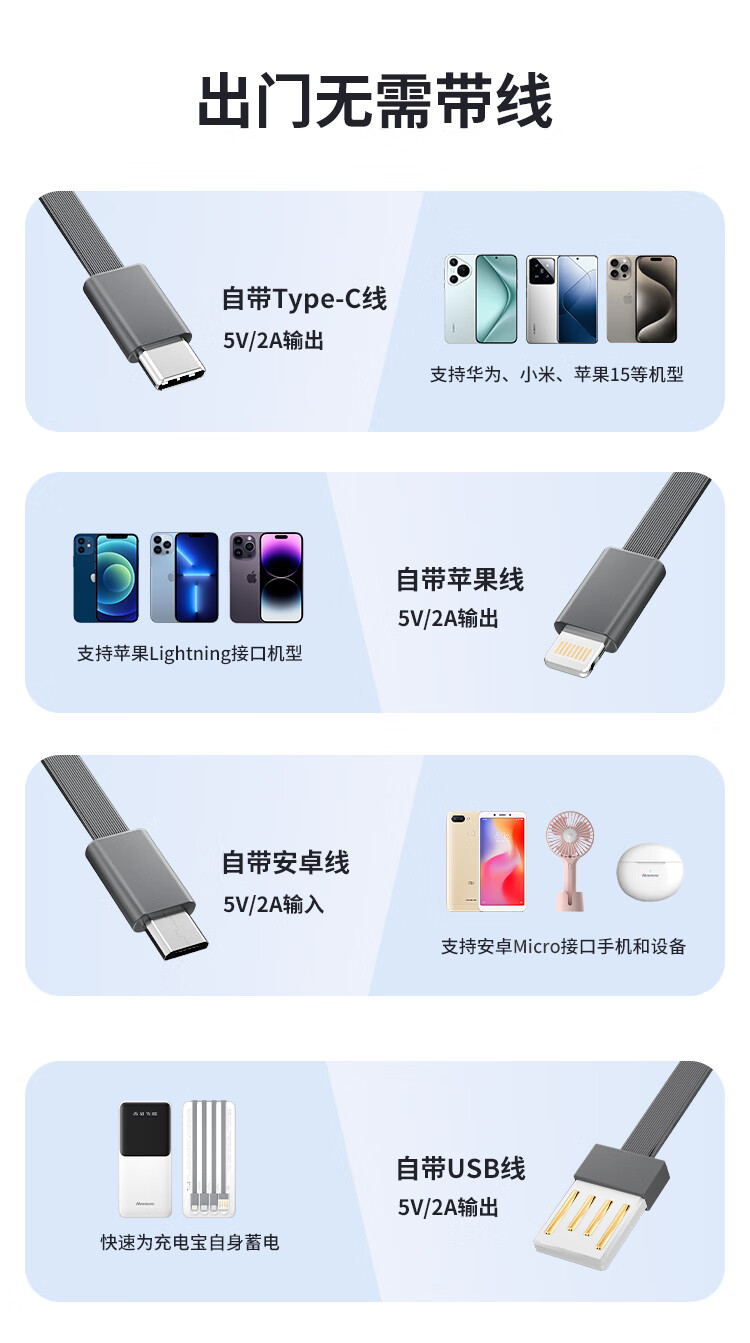 输出:Type-c线/Lightning线/Type-c线/USB口:5V/2A。