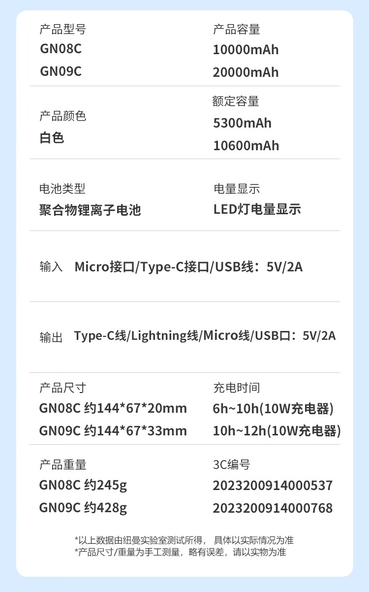 GN09C 电池容量:20000mAh,额定:10600mAh。