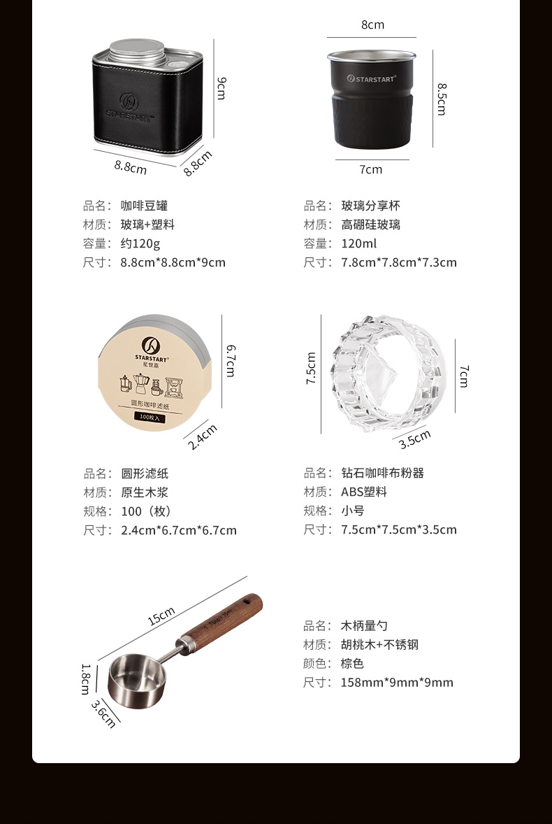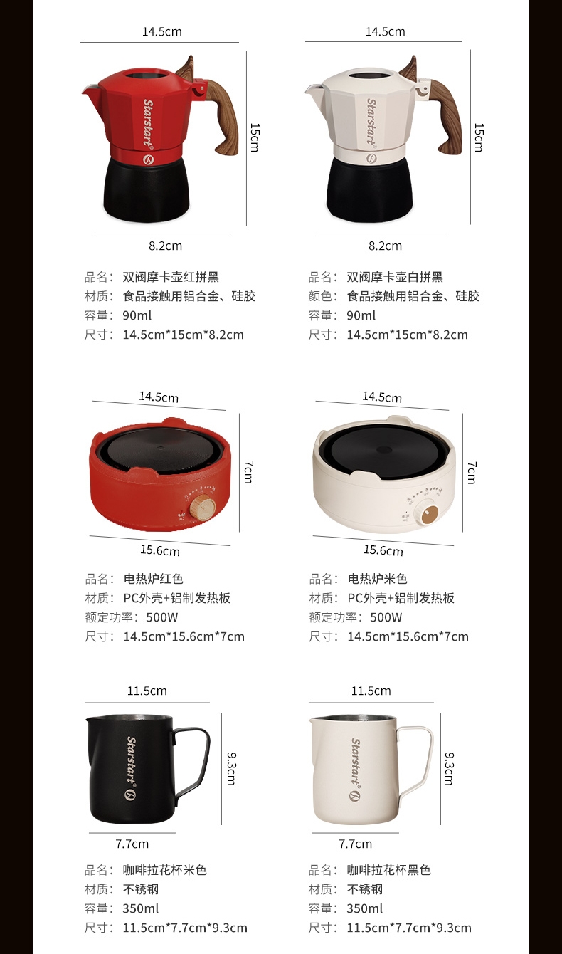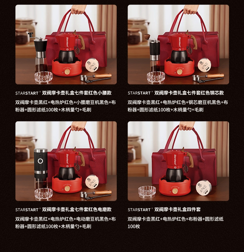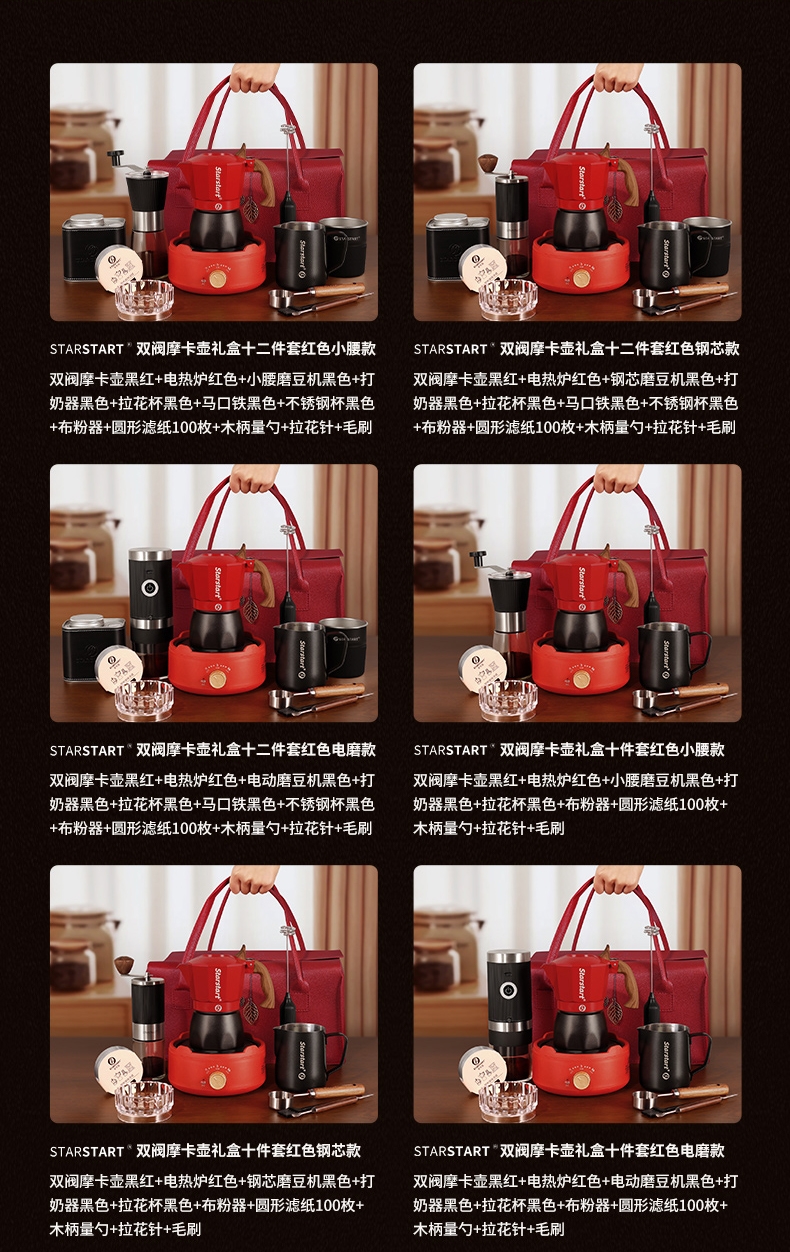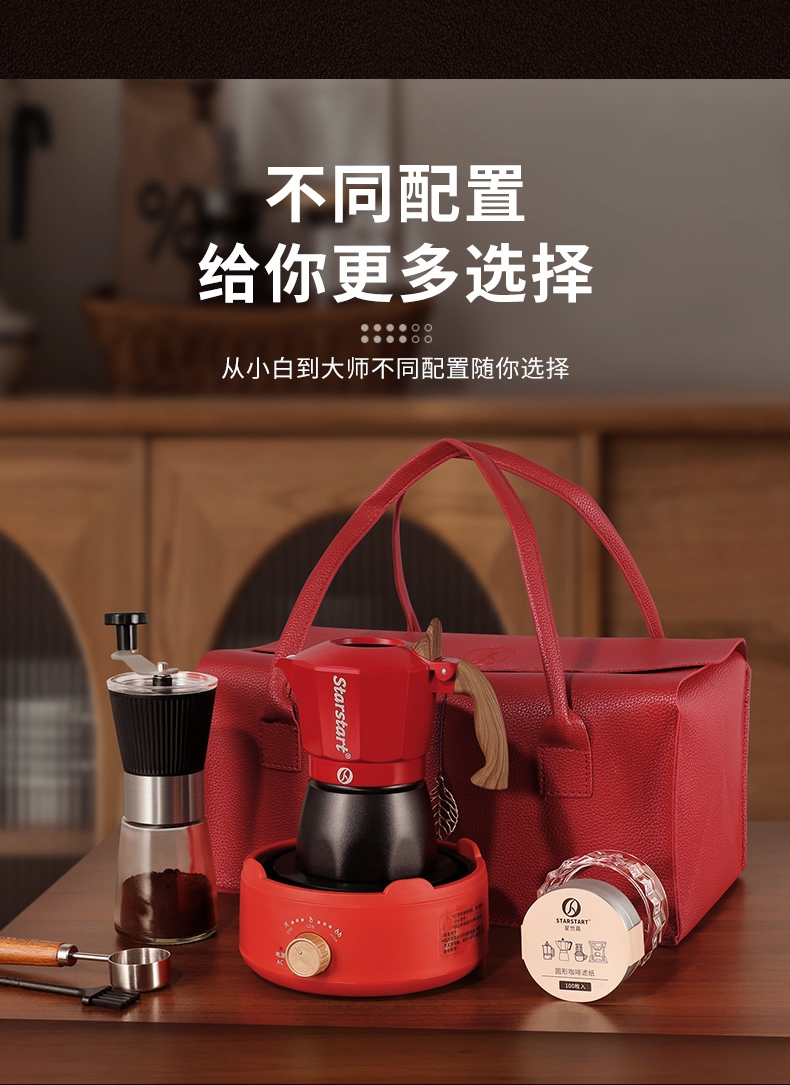 配置清单:皮箱【咖啡色/红色可选】, 双阀摩卡壶【黑红/黑白可选】,木手柄拉花针, 电炉500W【白/黑/红可选, 清洁毛刷 304不锈钢杯 【白/黑/红可选】, 圆形滤纸100片装, 手摇磨豆机【陶瓷磨芯】【黑/白可选】, 布粉器,密封罐单向排气阀【黑/白/咖啡色可选】, 410不锈钢相思木手柄量勺,304不锈钢拉花杯【黑/白可选】