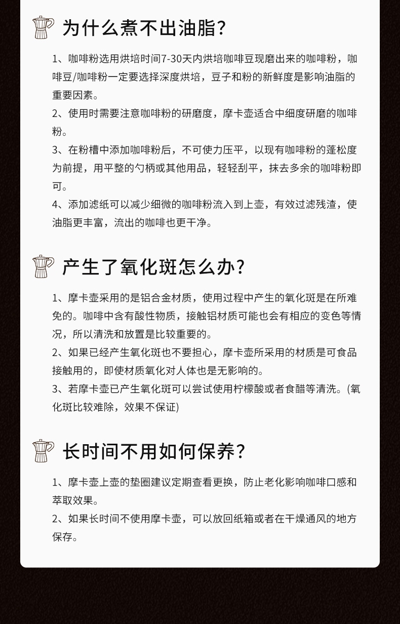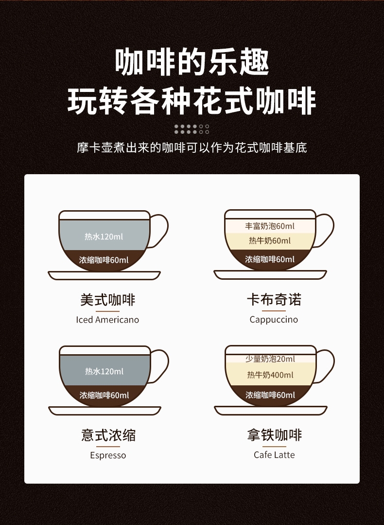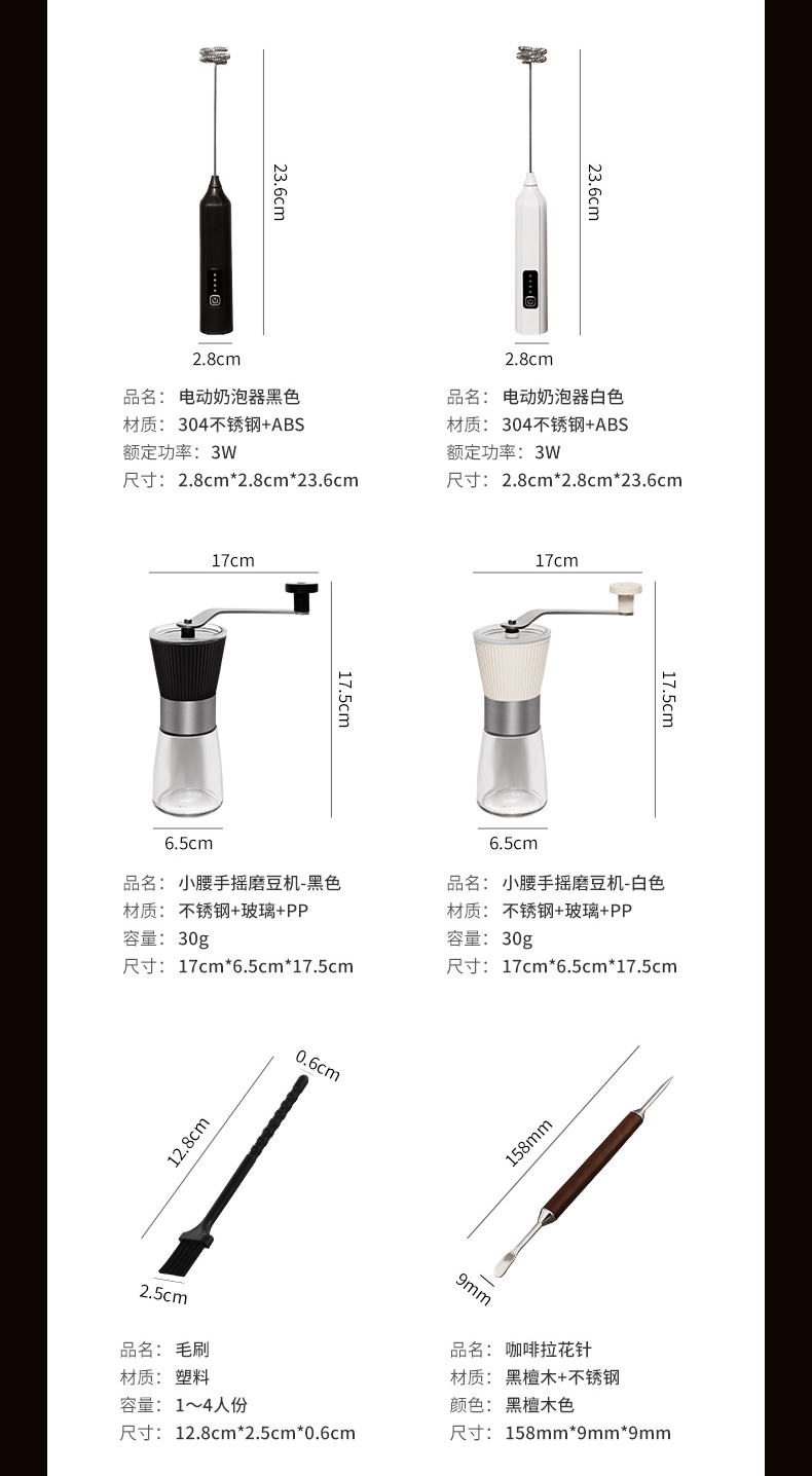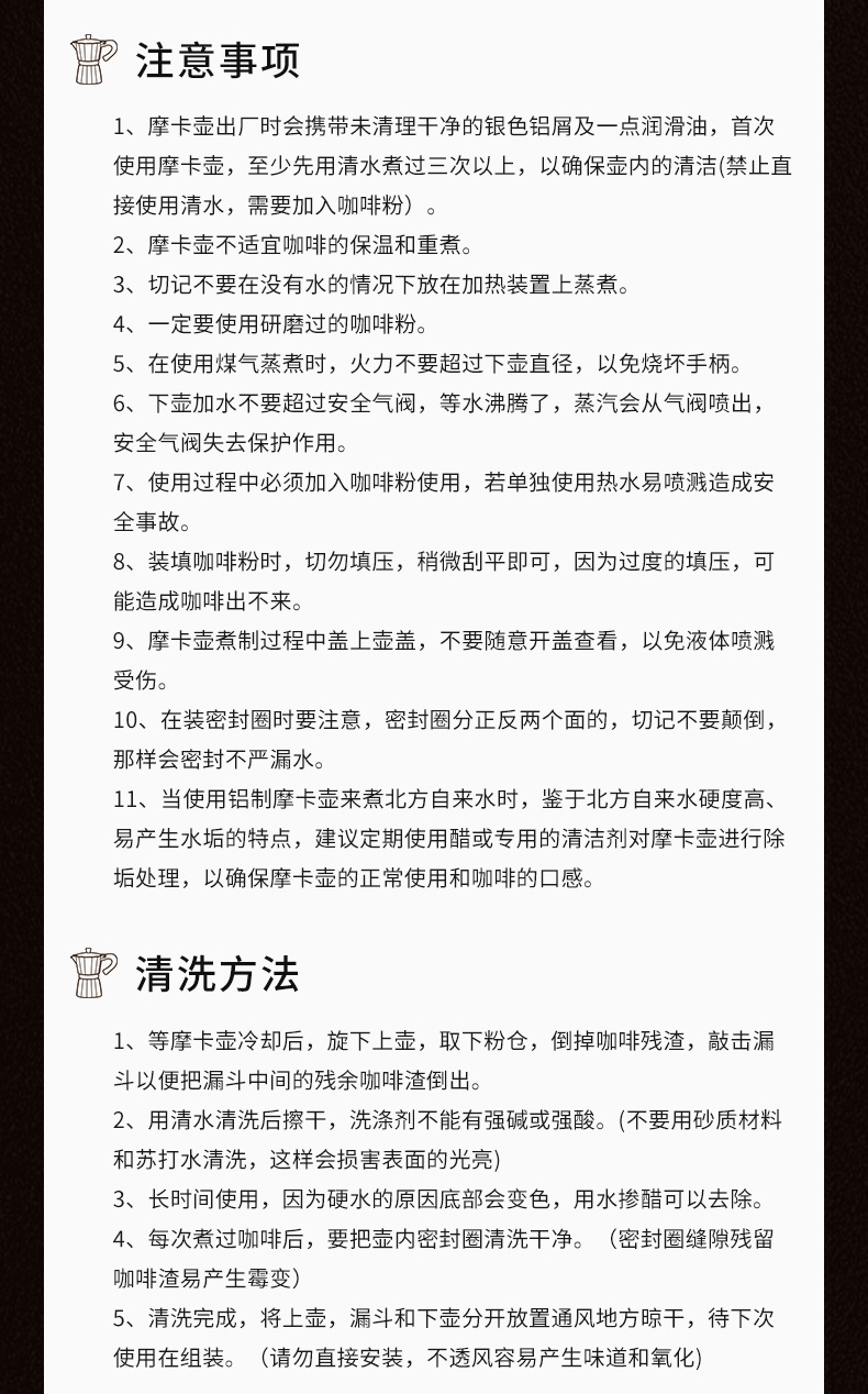 配置清单:皮箱【咖啡色/红色可选】, 双阀摩卡壶【黑红/黑白可选】,木手柄拉花针, 电炉500W【白/黑/红可选, 清洁毛刷 304不锈钢杯 【白/黑/红可选】, 圆形滤纸100片装, 手摇磨豆机【陶瓷磨芯】【黑/白可选】, 布粉器,密封罐单向排气阀【黑/白/咖啡色可选】, 410不锈钢相思木手柄量勺,304不锈钢拉花杯【黑/白可选】