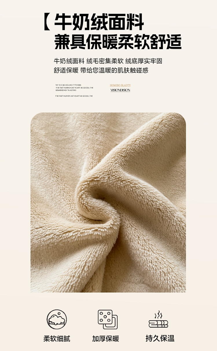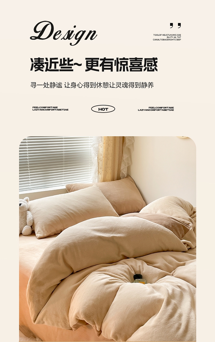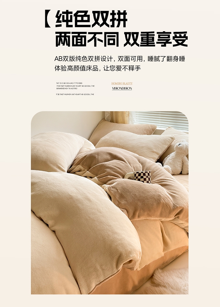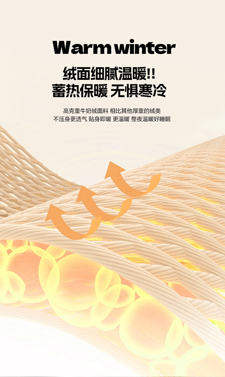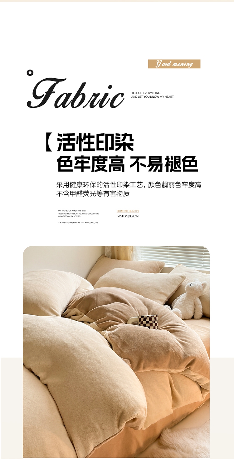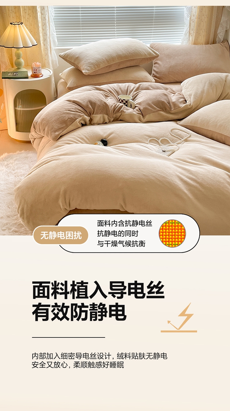 重磅牛奶绒面料,手感细腻软糯,透气性佳。;新一代活性印染工艺,色牢度高,不易褪色可水洗;植入导电丝,静音舒适呵护娇嫩肌肤,提升睡眠质量。
