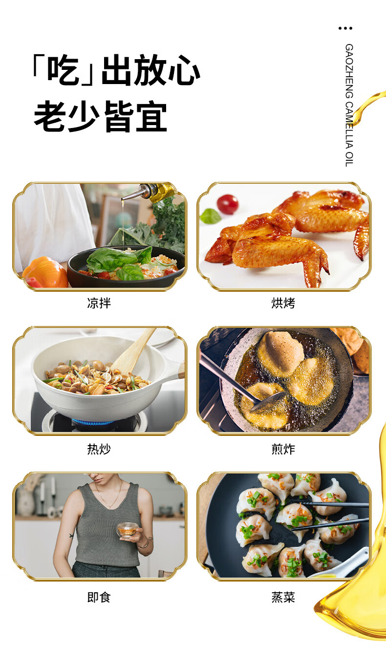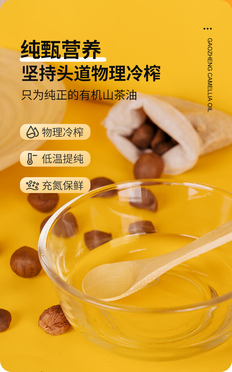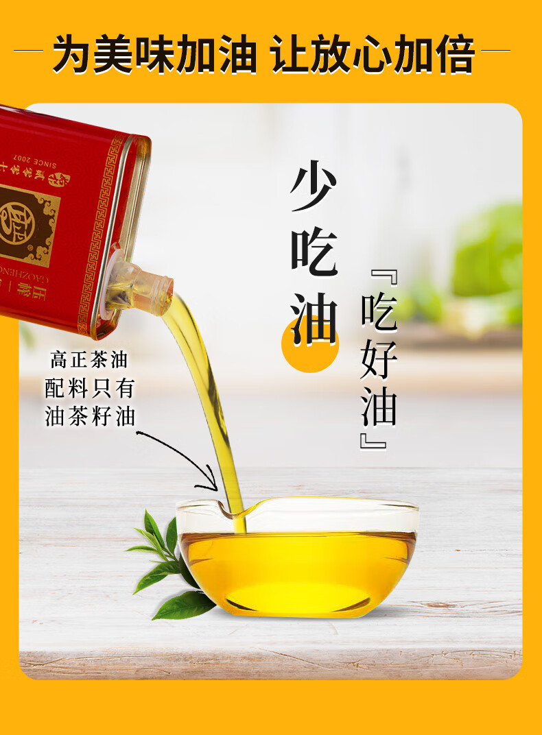 清淡不腻,锁住营养;健康生活 ,选品质茶油;高活烟点,清亮少烟;轻食好油,肠胃无负担