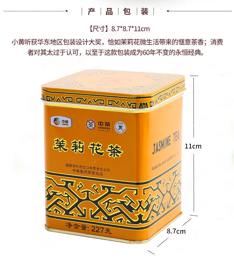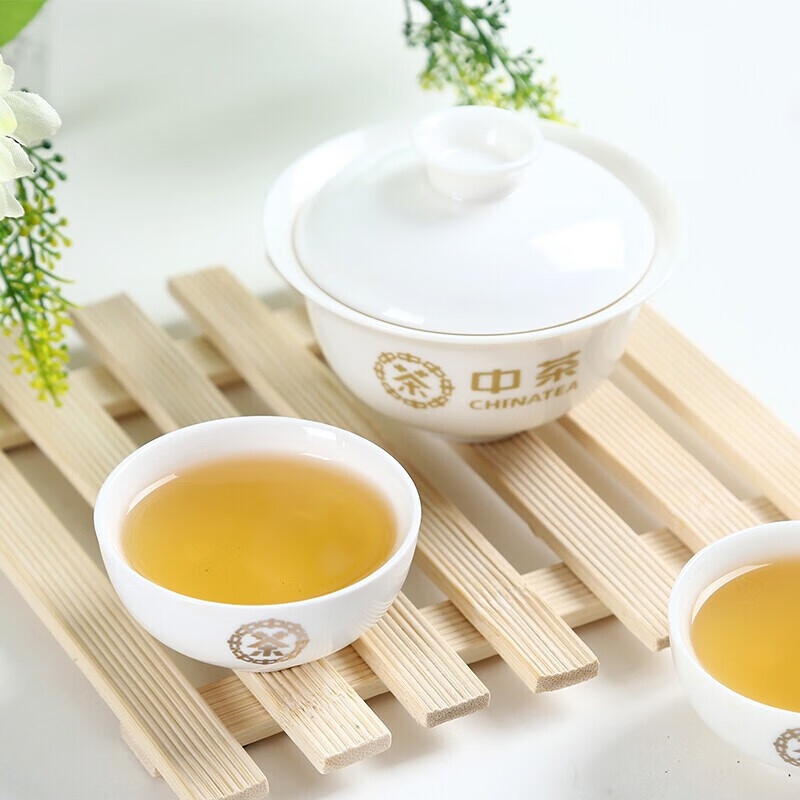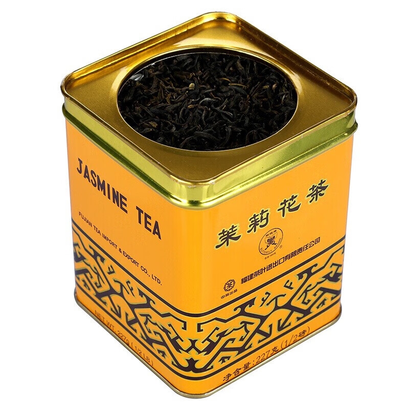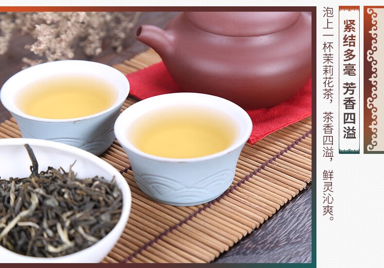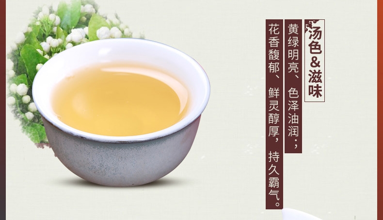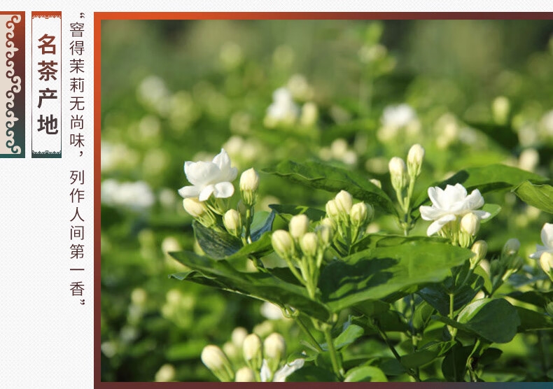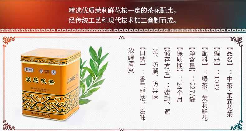 中茶茉莉花茶;一芽一、二叶鲜叶,加工而成烘青绿毛茶,精制成茶坯,;汤色黄绿明亮,叶底匀嫩晶绿,经久耐泡。
