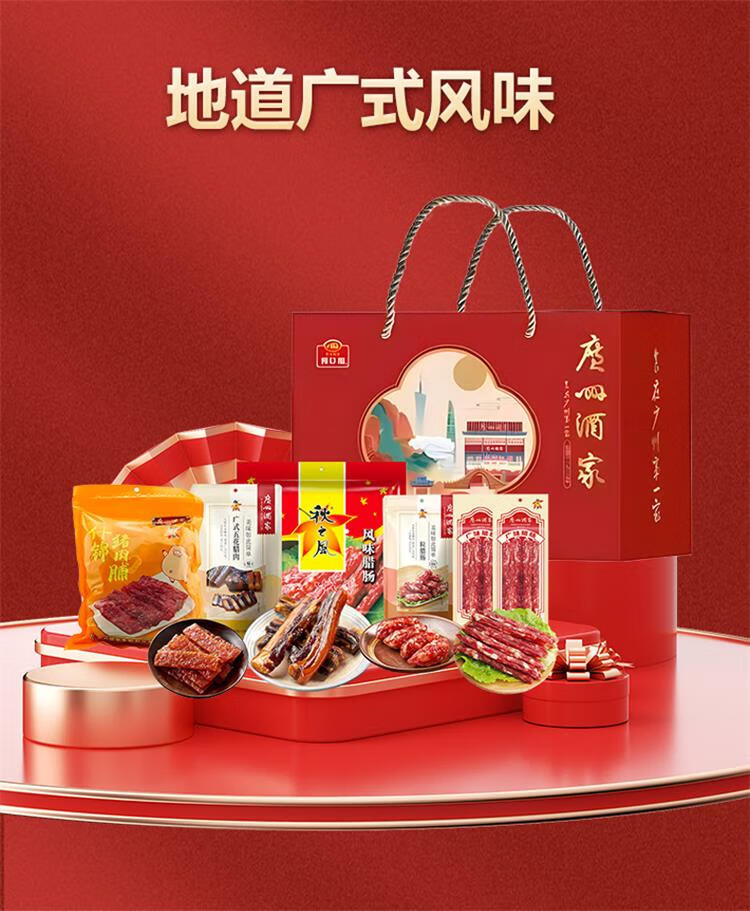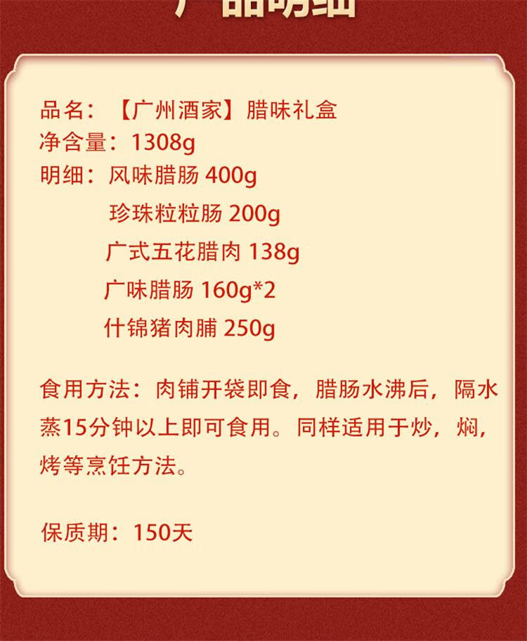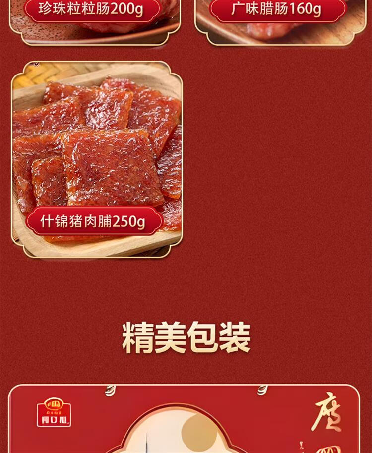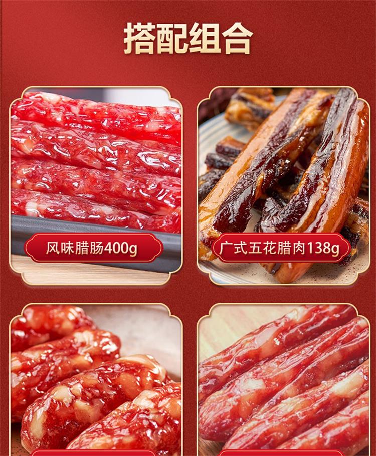 配置:风味腊肠(400g)(营销) 珍珠粒粒肠(200g) 138g广式五花腊肉(袋装) 广味腊肠(160g) 广味腊肠(160g) 什锦猪肉脯(250g)