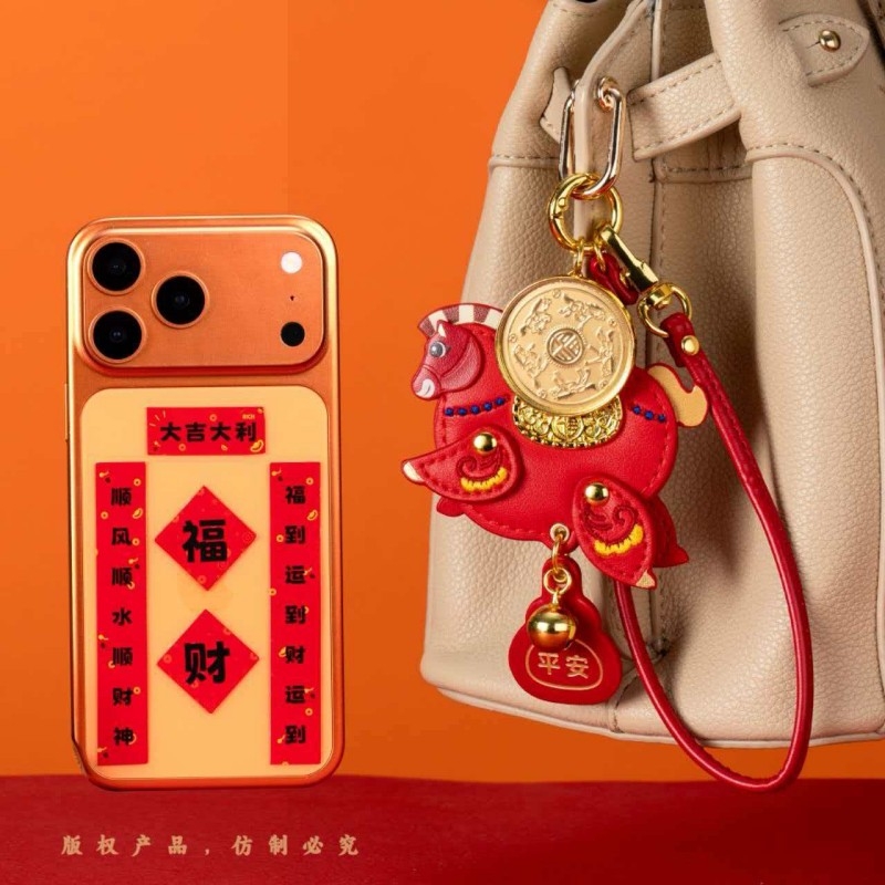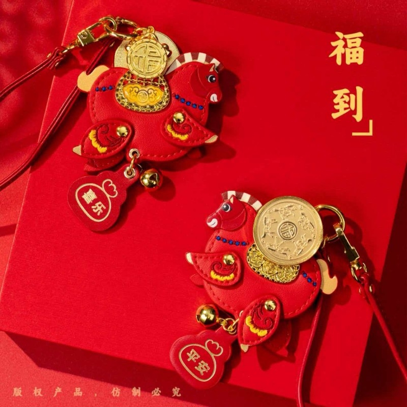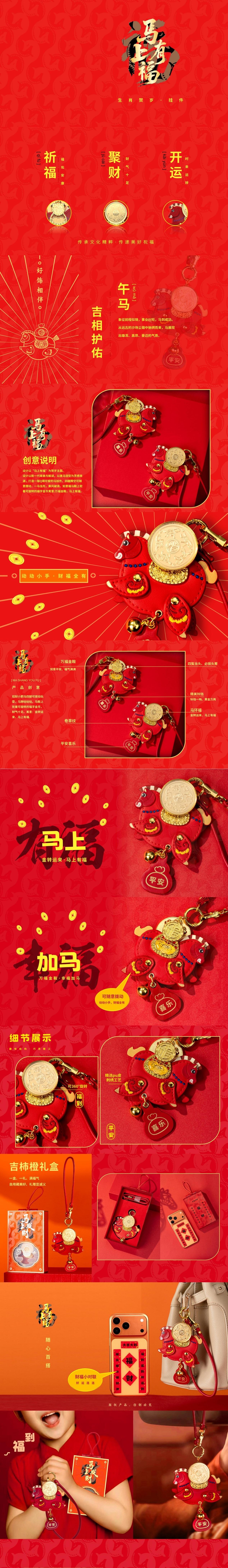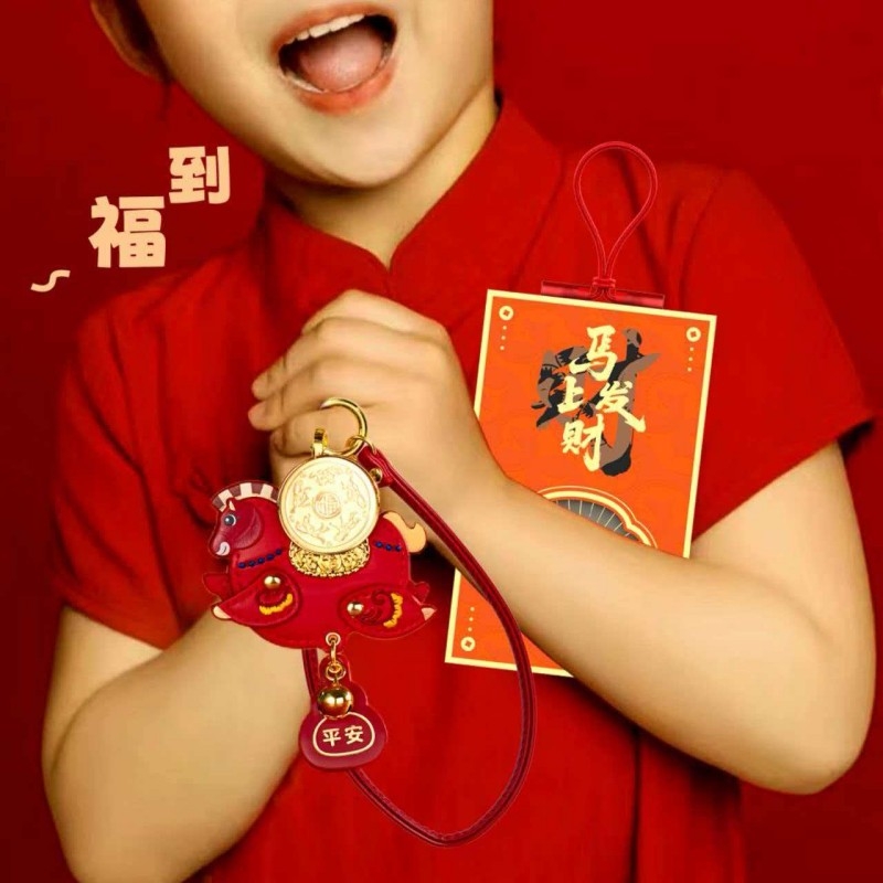 设计以“马上有福”为贺岁主题。设计以新一代审美;以唐马造型为灵感来源,打造一版Q萌可爱的马挂件;四腿腾空可随意摆动,一马当先,乘风破浪;如意福马鞍上驼着可旋转的福字金币寓意:万福金鞍