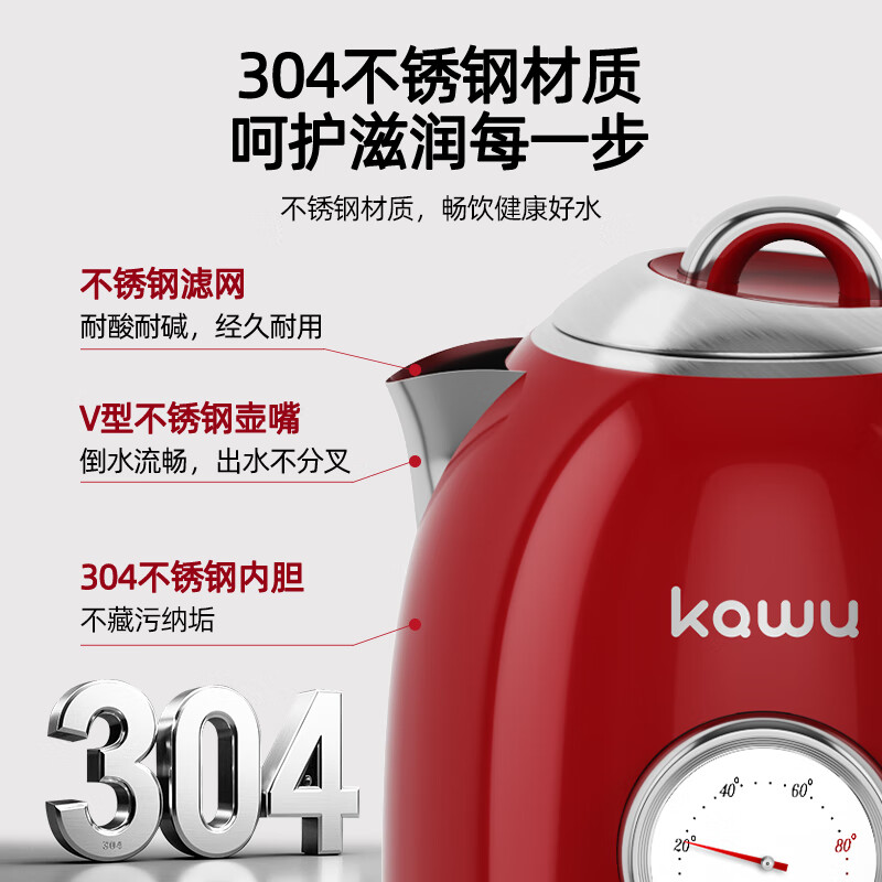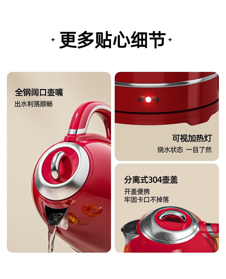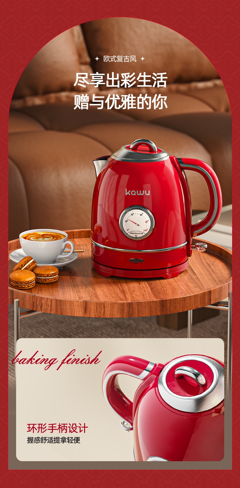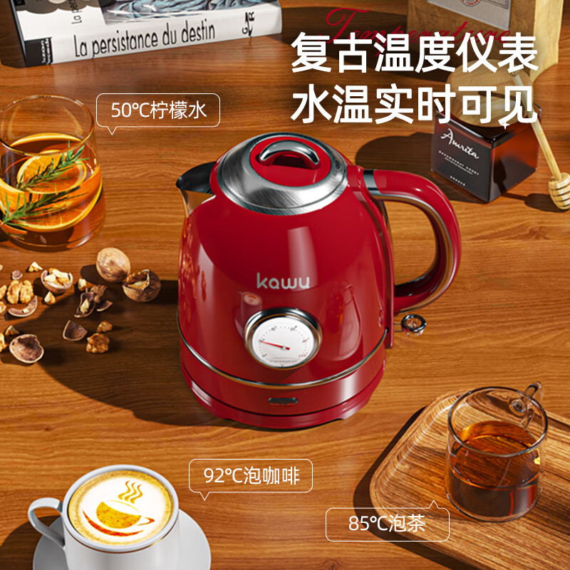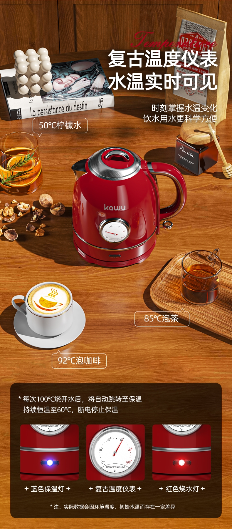 双层防烫设计,使用更放心;可视加热灯,烧水状态一目了然;英式复古温度仪表,烧开自动保温
