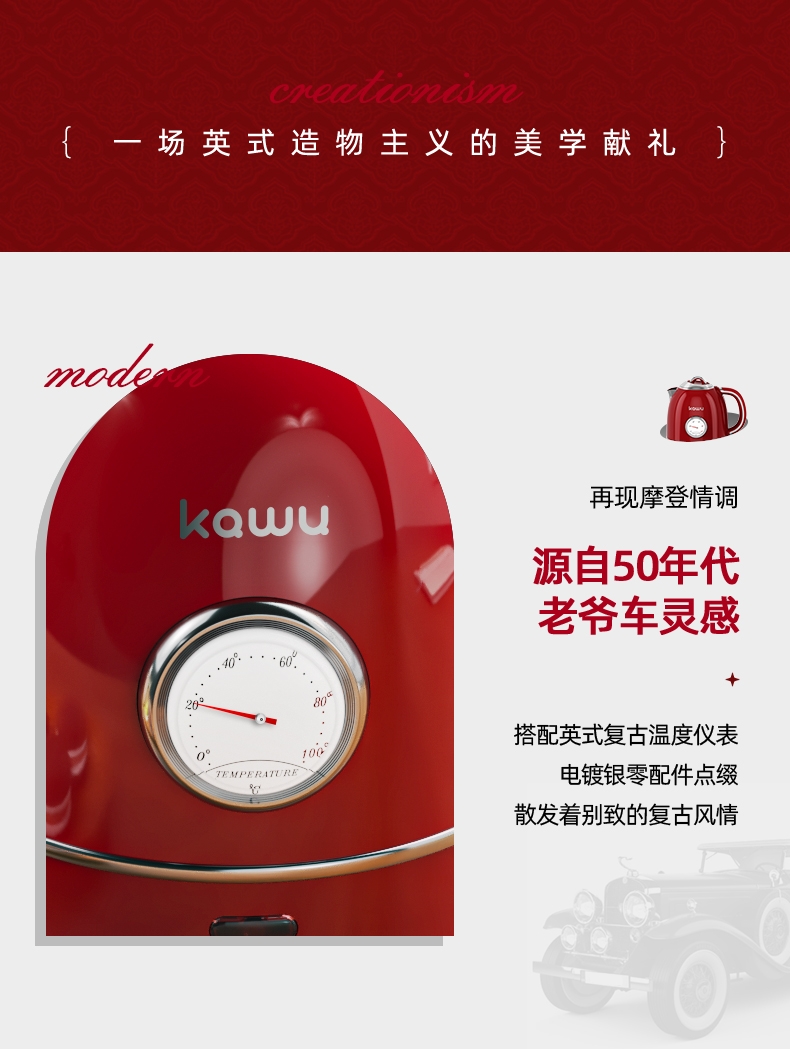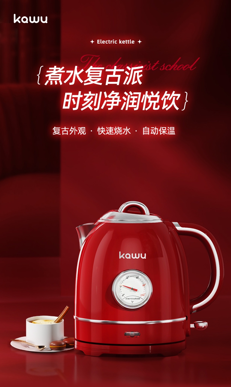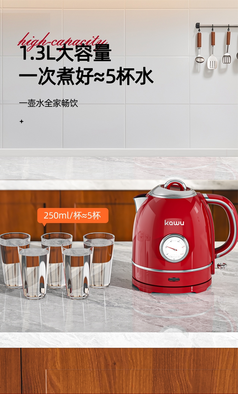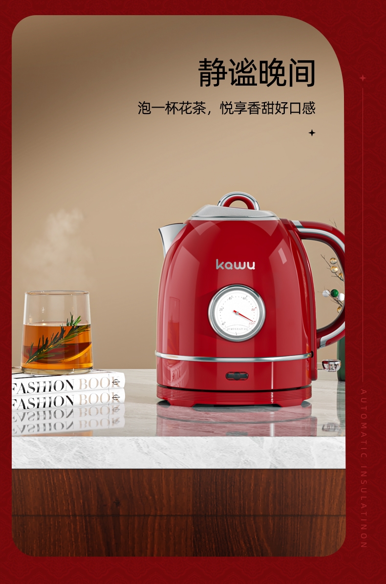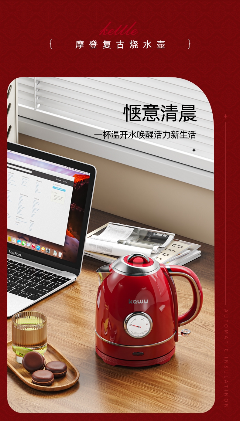 双层防烫设计,使用更放心;可视加热灯,烧水状态一目了然;英式复古温度仪表,烧开自动保温