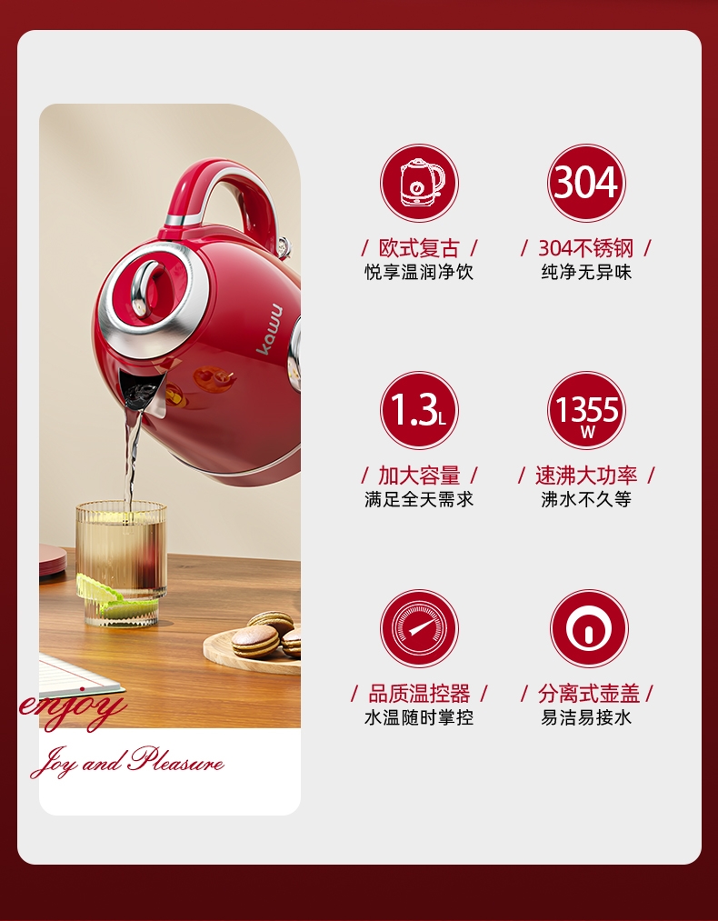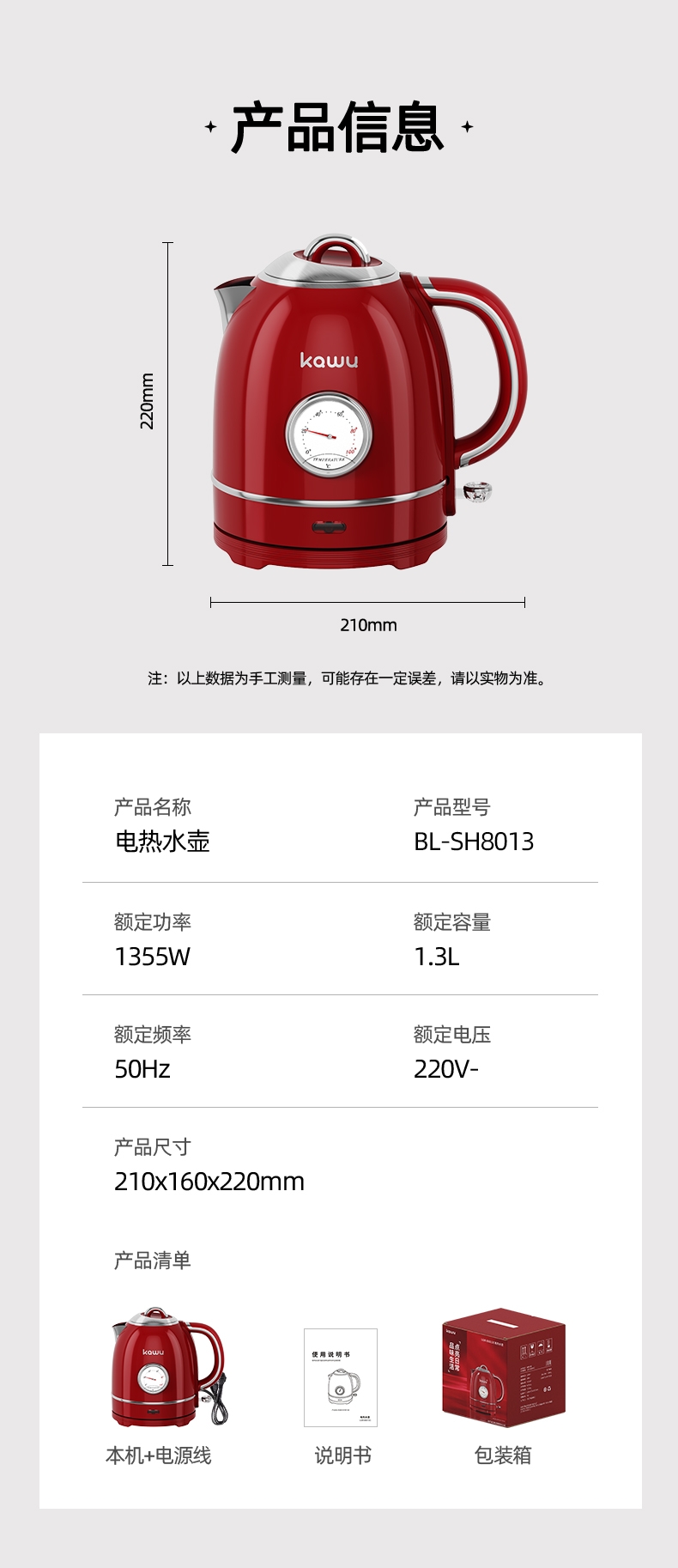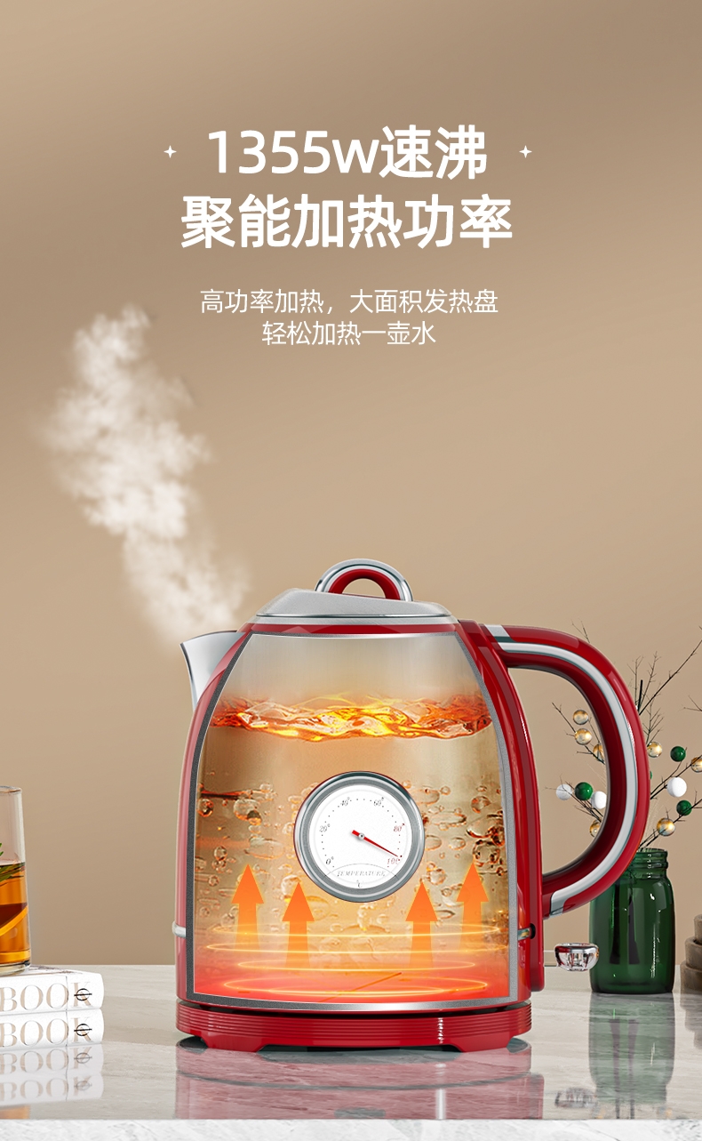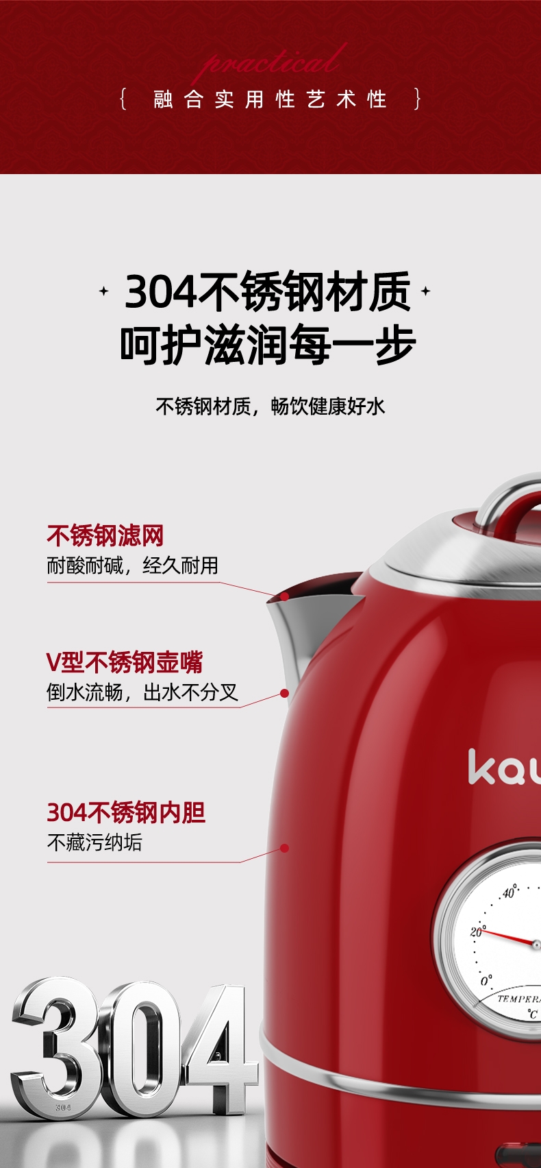 双层防烫设计,使用更放心;可视加热灯,烧水状态一目了然;英式复古温度仪表,烧开自动保温