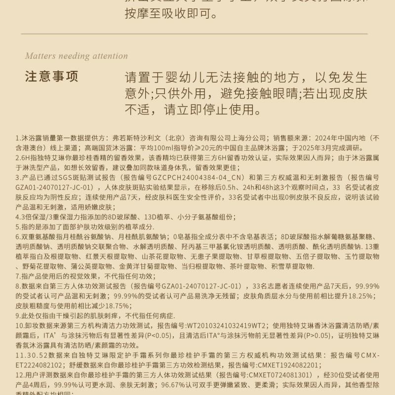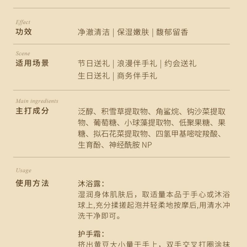 精致沐浴露护手霜伴手礼套装送礼首选;特调香氛香水级沐浴露护手霜自带高级感伪体香;沐浴露透明凝露质地加上双重氨基酸表活泡沫绵密好冲洗